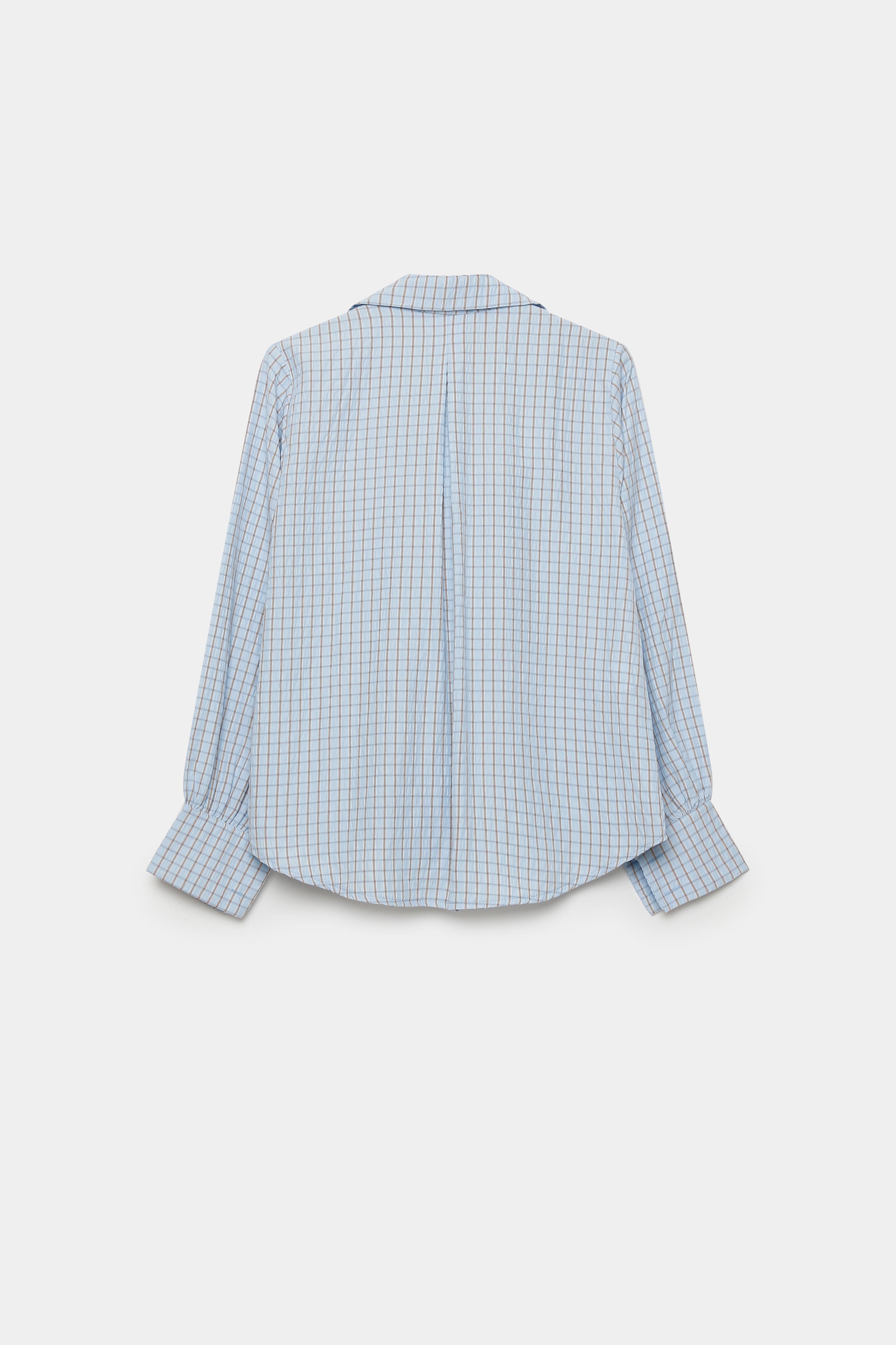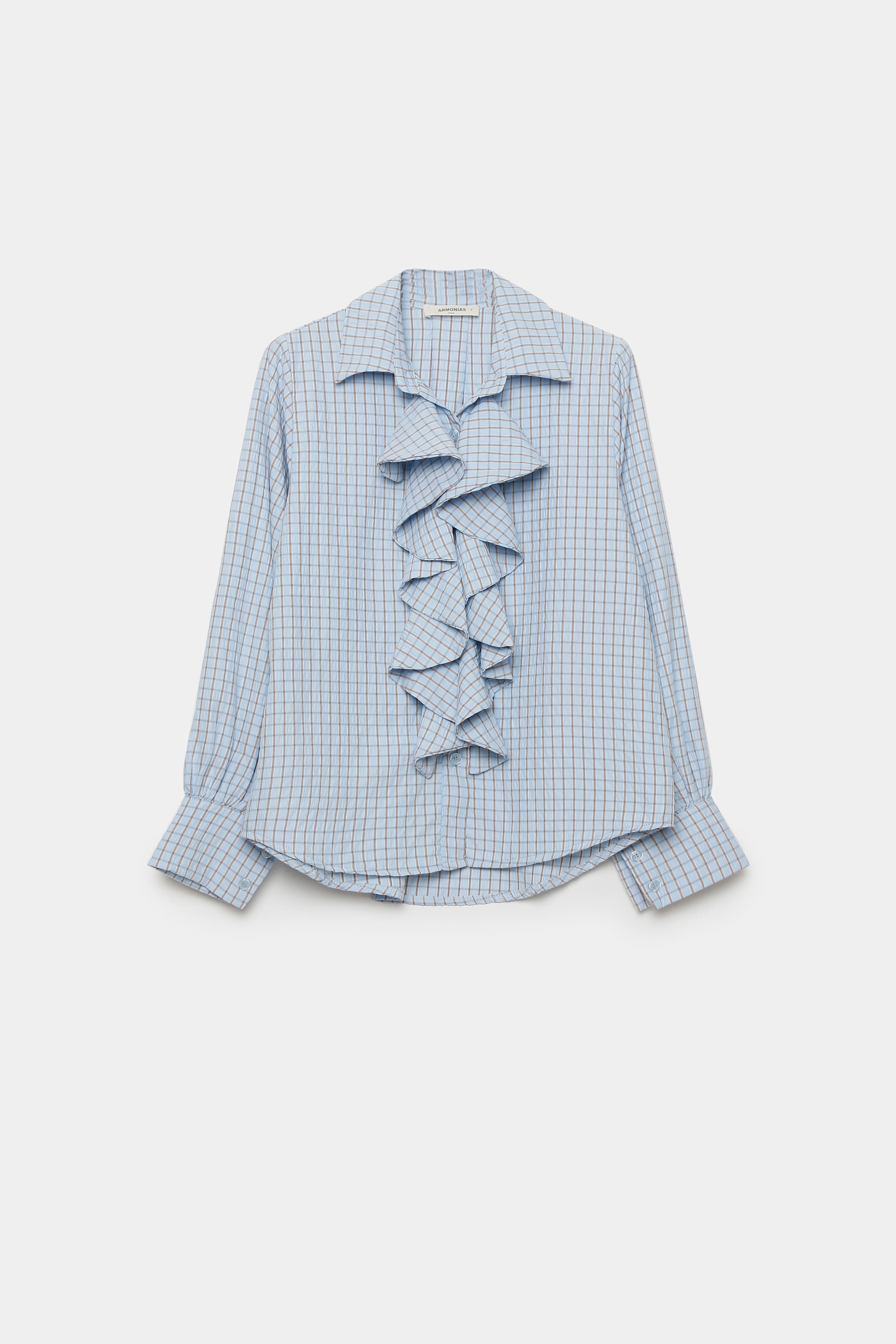 Tejido fluido. Cuello solapa. Manga larga. Detalle volantes. Cierre de botones.