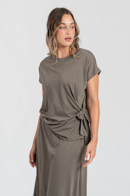 Tejido fluido. Diseño recto. Cuello redondo. Manga sisa. Detalle lazo. Falda tiro alto. Diseño vuelo. Diseño midi. Cintura elástica.