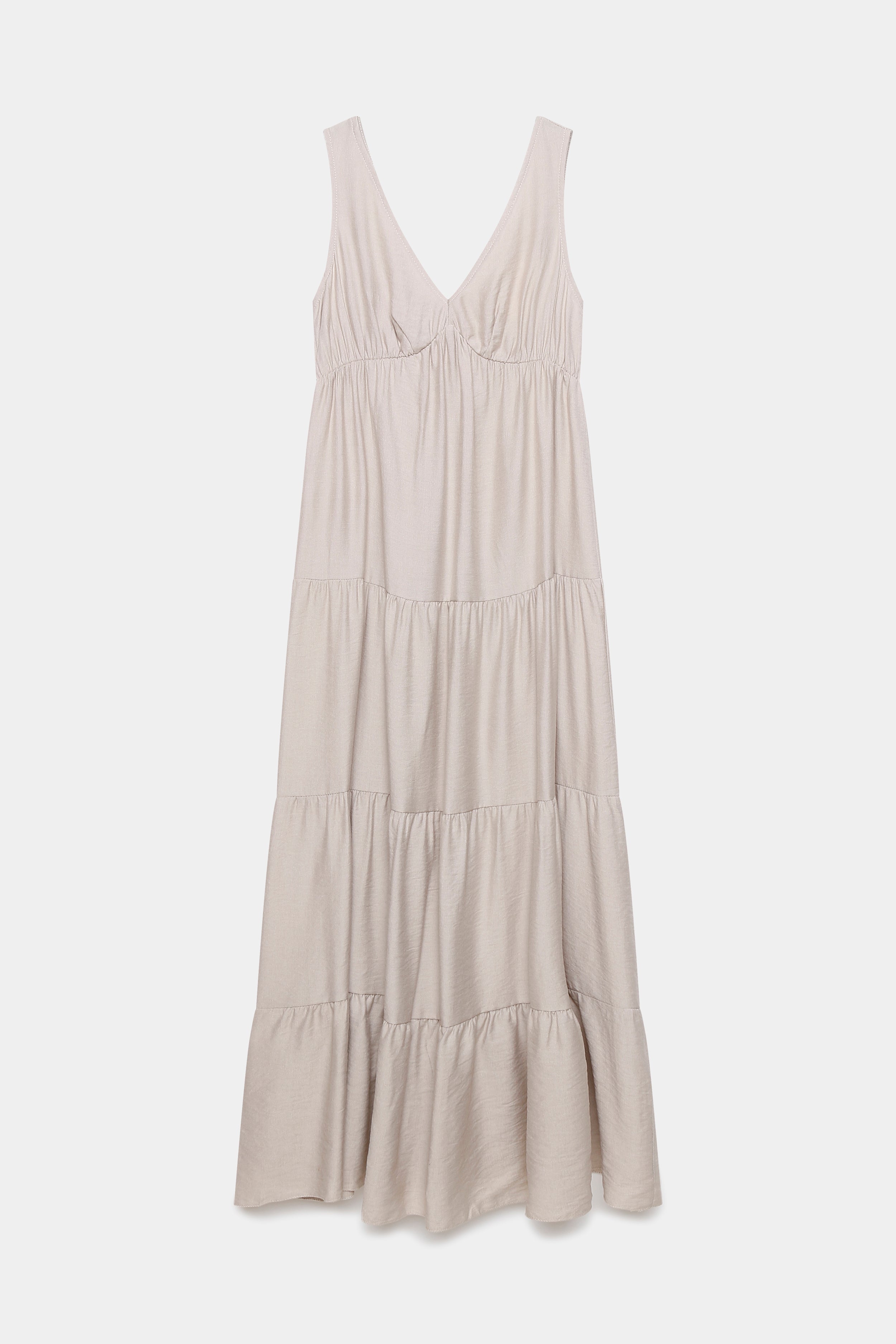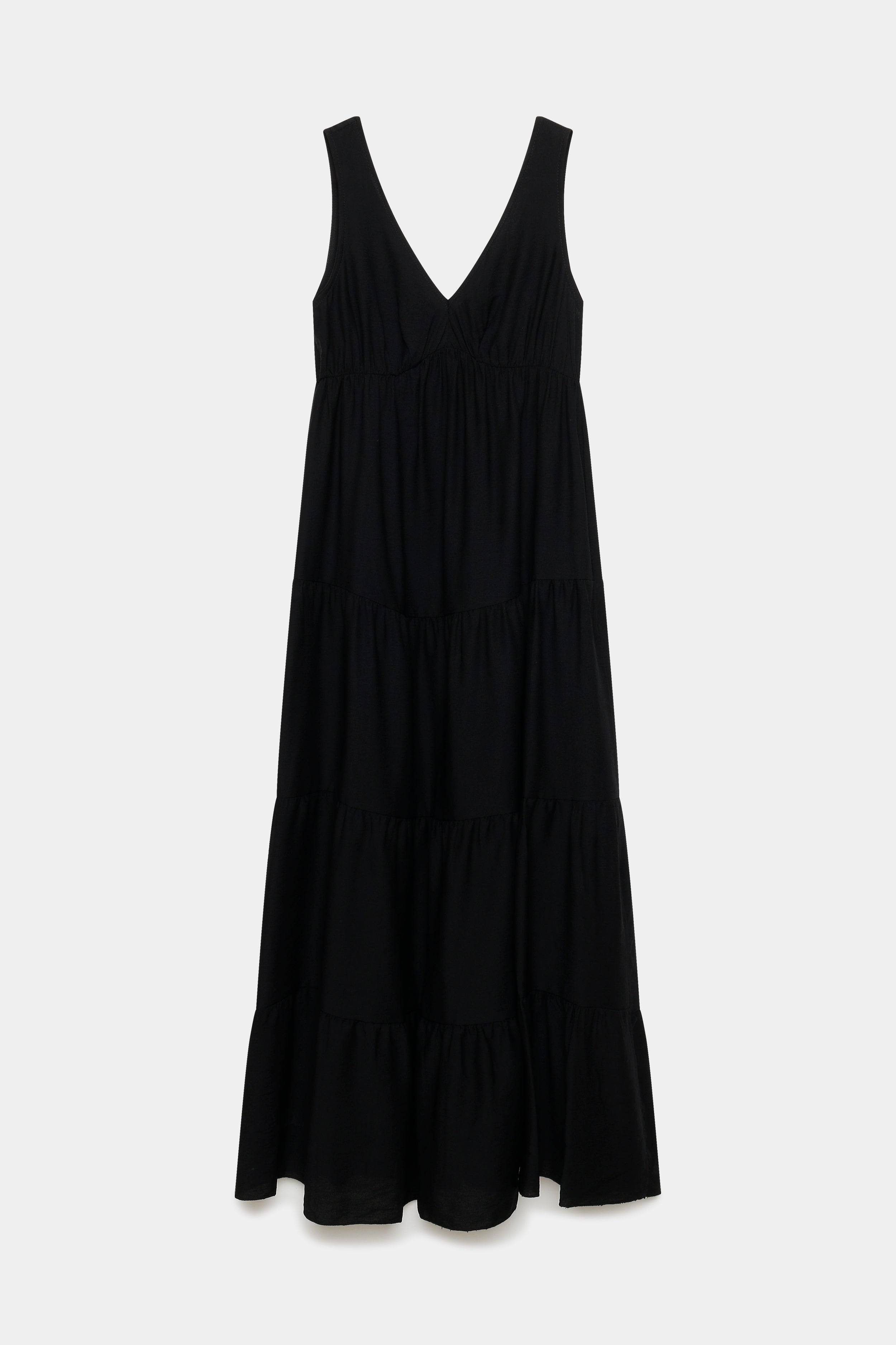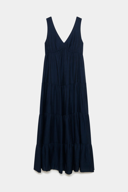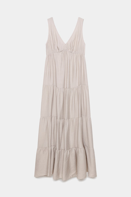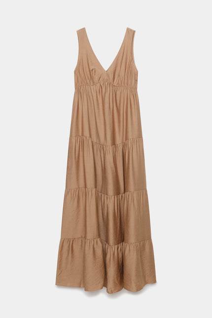 Tejido fluido. Tirantes anchos. Escote pico. Diseño largo.