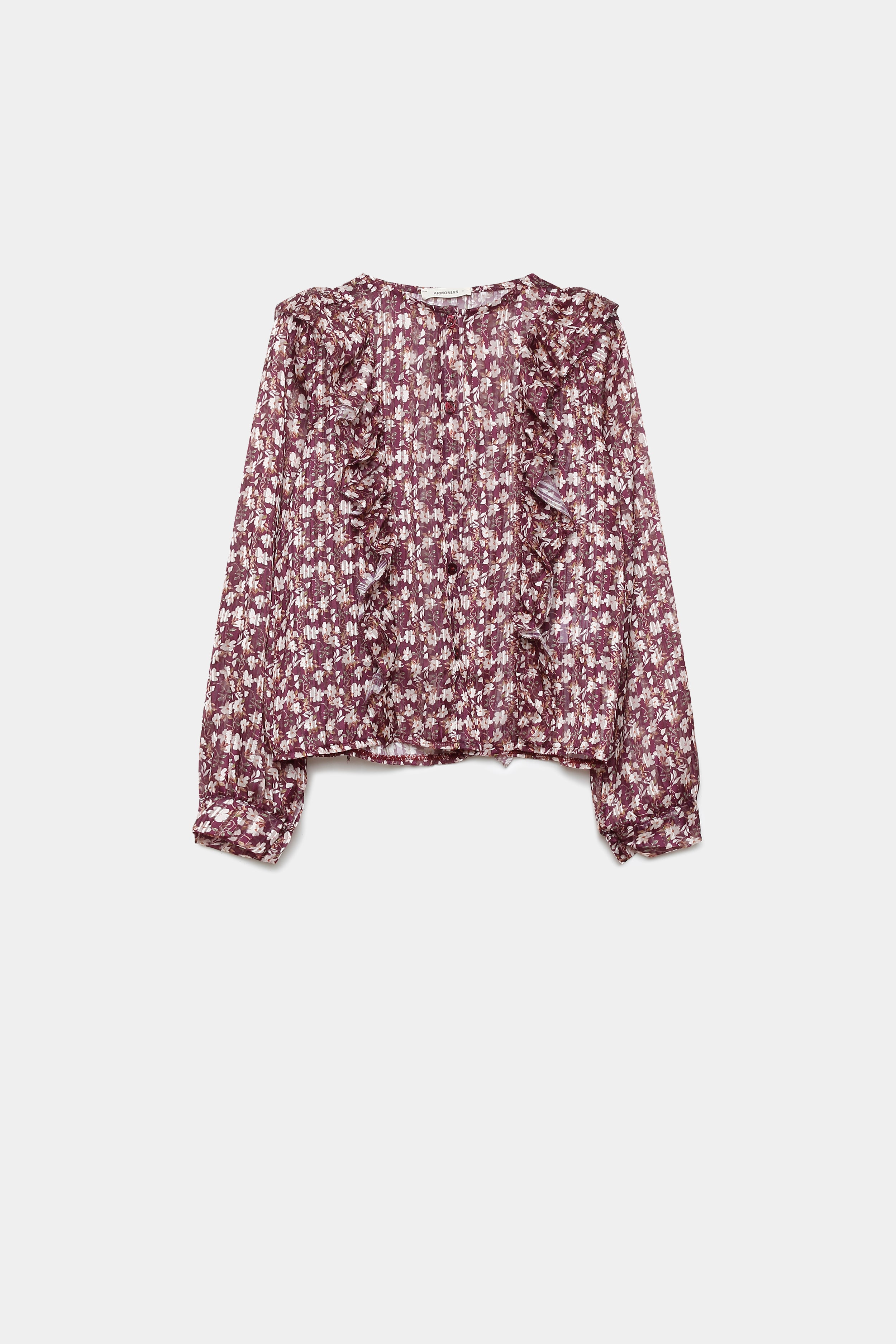 Tejido fluido con brillo. Estampado de flores. Cuello redondo. Manga larga. Detalle volantes. Cierre frontal con botones.