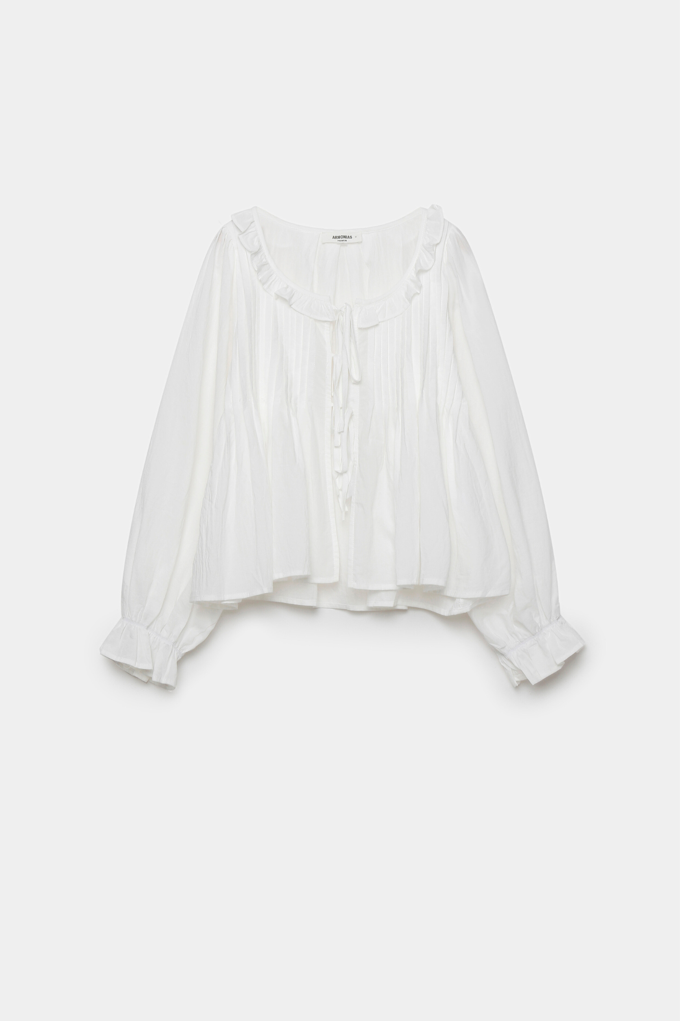 Tejido de algodón. Cuello redondo. Manga larga. Diseño amplio. Cierre de lazadas.