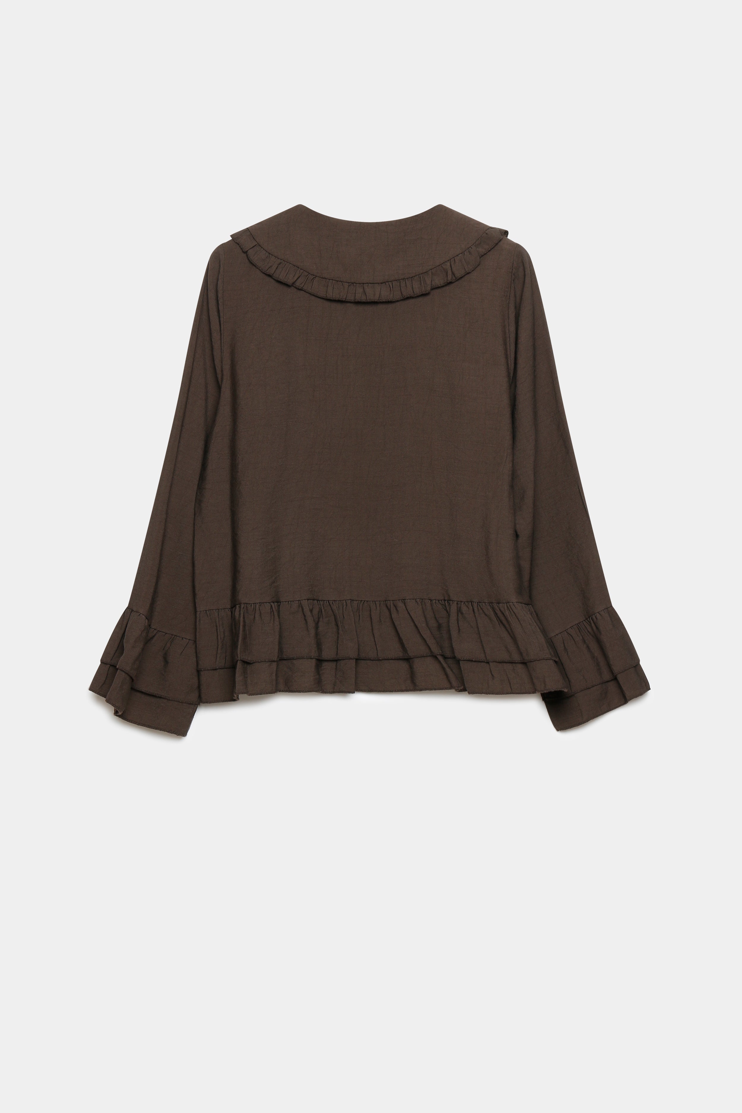 Tejido fluido. Cuello bobo. Manga larga. Cierre botones.