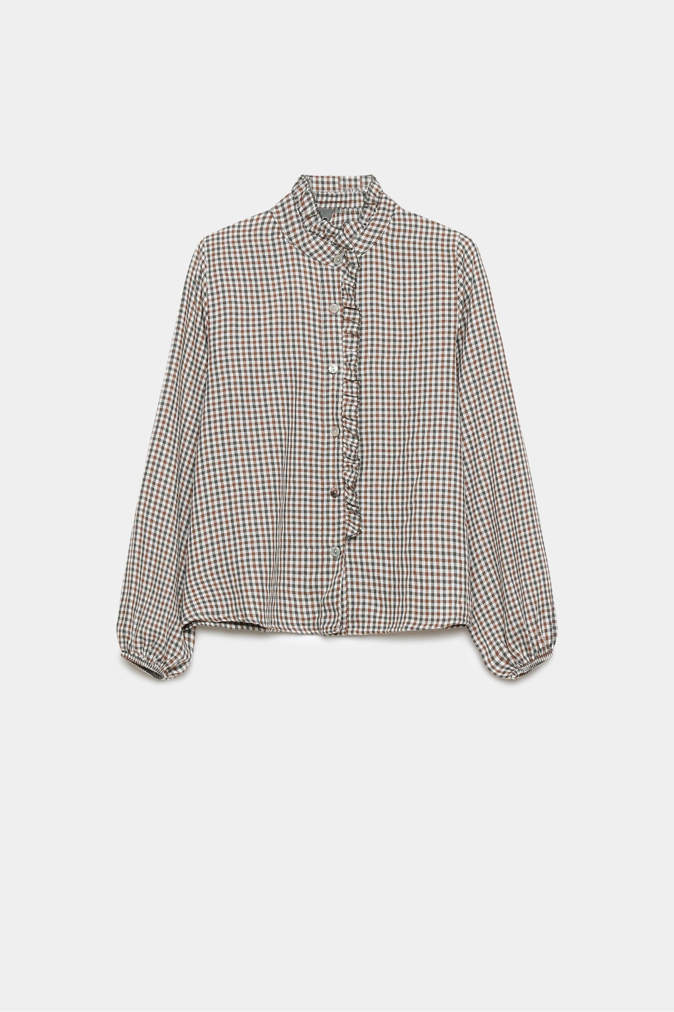 Estampado cuadros. Cuello subido. Cierre botones. Manga larga.