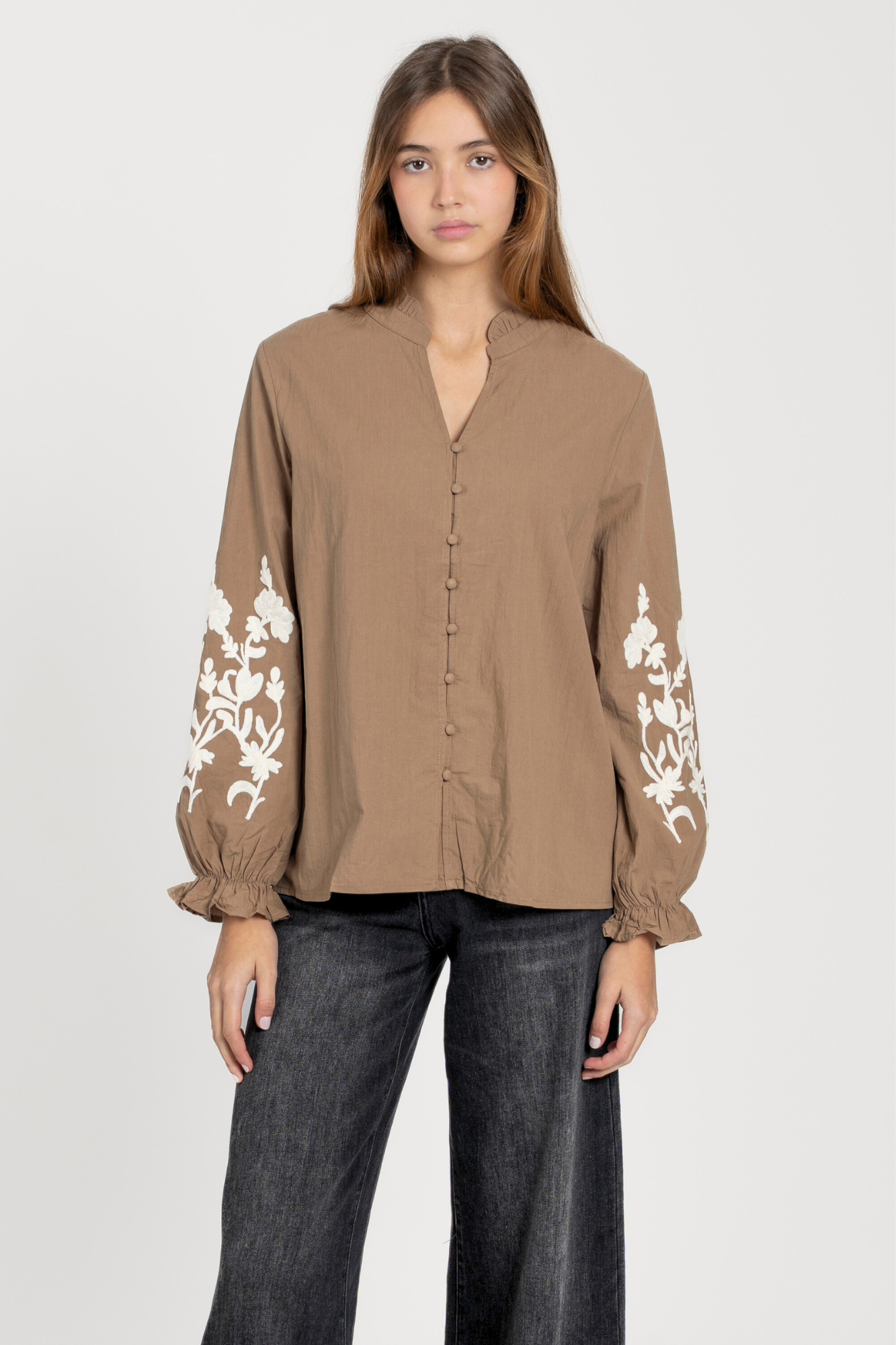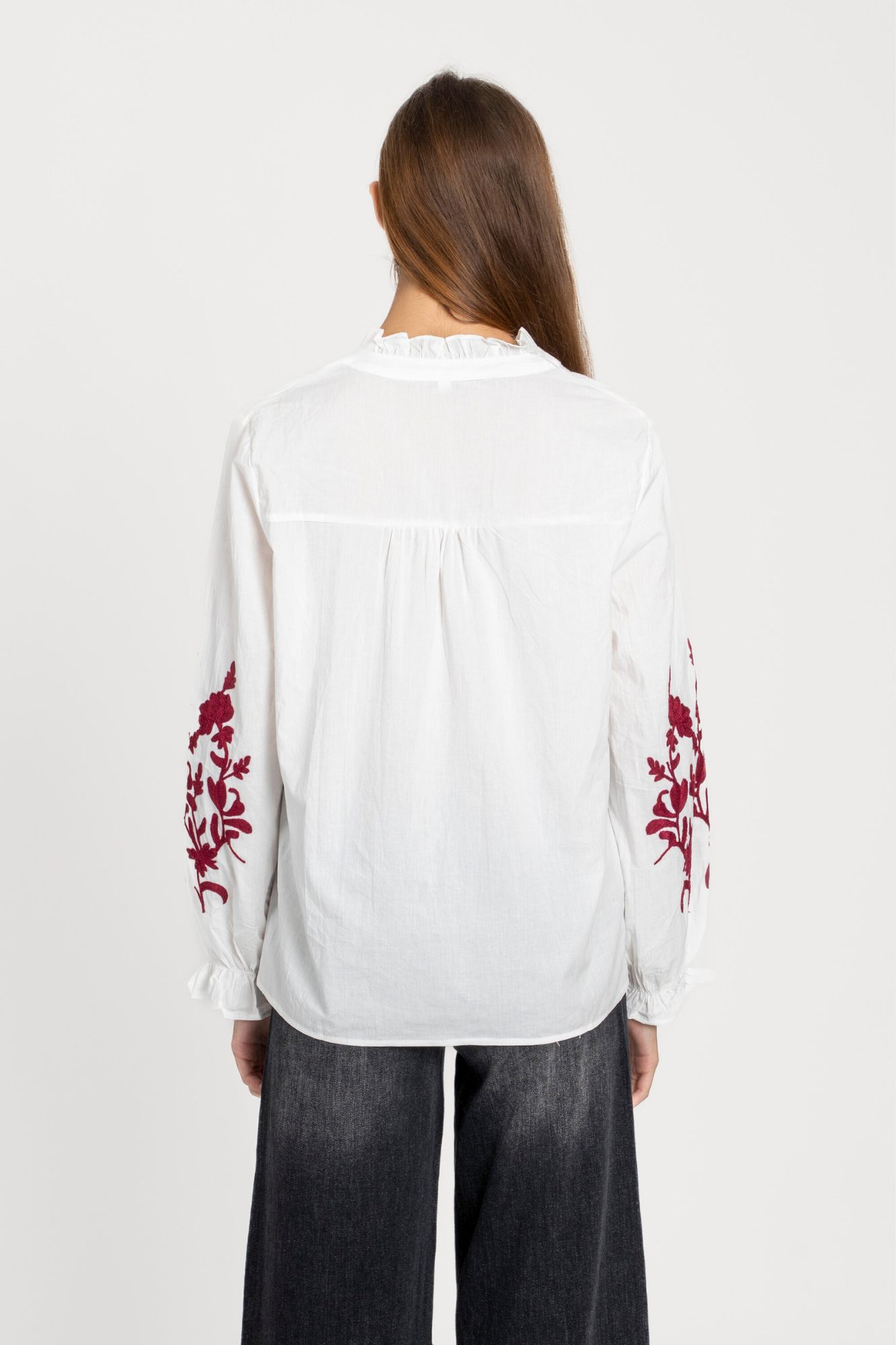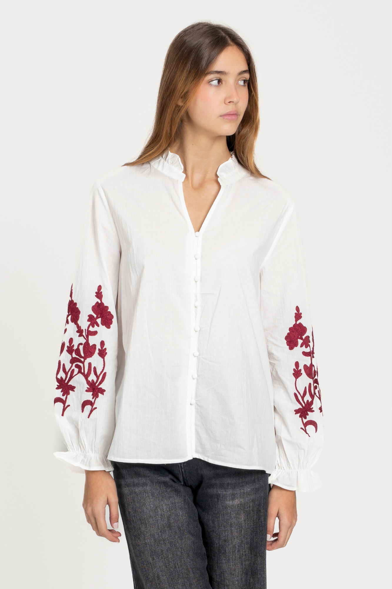 Tejido de algodón. Cuello redondo subido. Manga larga. Detalle de bordados. Cierre con botones. Altura modelo 180 cm. Talla M.