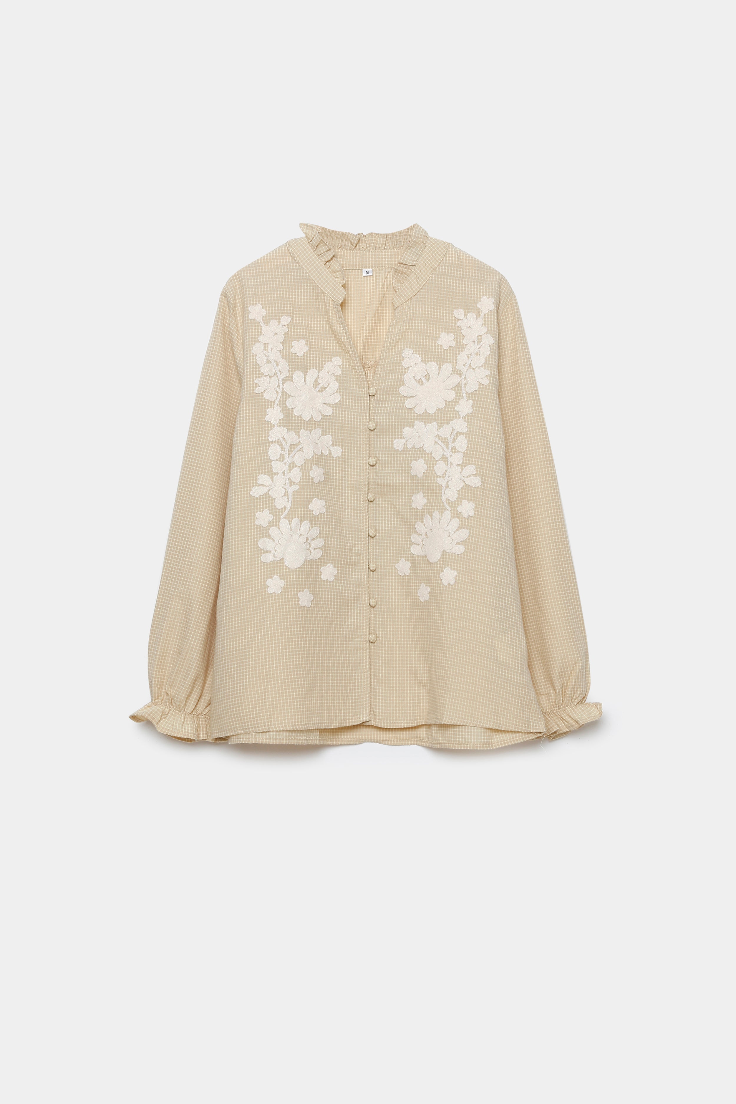 Tejido de algodón. Estampado cuadros. Cuello redondo. Manga larga. Cierre de botones. Detalle bordados.