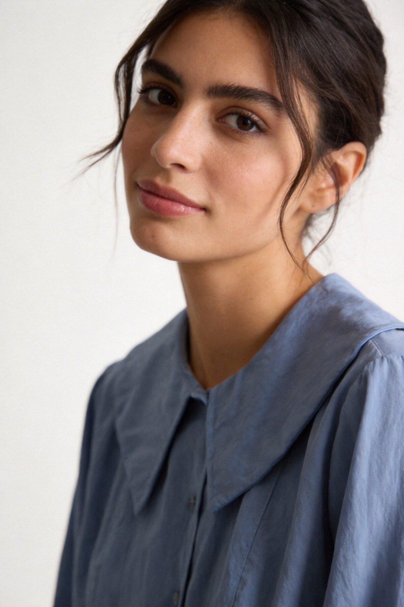 Tejido fluido. Cuello bobo. Cierre con botones. Manga larga.