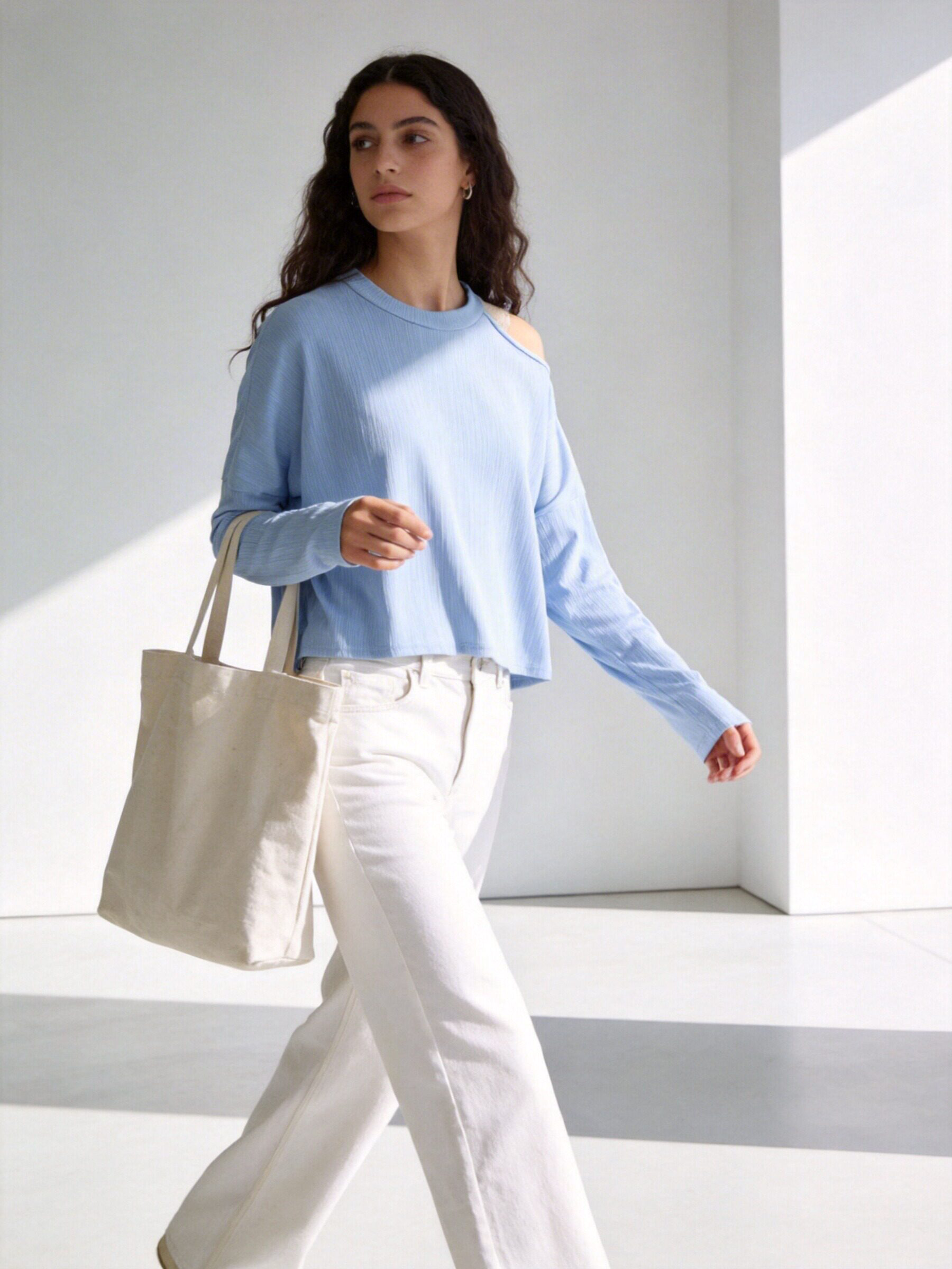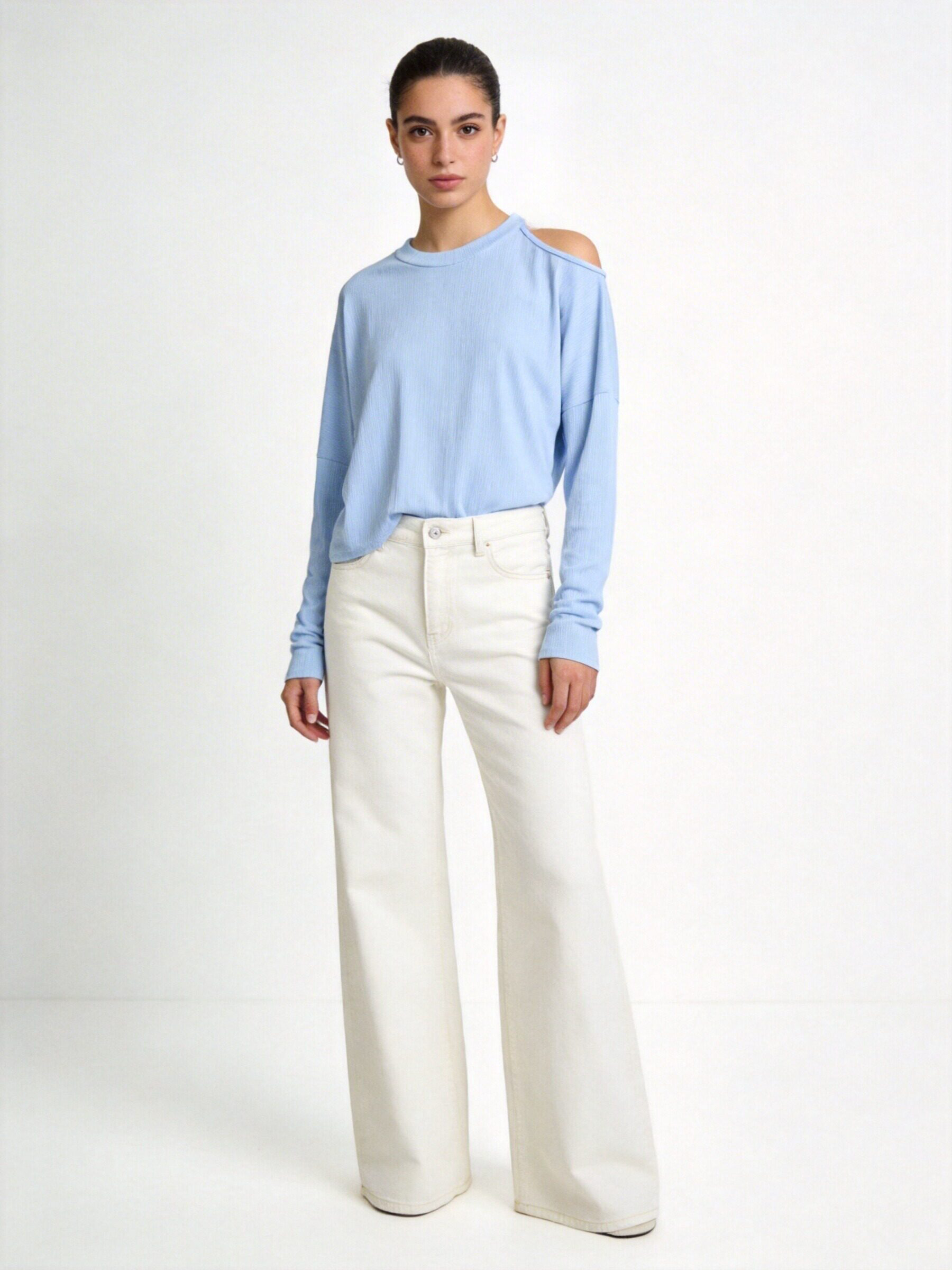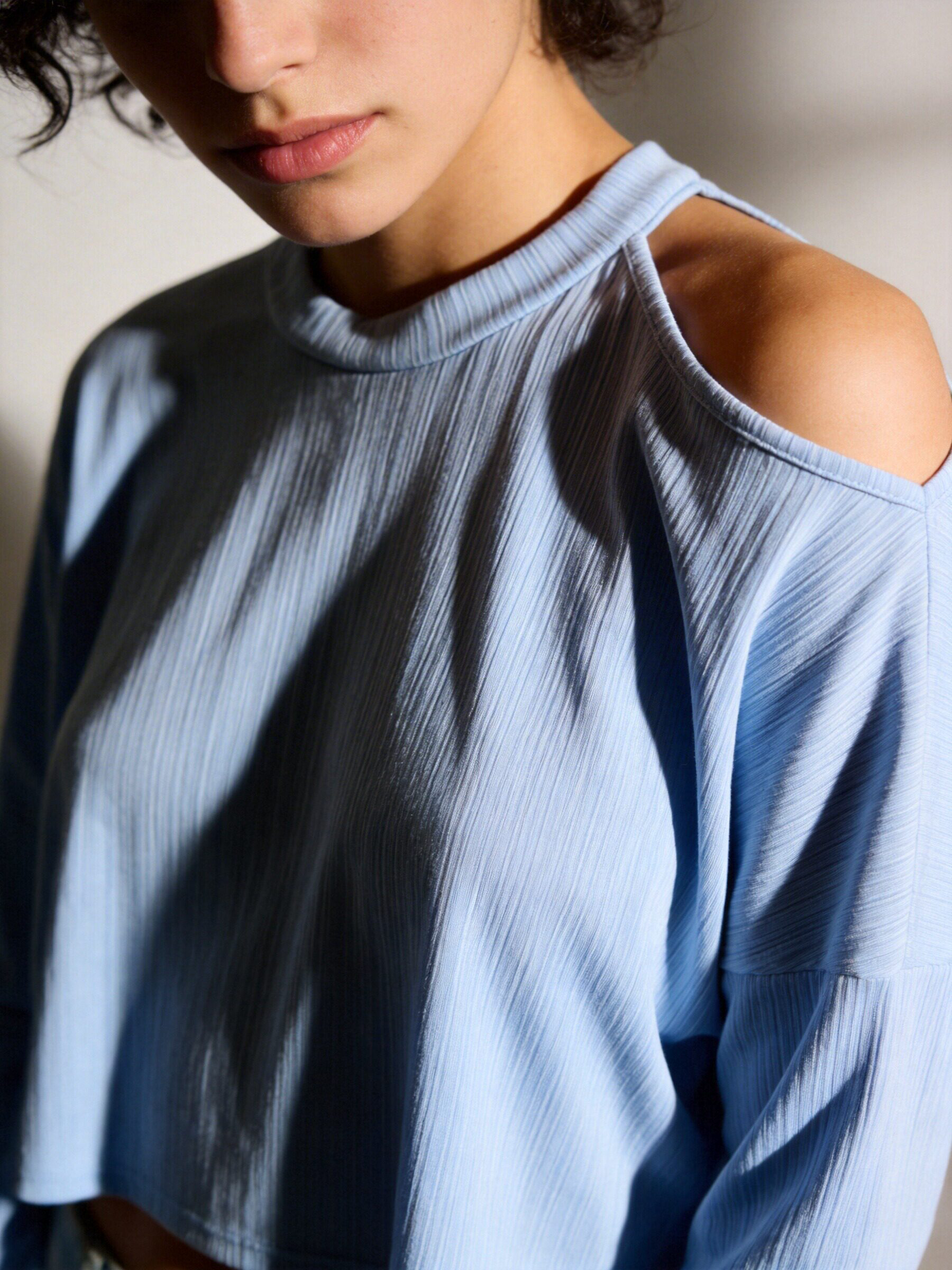 Tejido de canalé. Tejido elástico. Diseño recto. Cuello redondo. Manga larga. Hombros cut out.