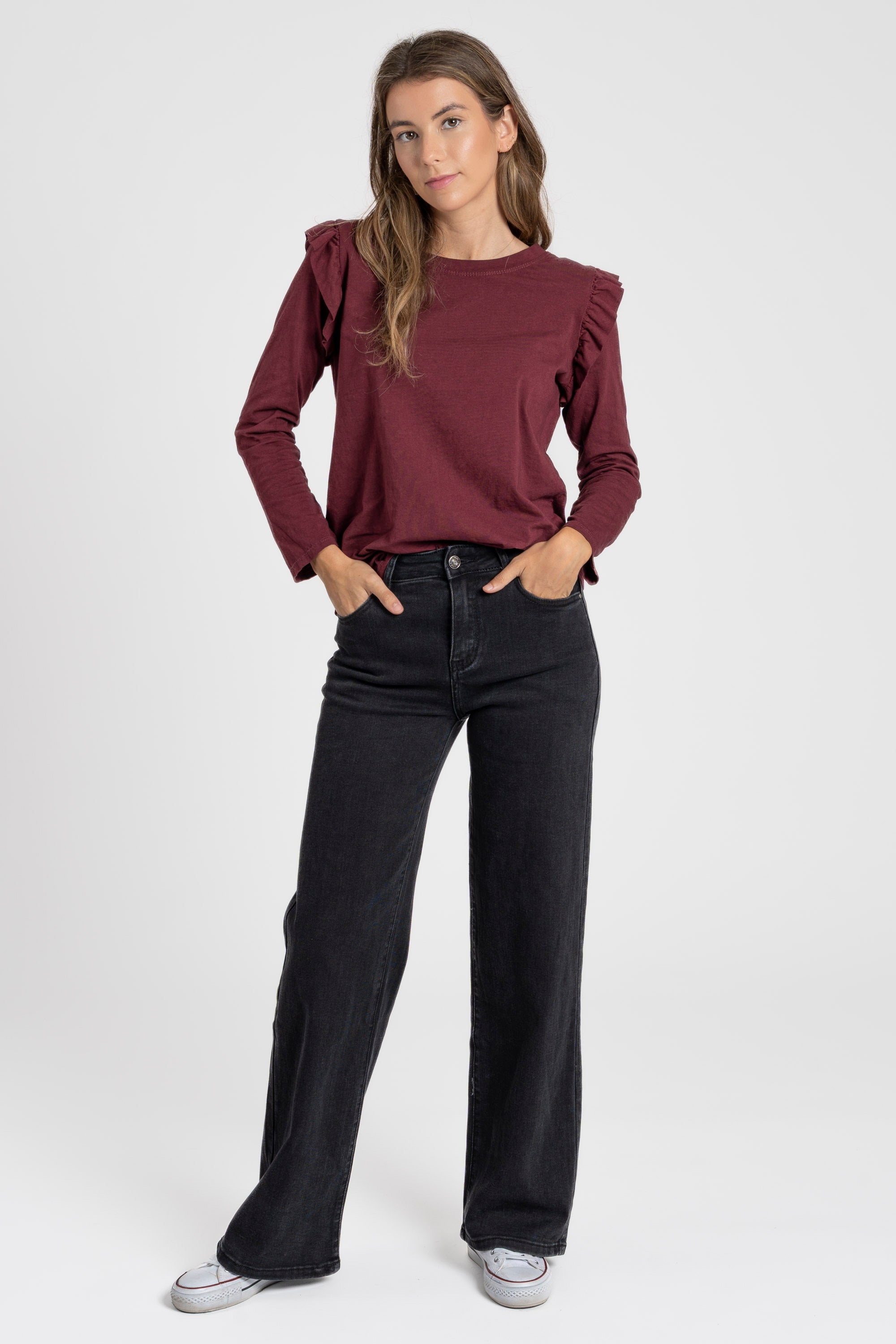 Tejido de algodón. Cuello redondo. Manga larga. Detalle volantes.