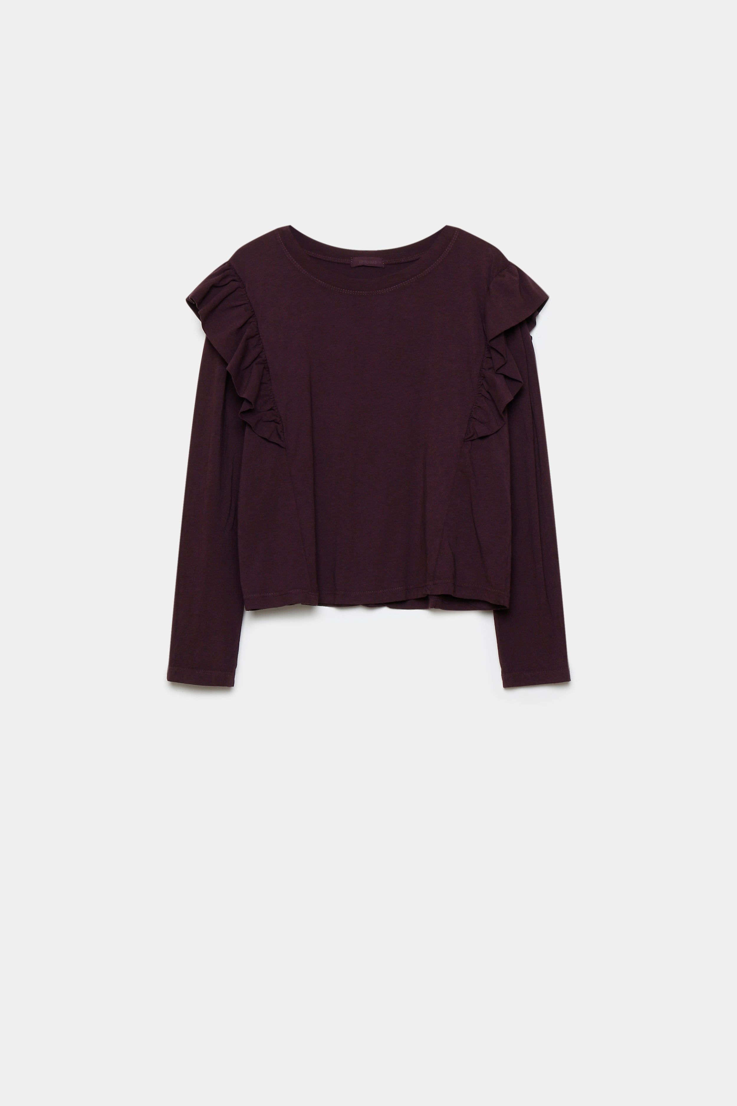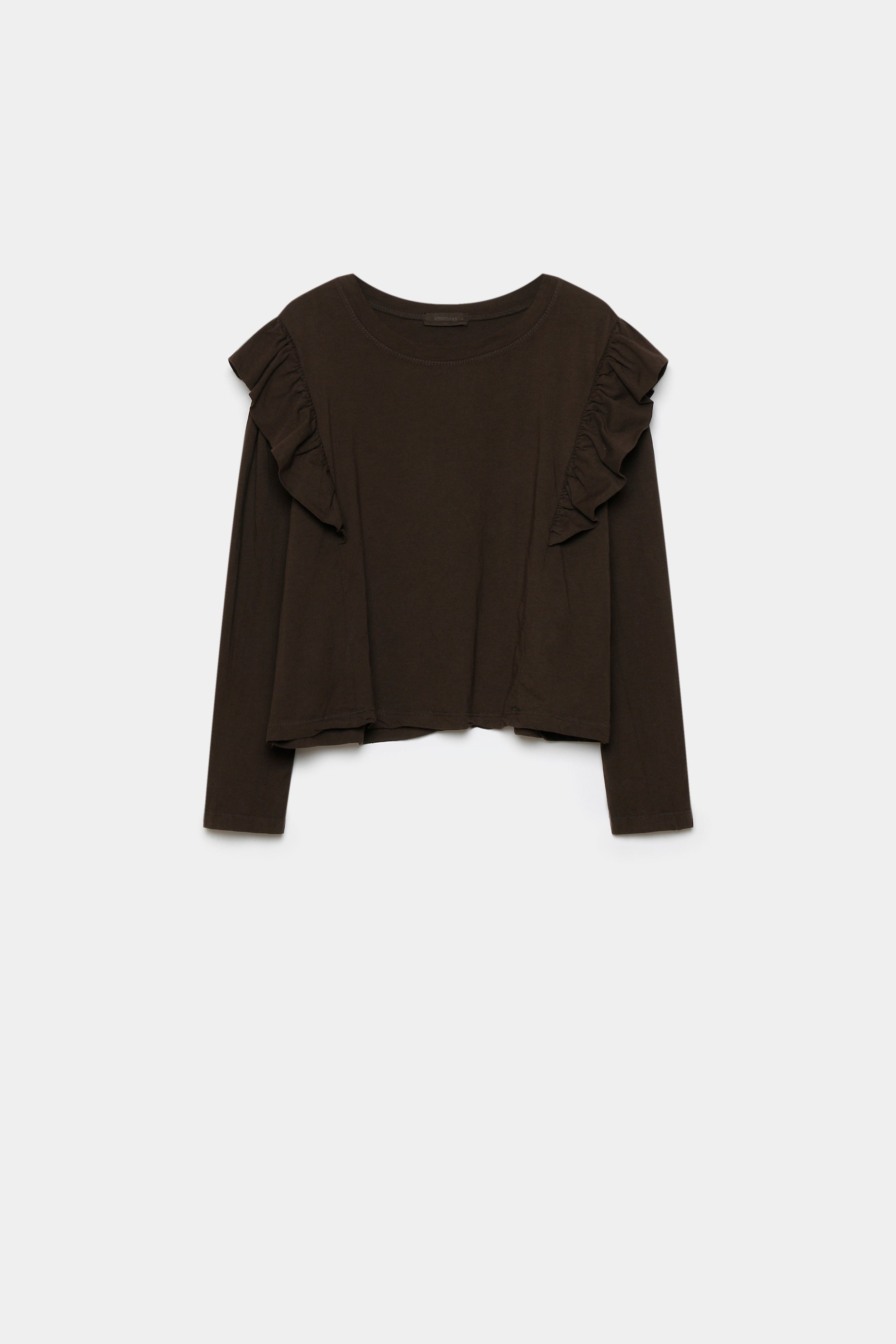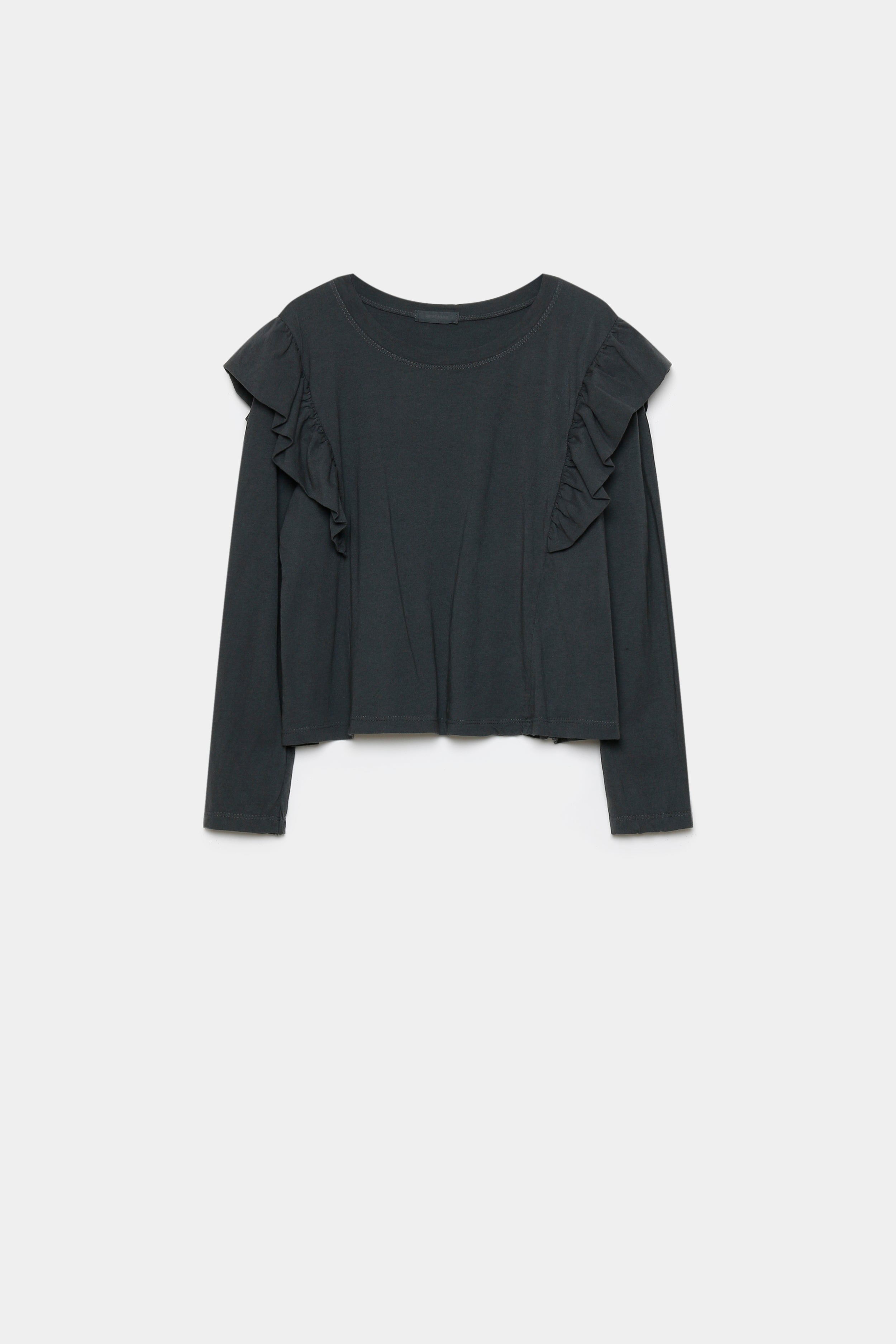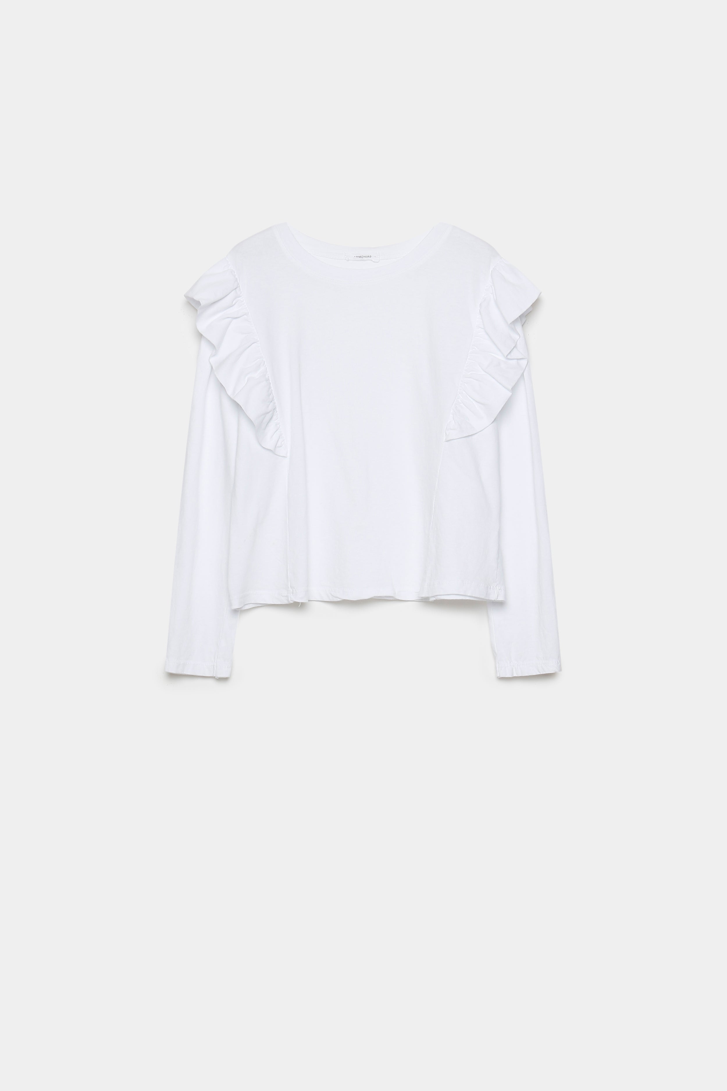 Tejido de algodón. Cuello redondo. Manga larga. Detalle volantes.