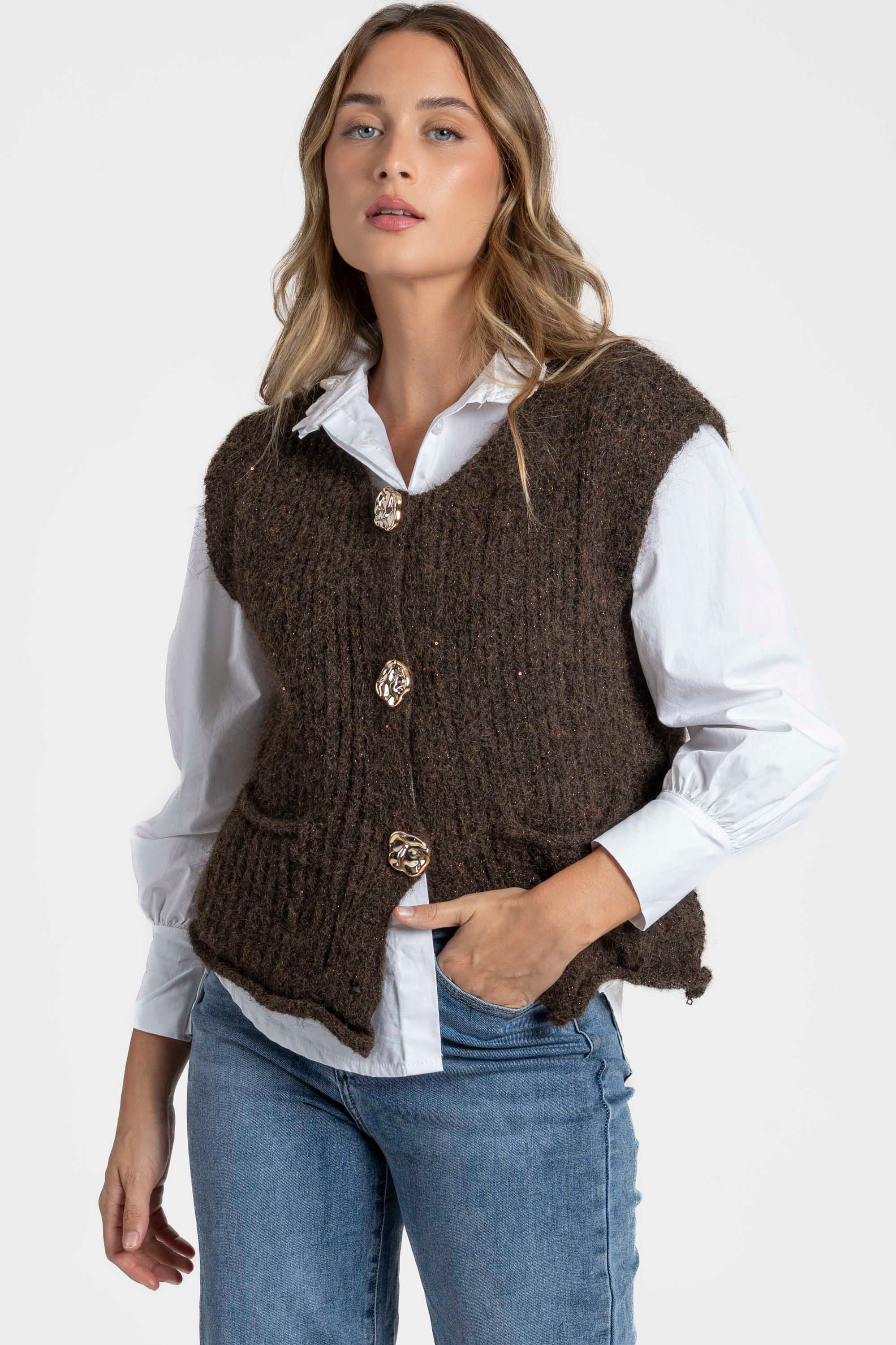 Tejido punto con brillo. Cuello redondo. Manga sisa. Cierre de botones metálicos. Bolsillos frontales.