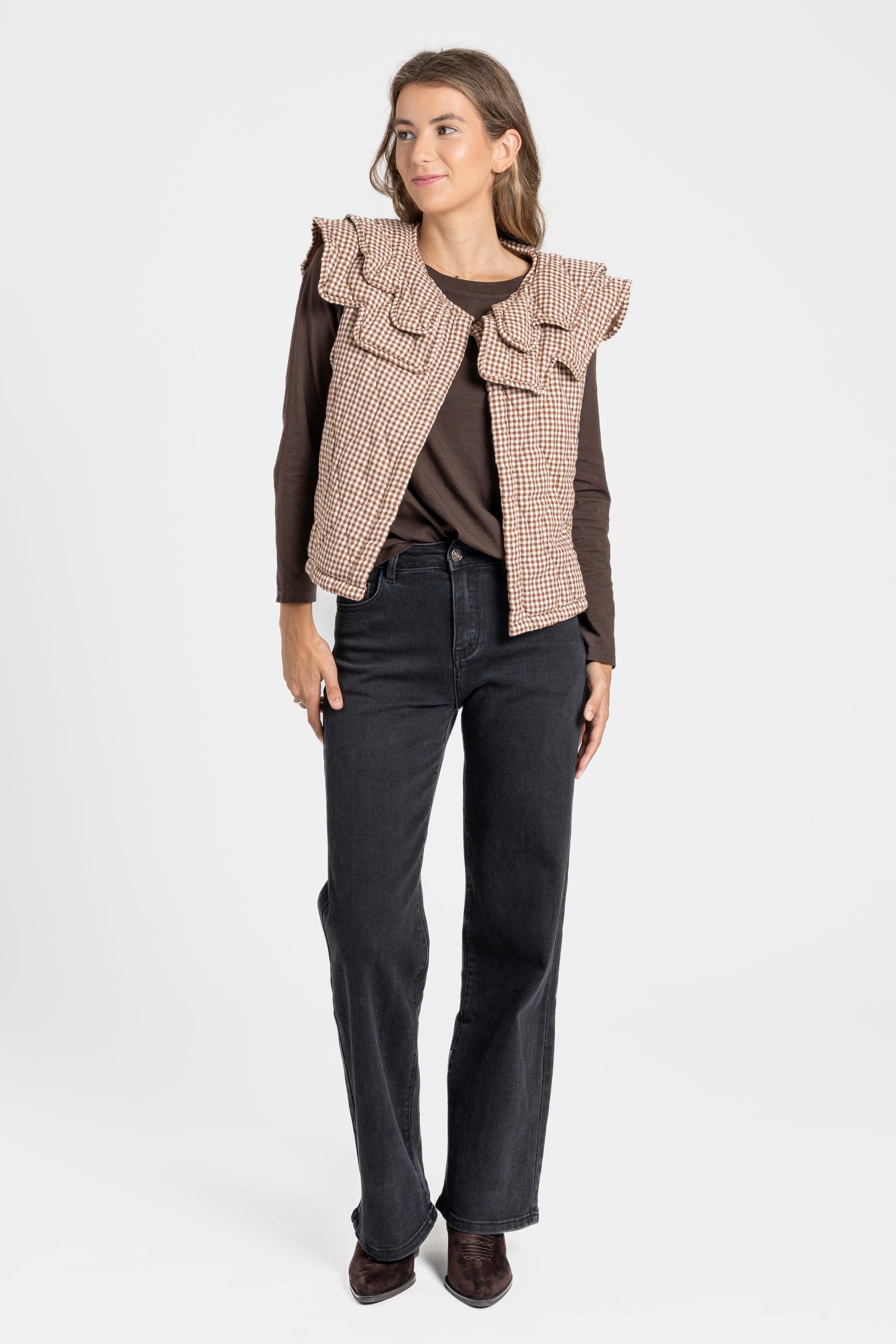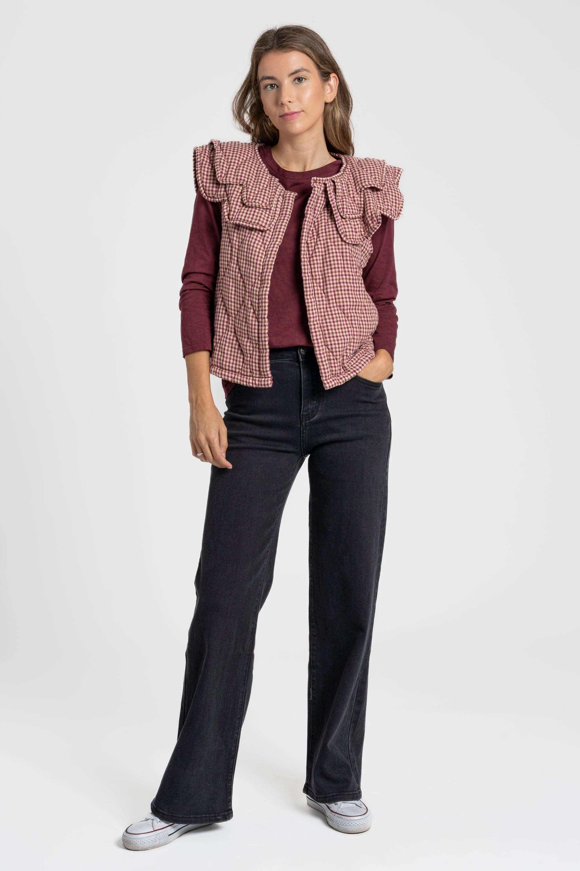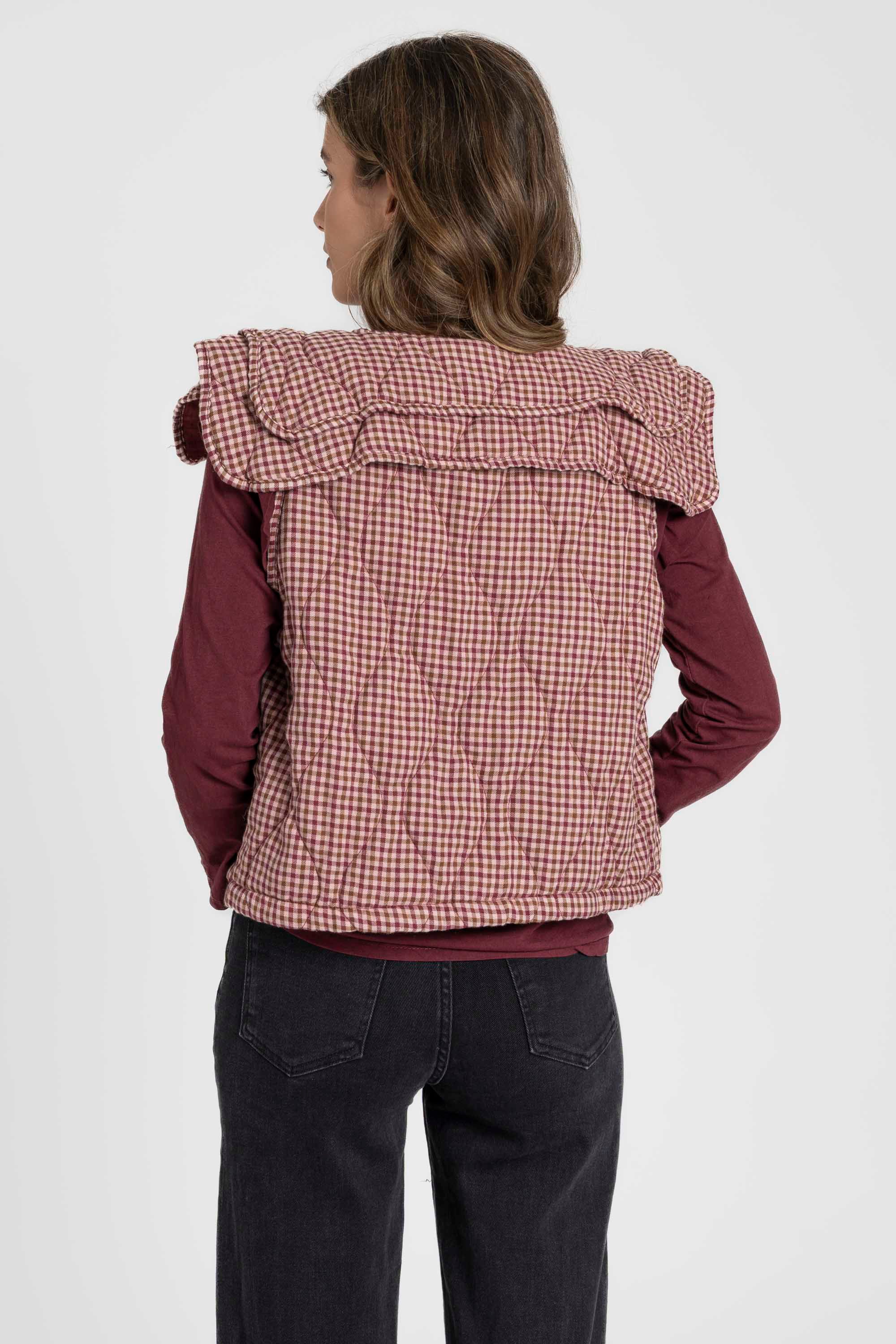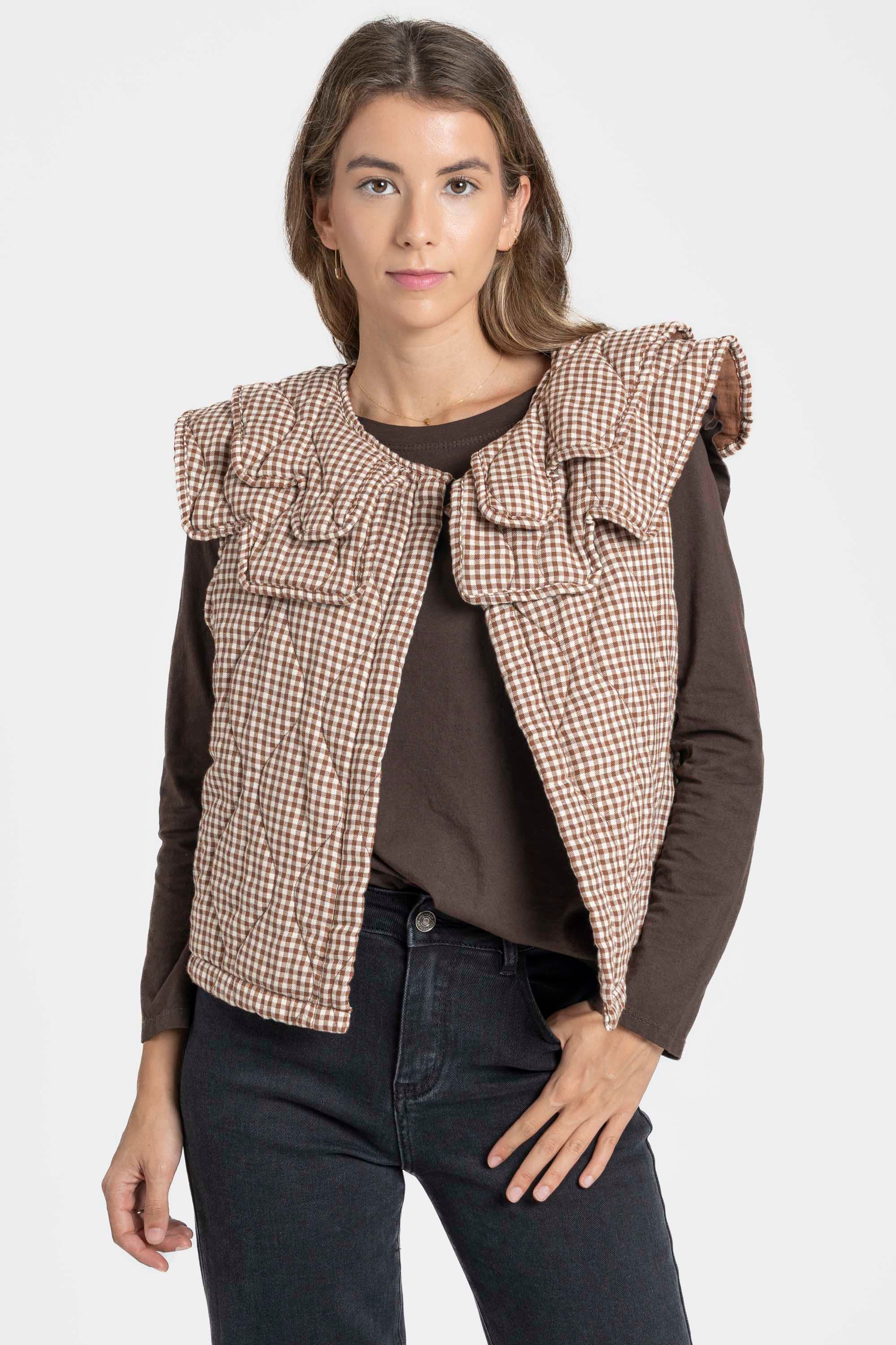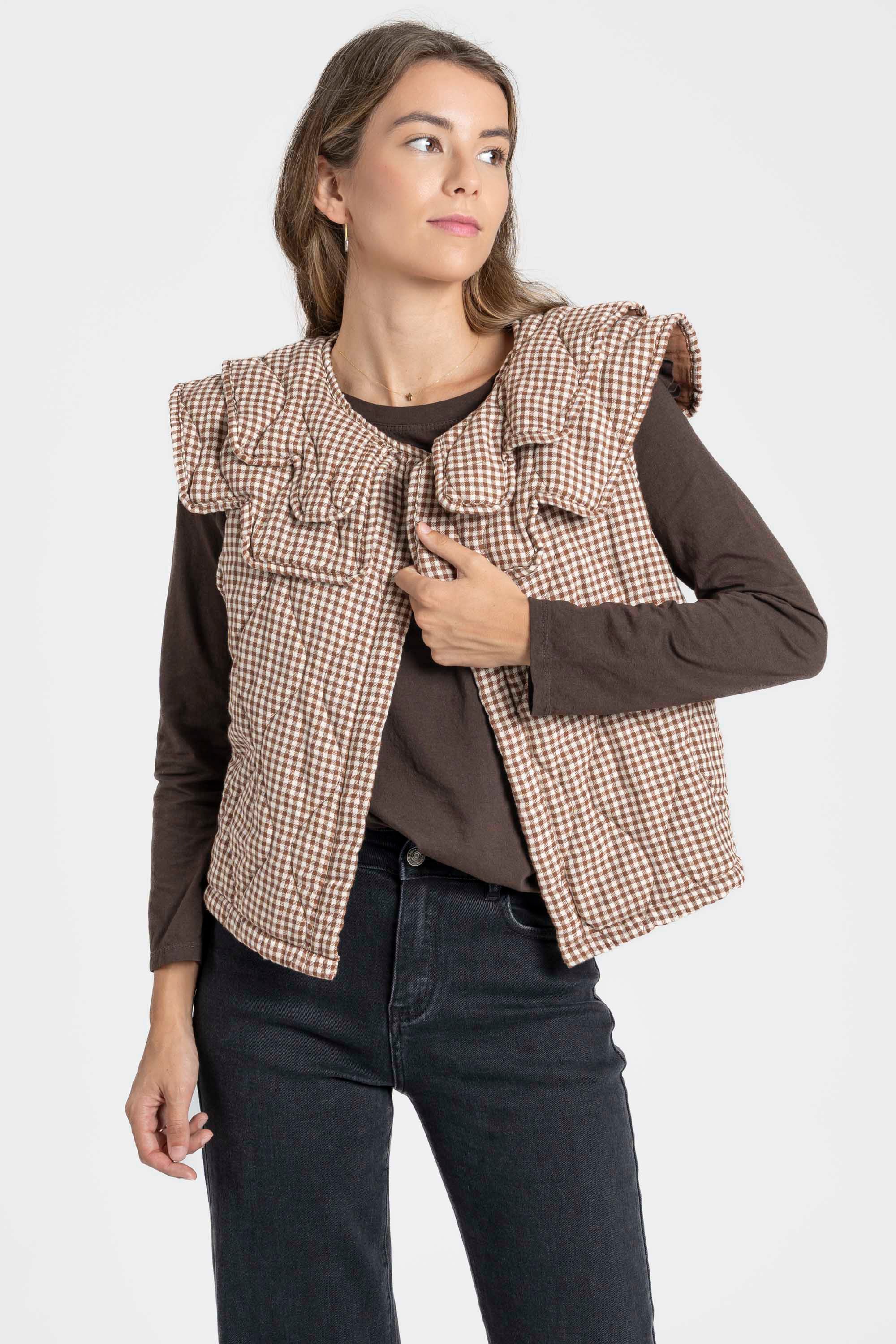 Tejido estampado cuadros. Abierto. Cuello redondo. Manga sisa.