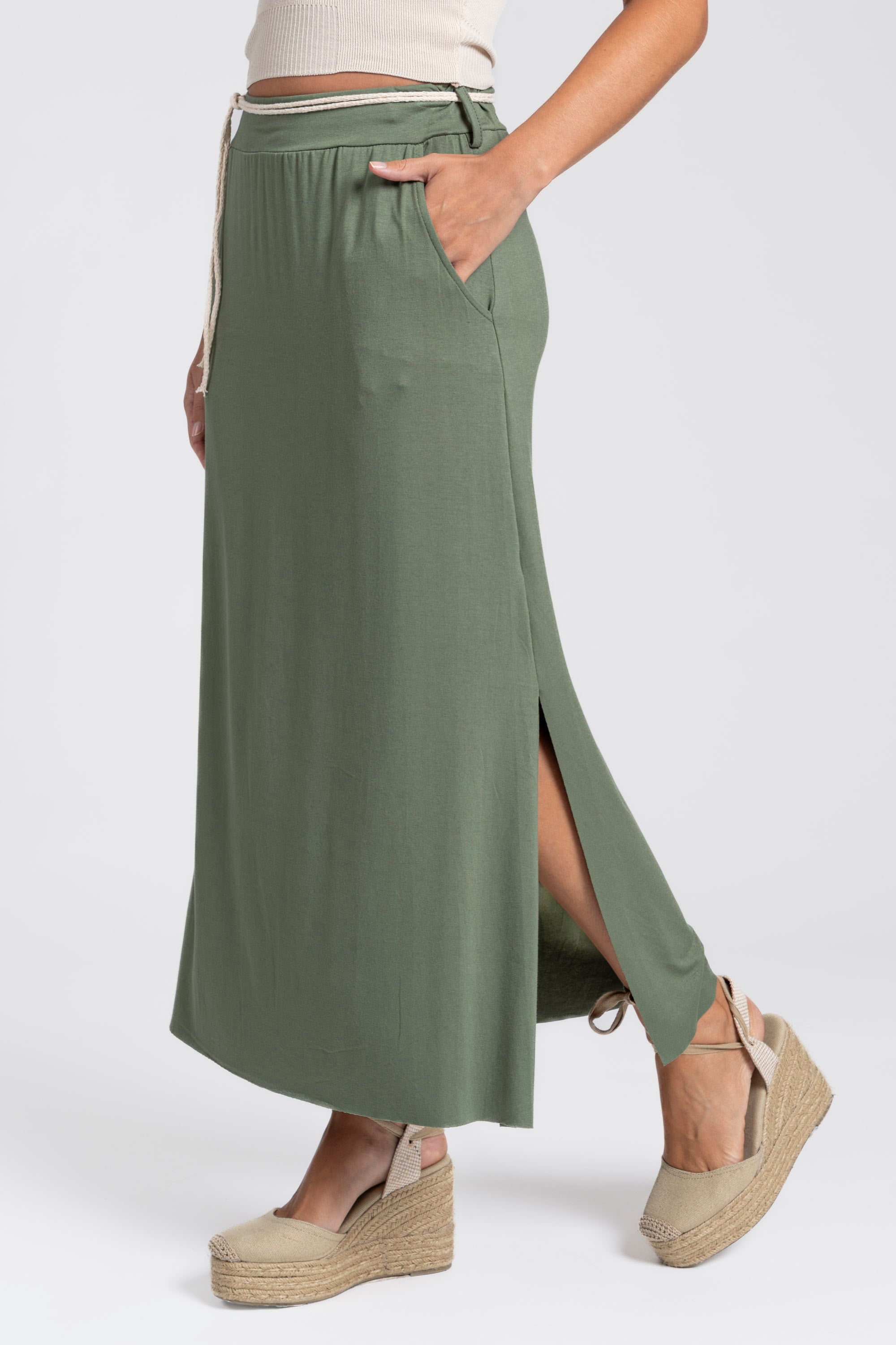 Tejido fluido. Cintura elástica. Bolsillos laterales. Apertura lateral.