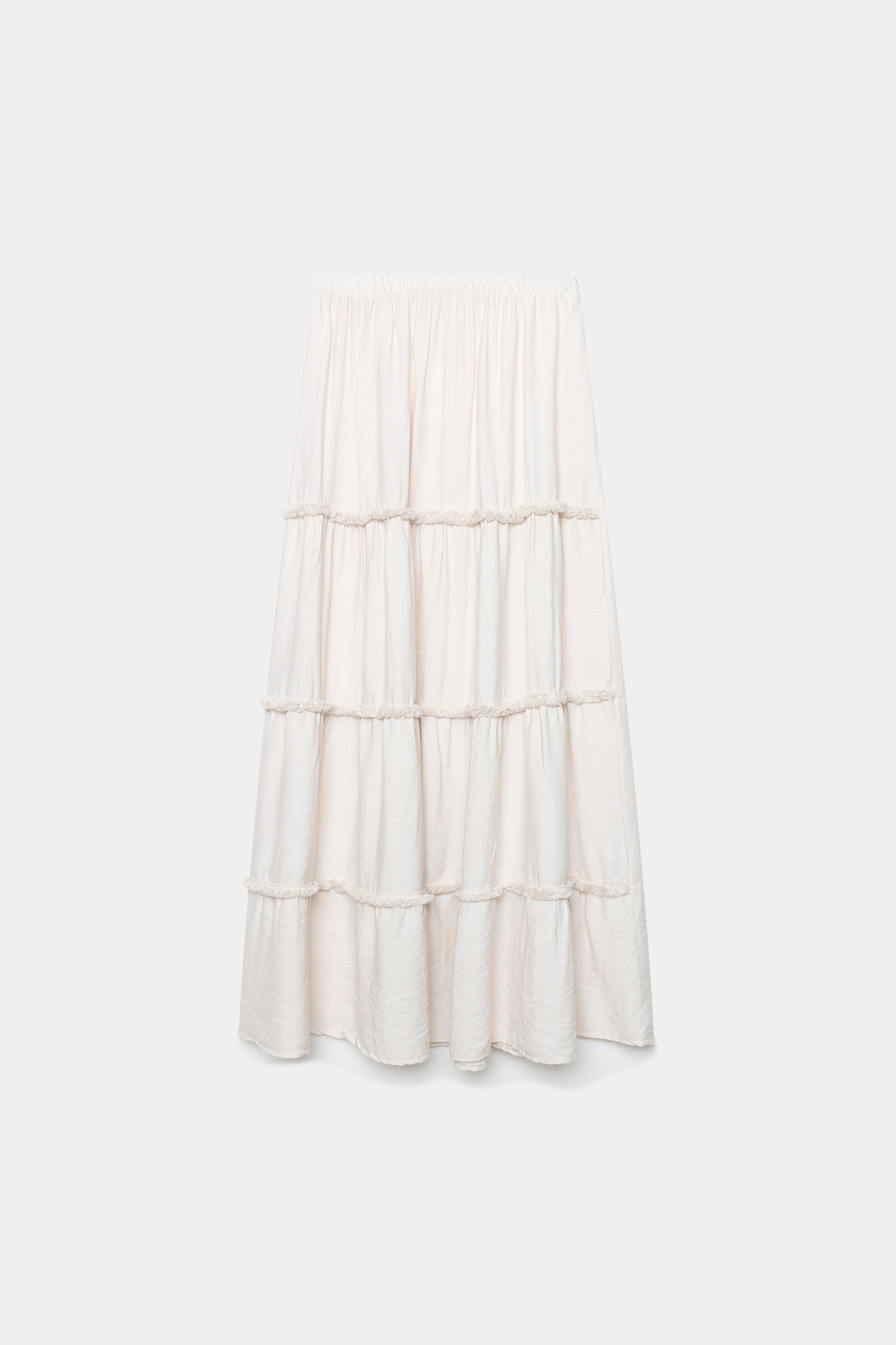 Tejido fluido. Diseño midi. Diseño vuelo. Cintura elástica.