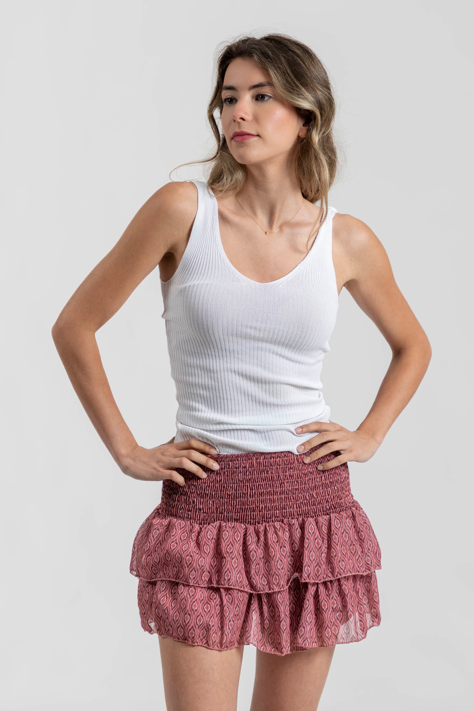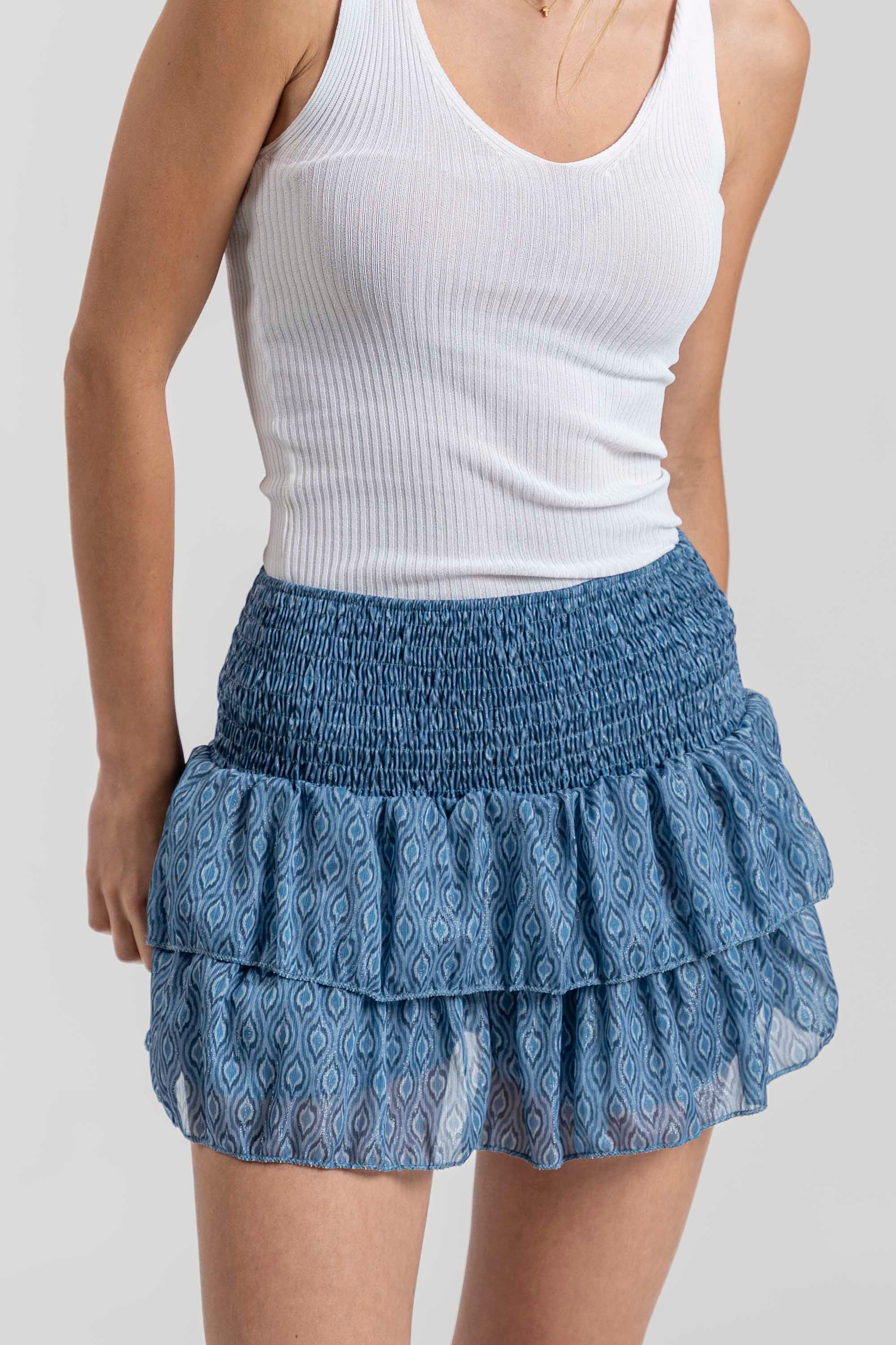 Tejido gasa. Tejido brillo. Diseño estampado. Diseño muy corto. Estilo falda pantalón. Tiro medio. Cintura elástica. Talla modelo: S. Altura modelo: 1,70 m.