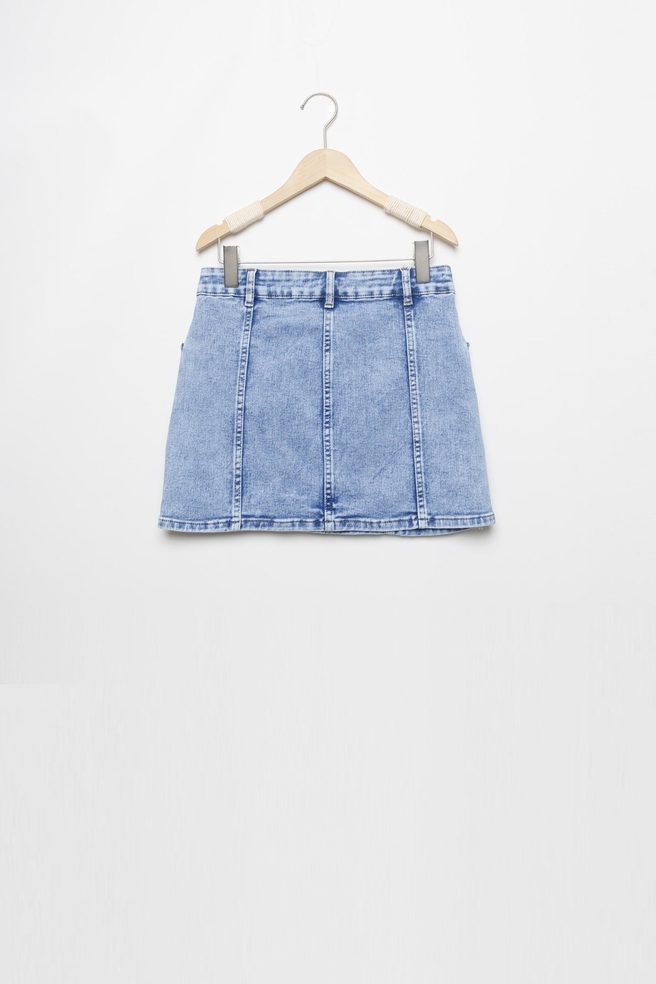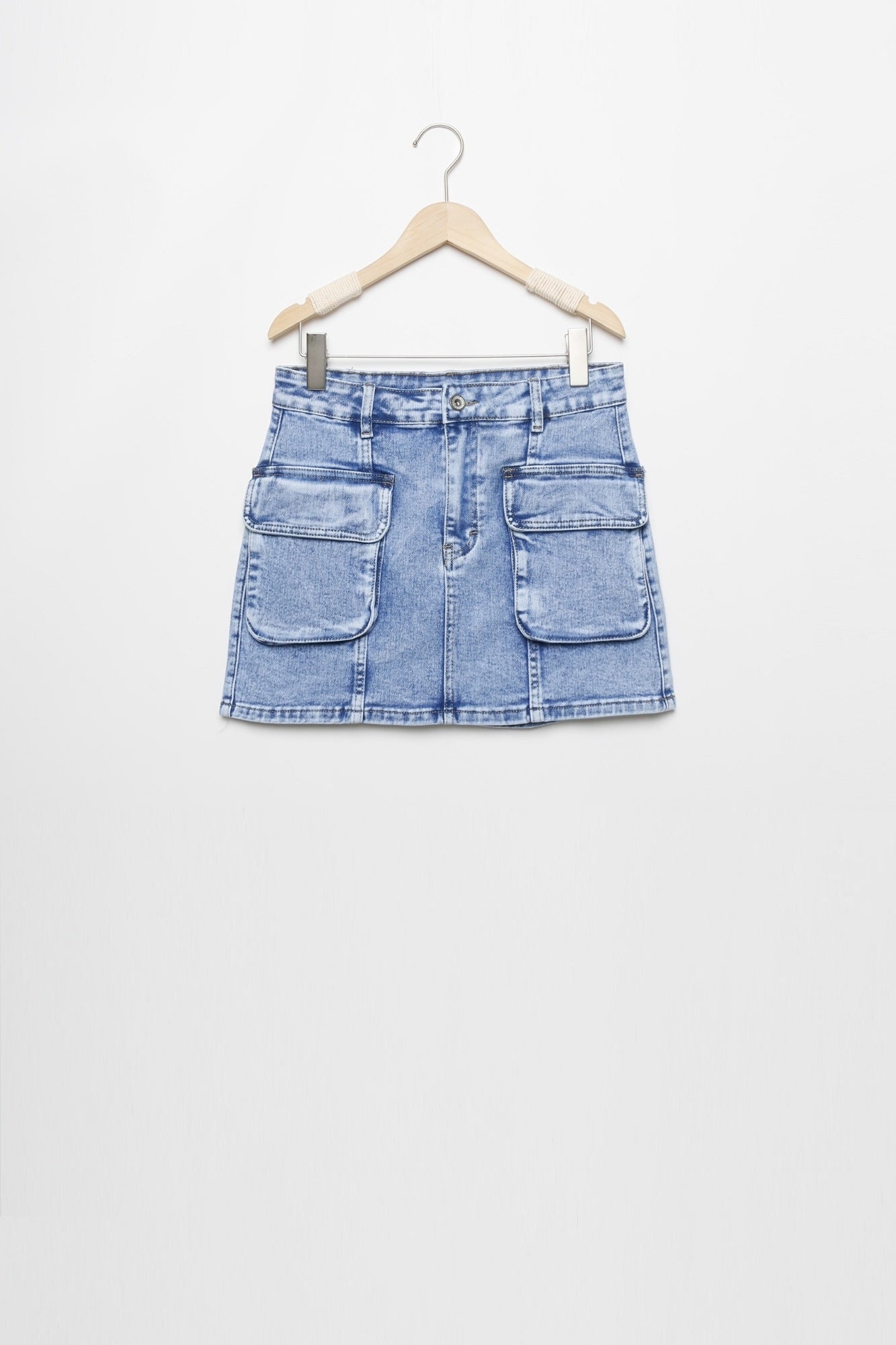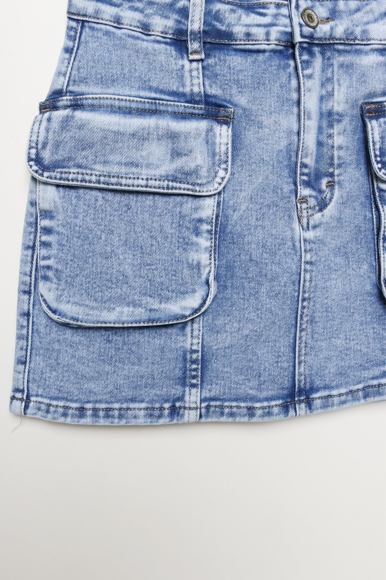 Tejido mezcla de algodón. Tejido tejano vaquero. Tiro medio. Diseño corto. Dos bolsillos cargo. Cierre de cremallera y botón. Trabillas. Talla modelo: 36.