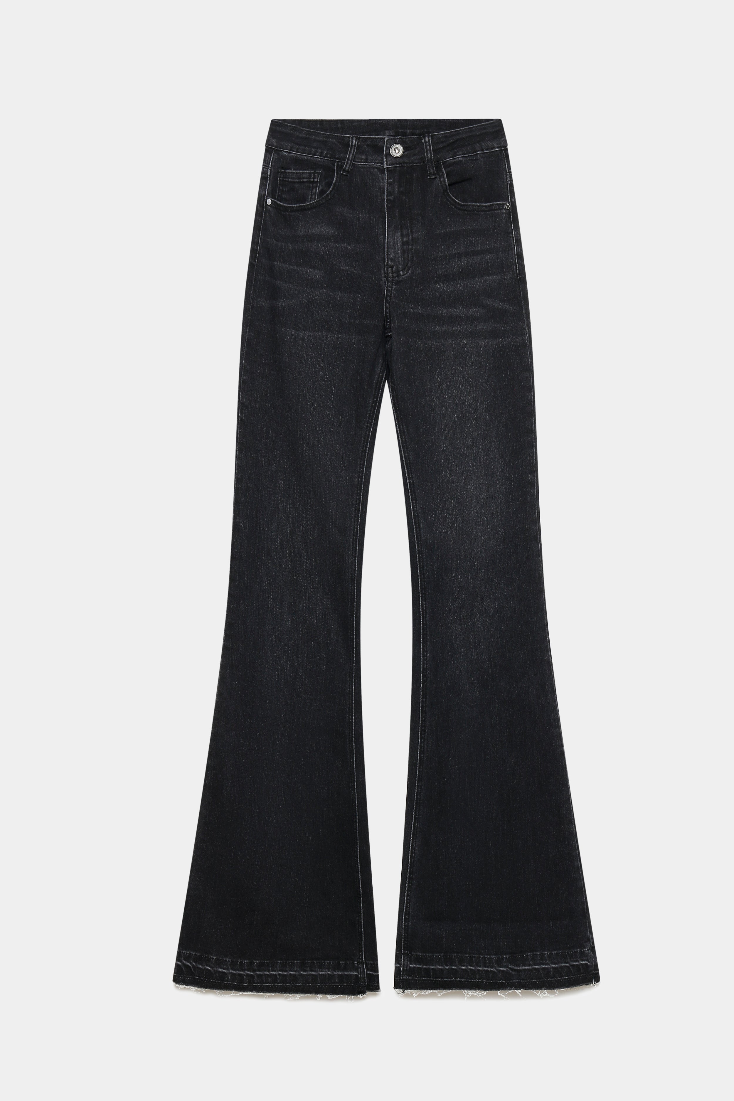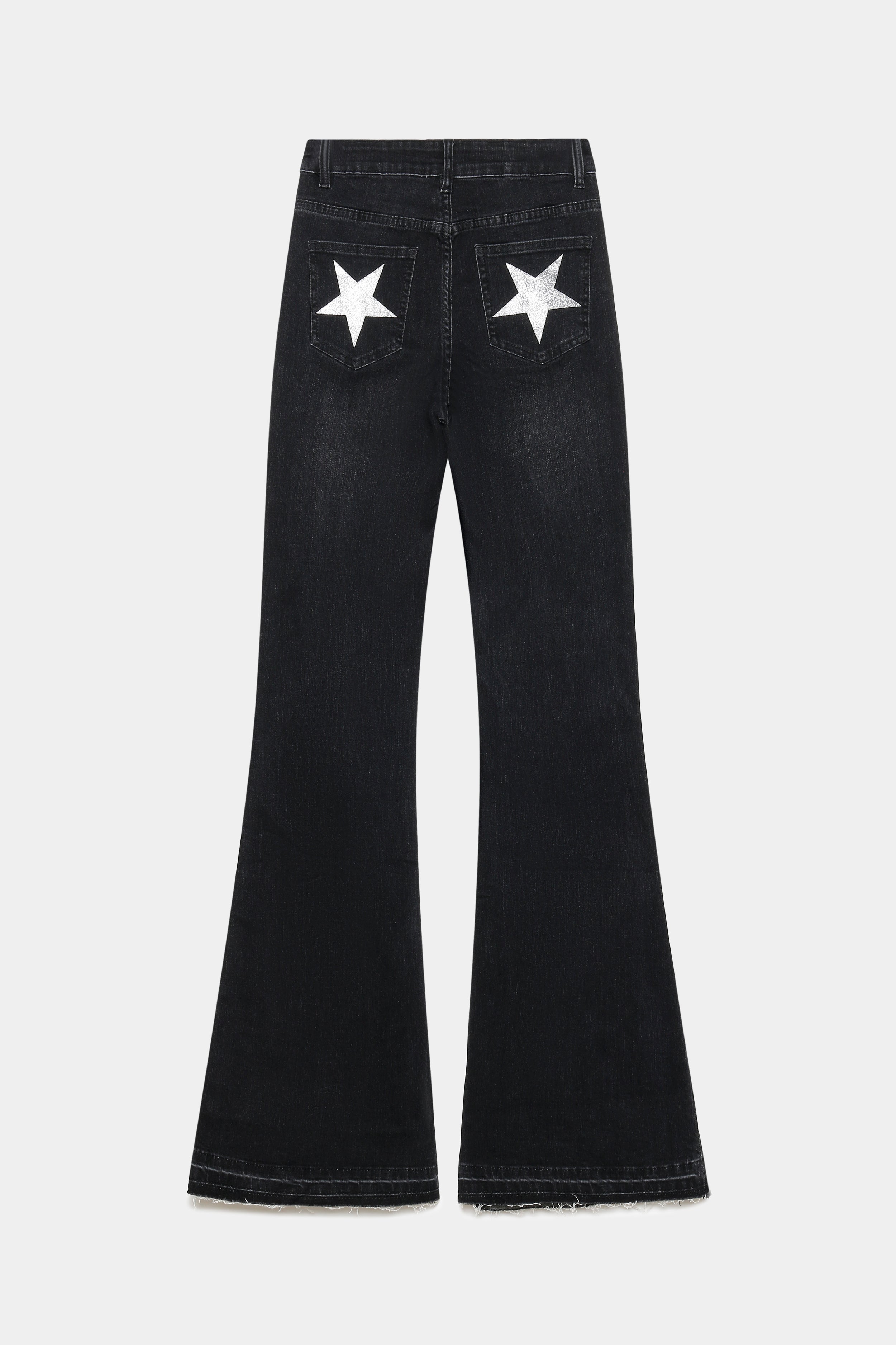 Tejido mezcla de algodón. Tiro alto. Cinco bolsillos. Diseño flare. Detalle de estrellas estampadas.