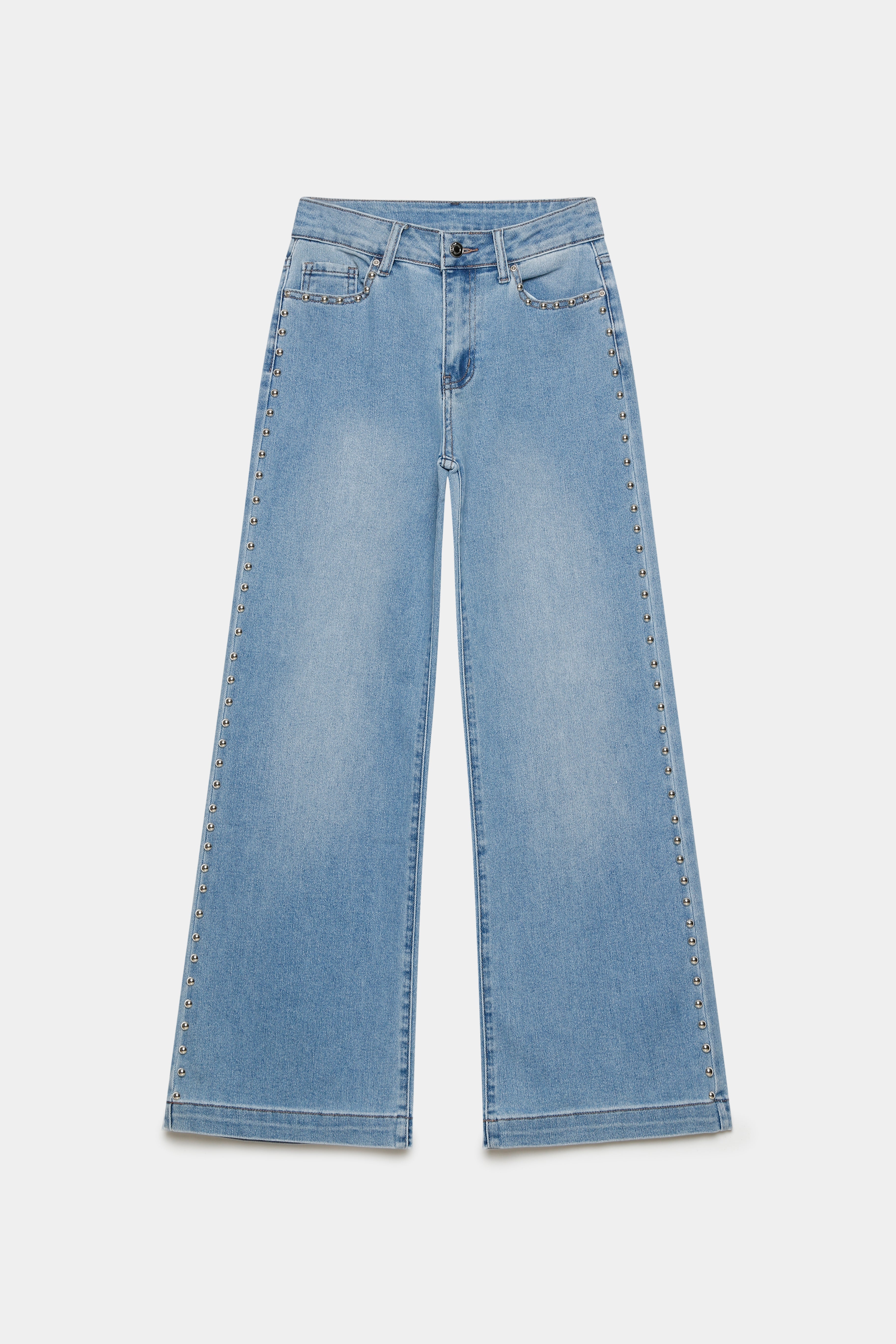 Tejido mezcla de algodón. Tejido tejano vaquero. Tejido elástico. Diseño recto. Detalle tachuelas. Diseño largo. Tiro medio. Cinco bolsillos. Cierre de cremallera y botón. Trabillas.