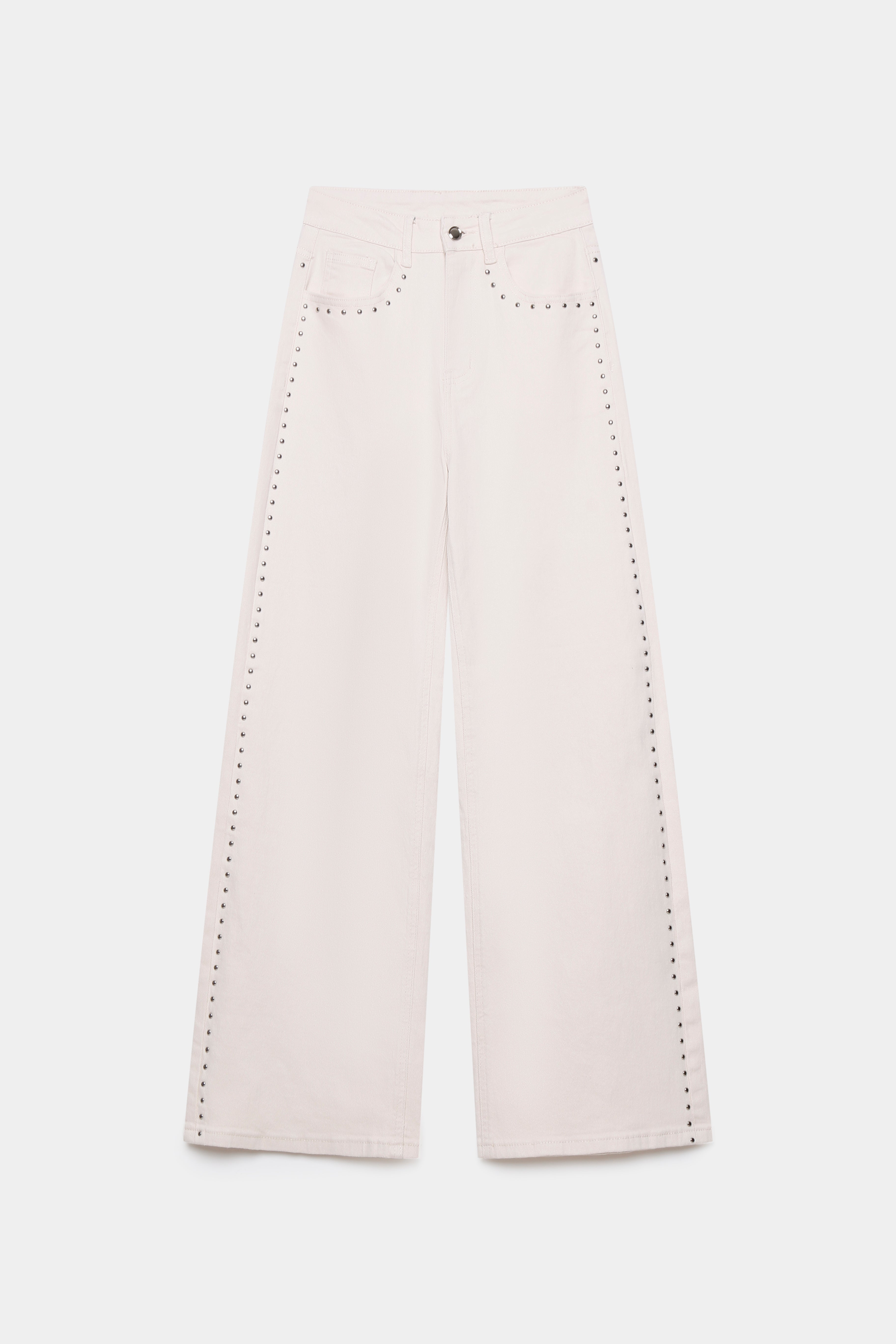 Tejido mezcla de algodón. Tejido elástico. Diseño recto. Diseño largo. Tiro alto. Cinco bolsillos. Cierre de cremallera y botón. Trabillas.