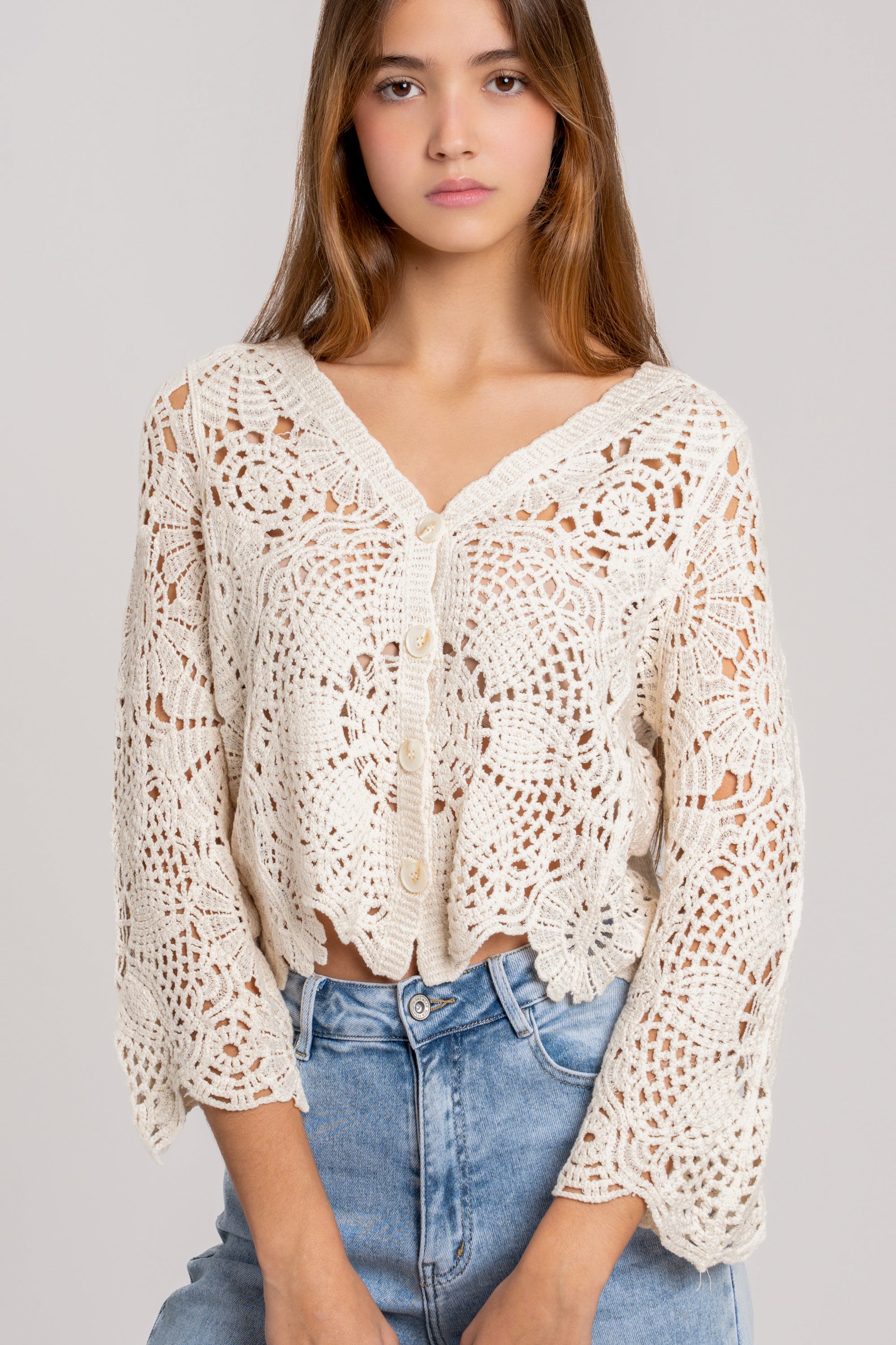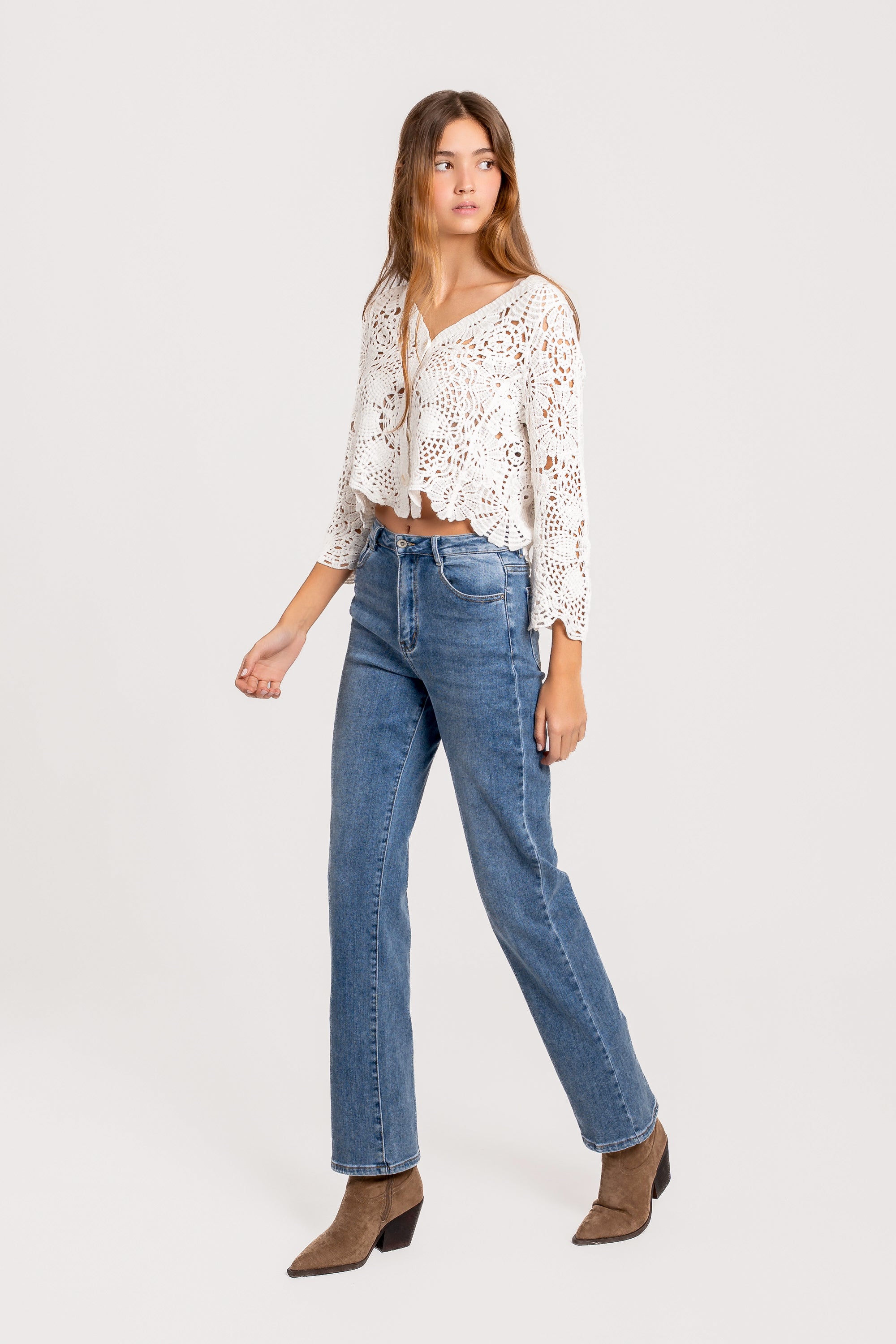 Tejido de algodón. Escote pico. Manga 3/4. Cierre con botones.