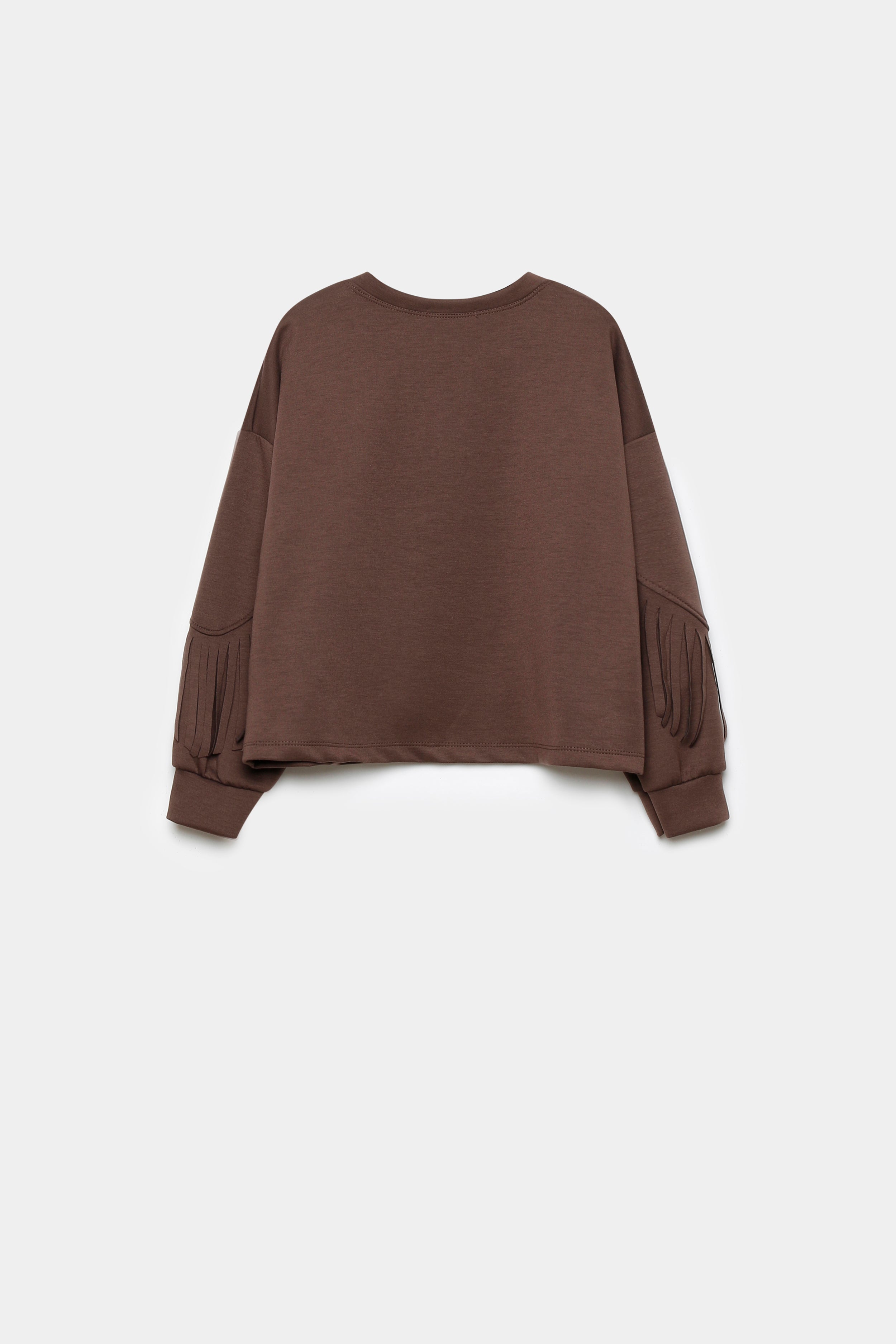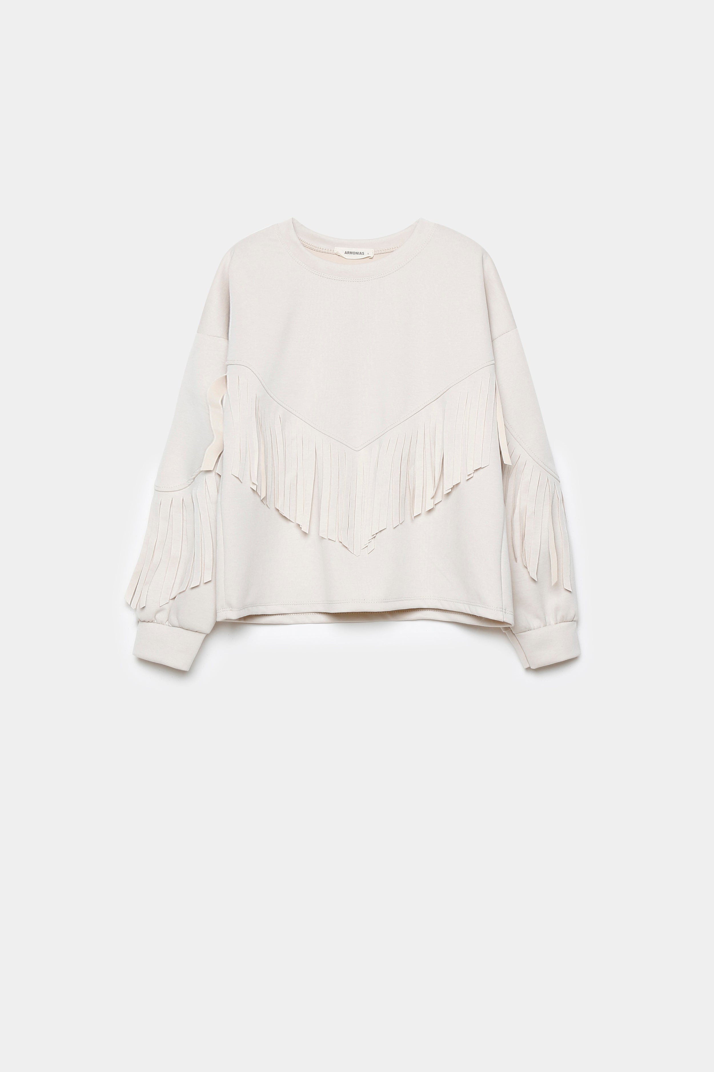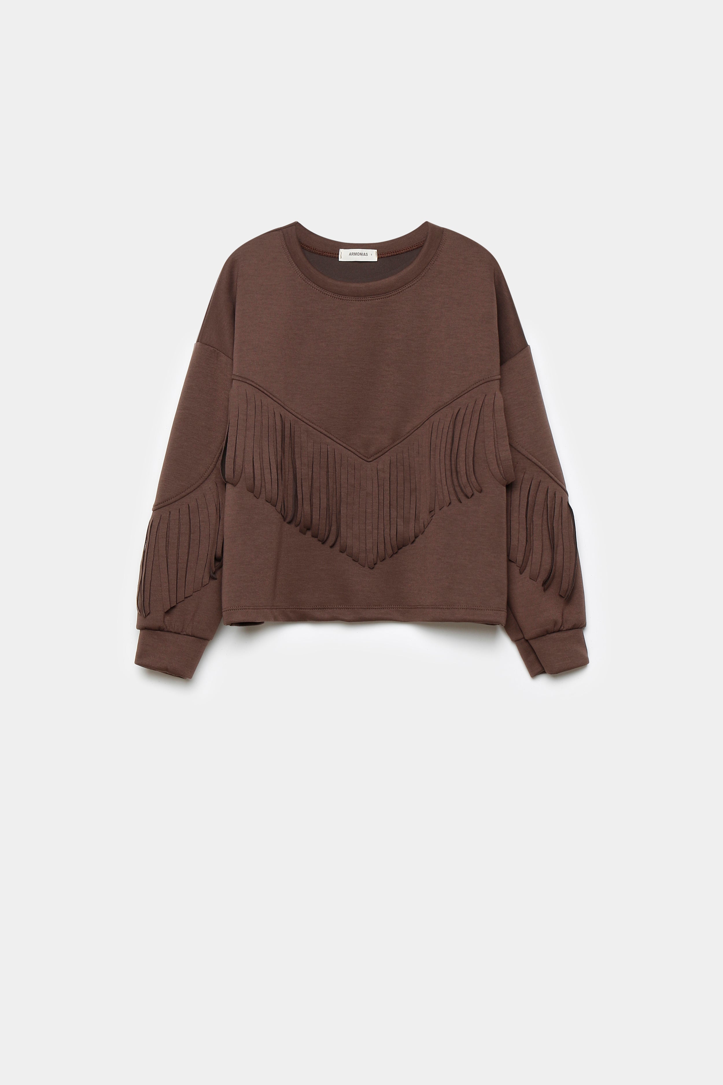 Tejido estilo felpa. Cuello redondo. Manga larga. Detalle de flecos.