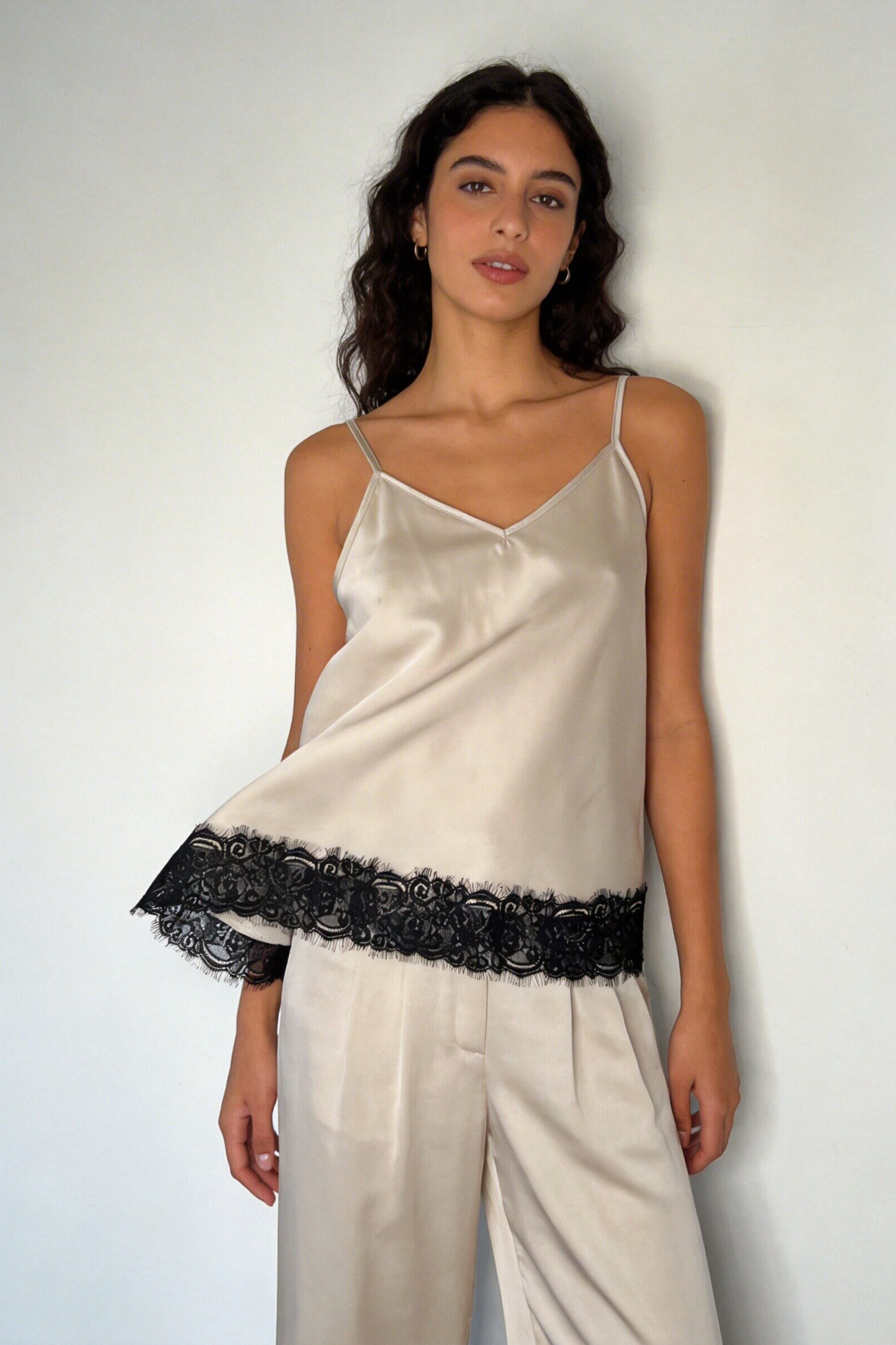 Tejido satinado. Escote pico. Tirantes finos. Detalle encaje.