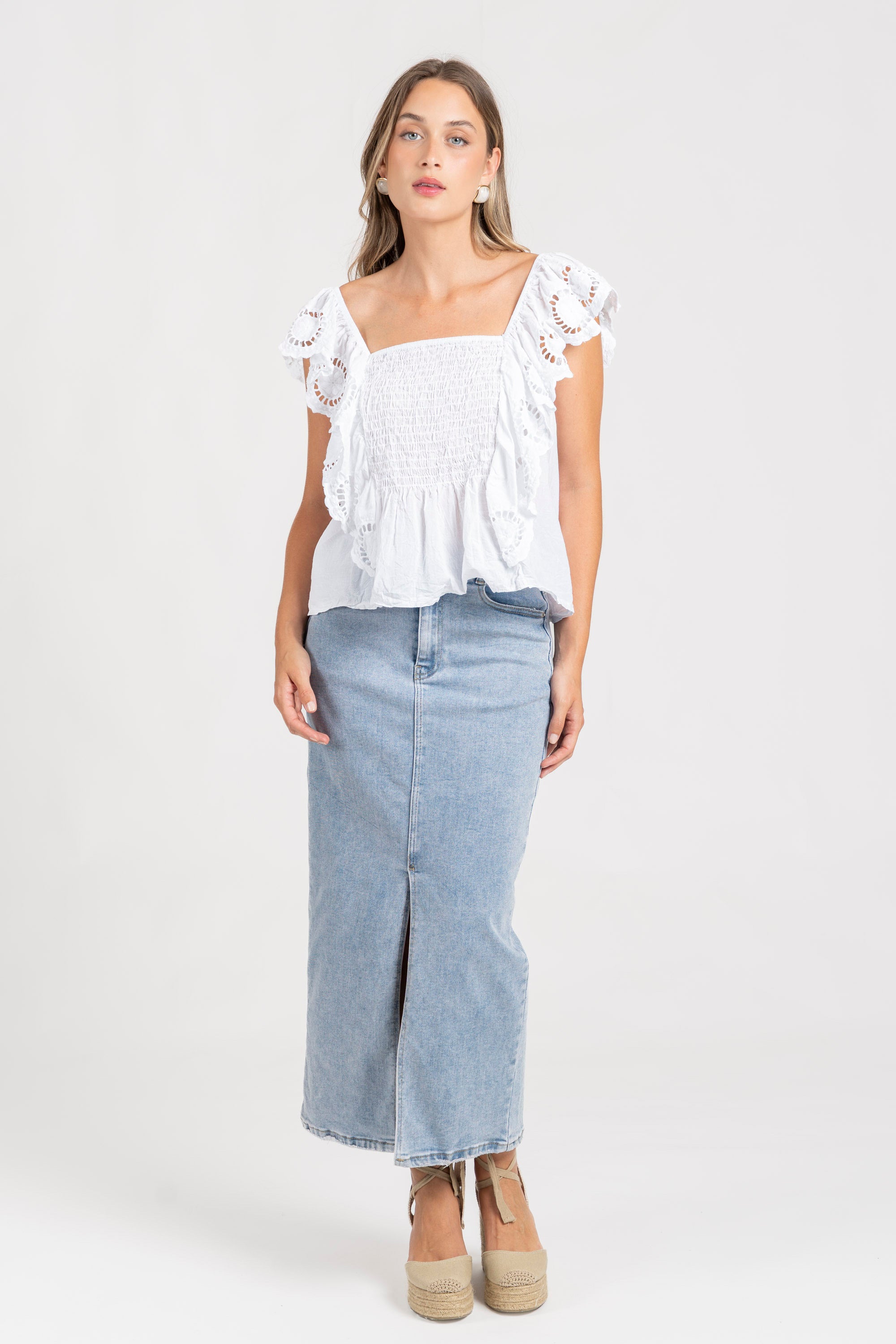 Tejido mezcla de algodón. Bordados. Cuello cuadrado. Manga corta.