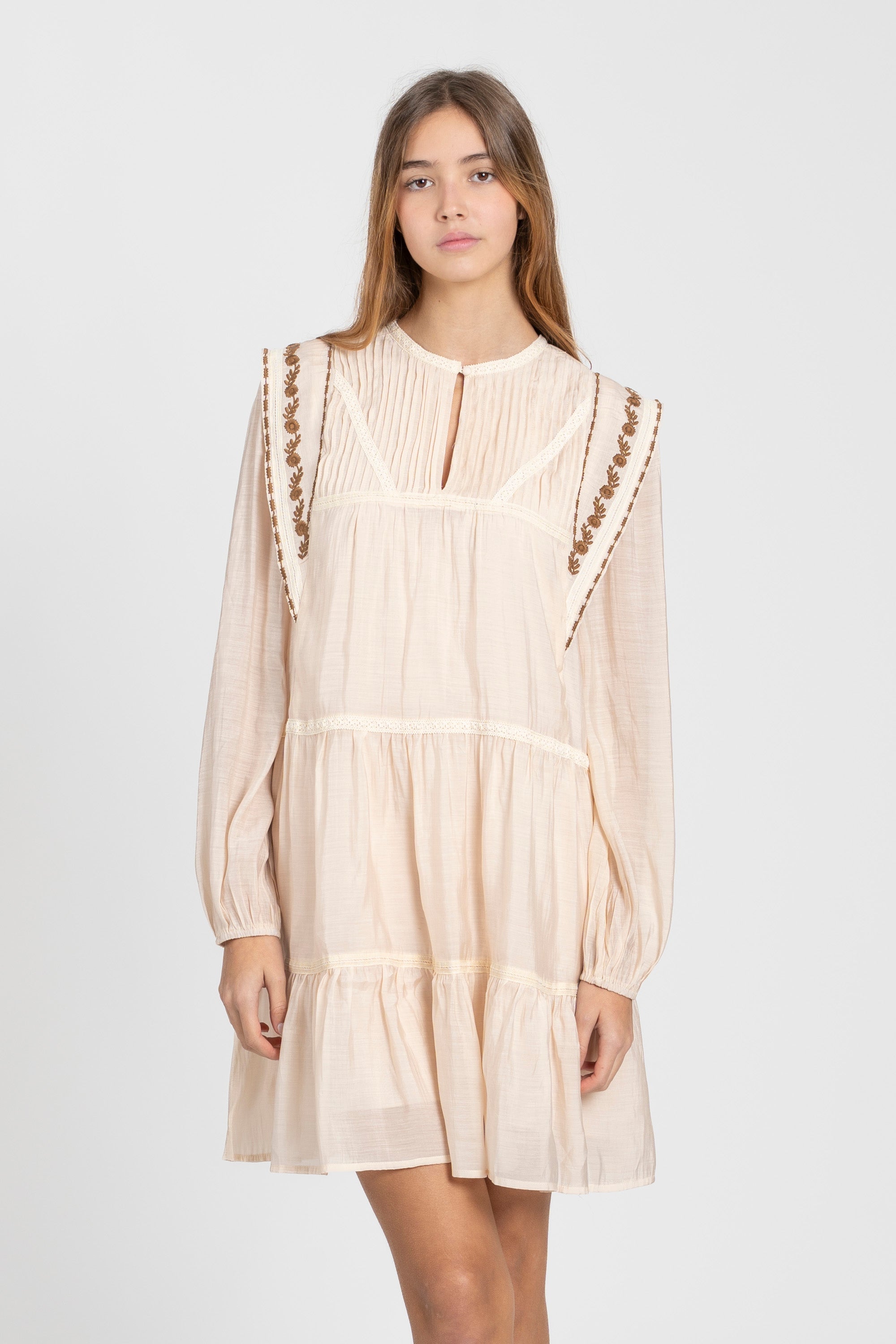Tejido fluido. Cuello redondo. Manga larga. Cierre botón. Forro interior. Detalle de bordados. Altura modelo 180 cm. Talla S/M.