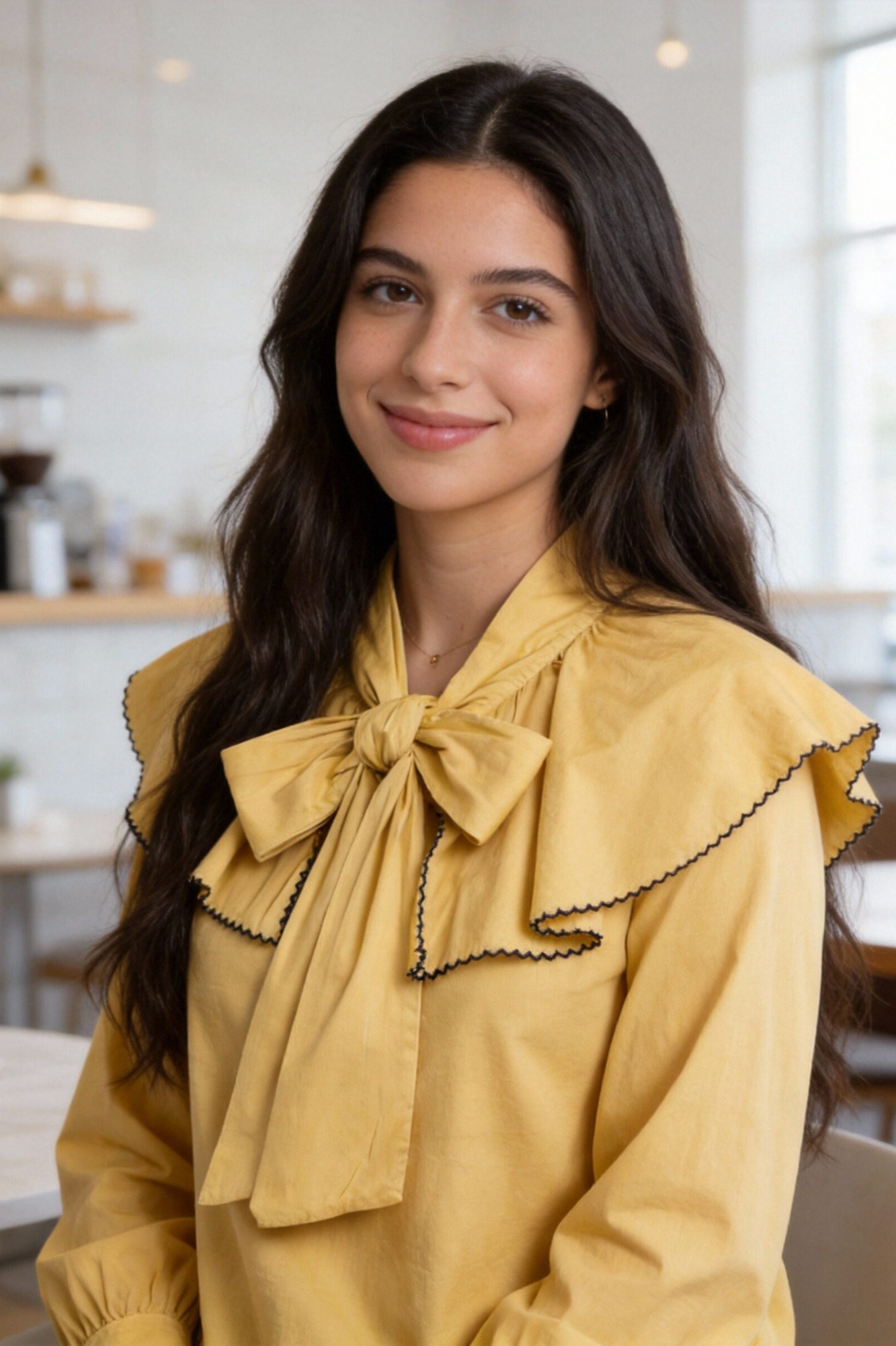 Tejido de algodón. Cuello redondo subido con lazada. Manga larga. Detalle capa y bordados.