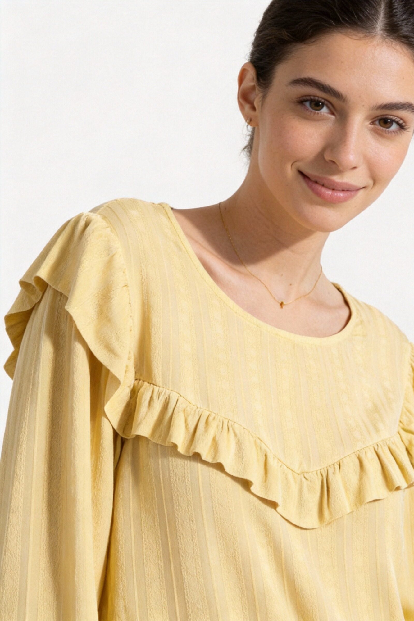 Tejido fluido. Cuello redondo. Manga larga. Cierre en la trasera con botón. Detalle de volantes.