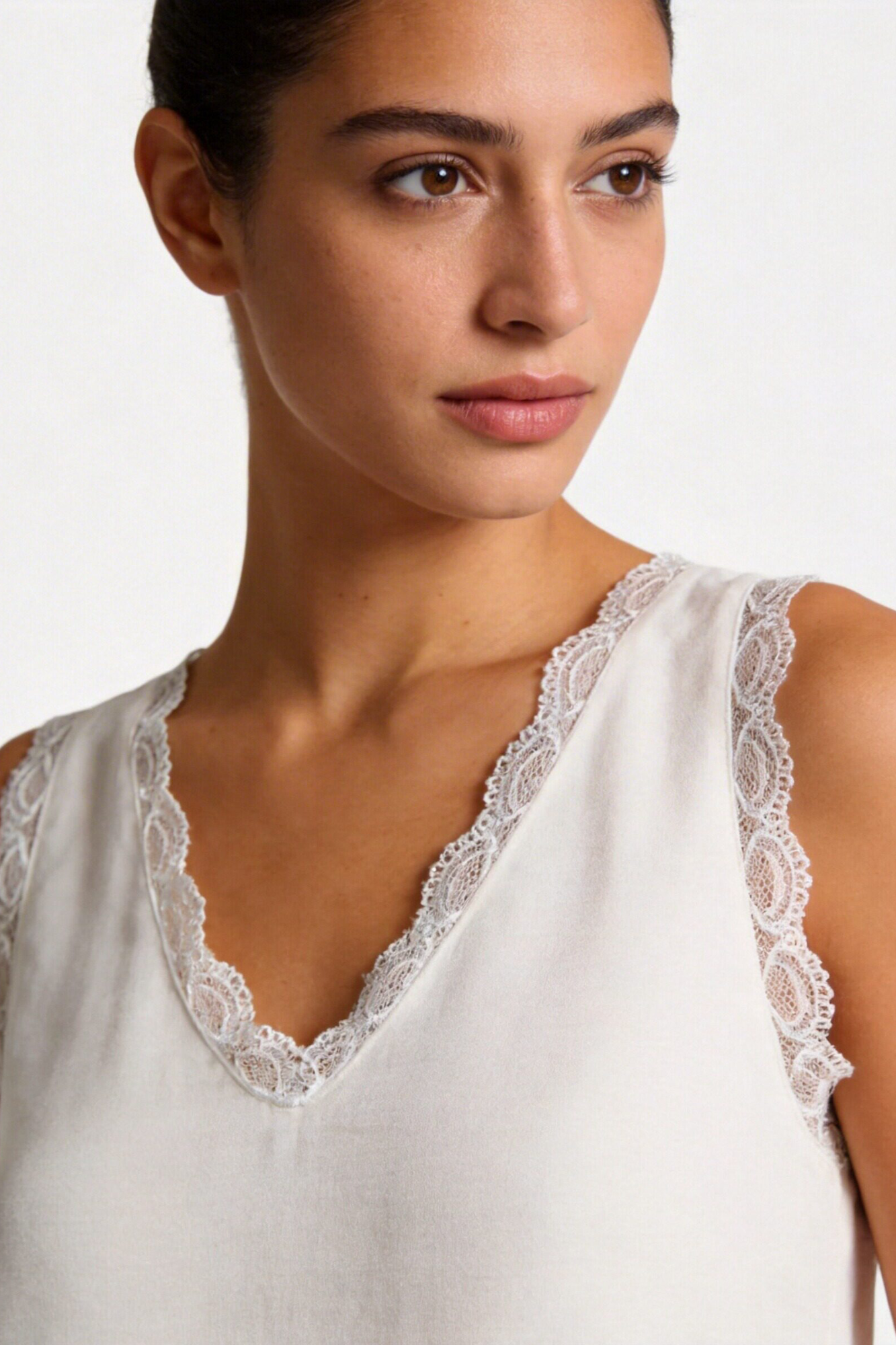 Tejido de gasa. Diseño recto. Cuello pico. Manga sisa. Detalles encaje. Shorts de tiro alto. Cintura elástica. Bolsillos laterales.
