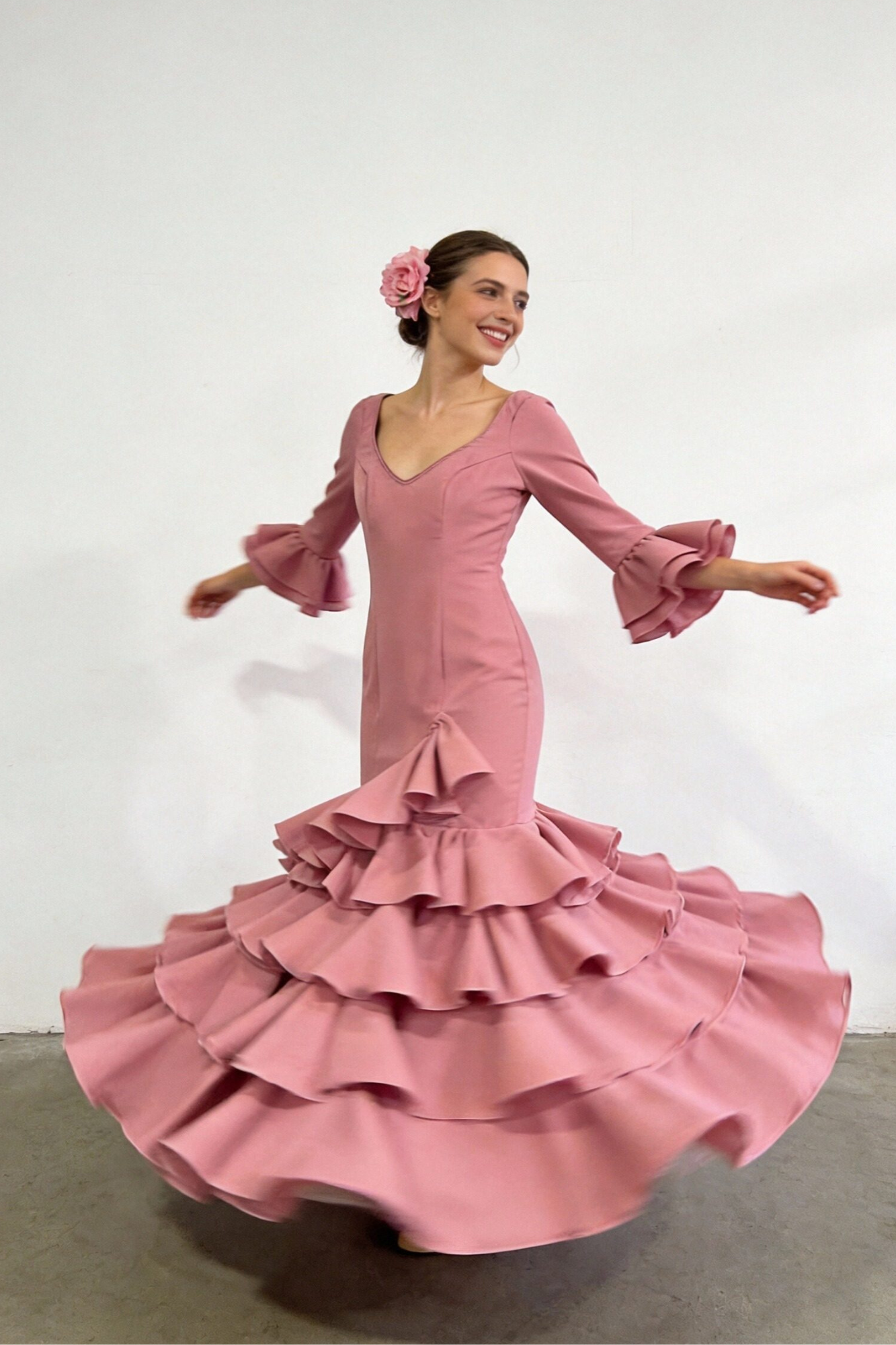 Tejido liso fluido. Traje de flamenca ajustado. De manga larga y volantes. Escote pico. Bolsillo interior. Cierre trasera con cremallera. Ajustable. El vestido es elástico y se adapta al cuerpo.