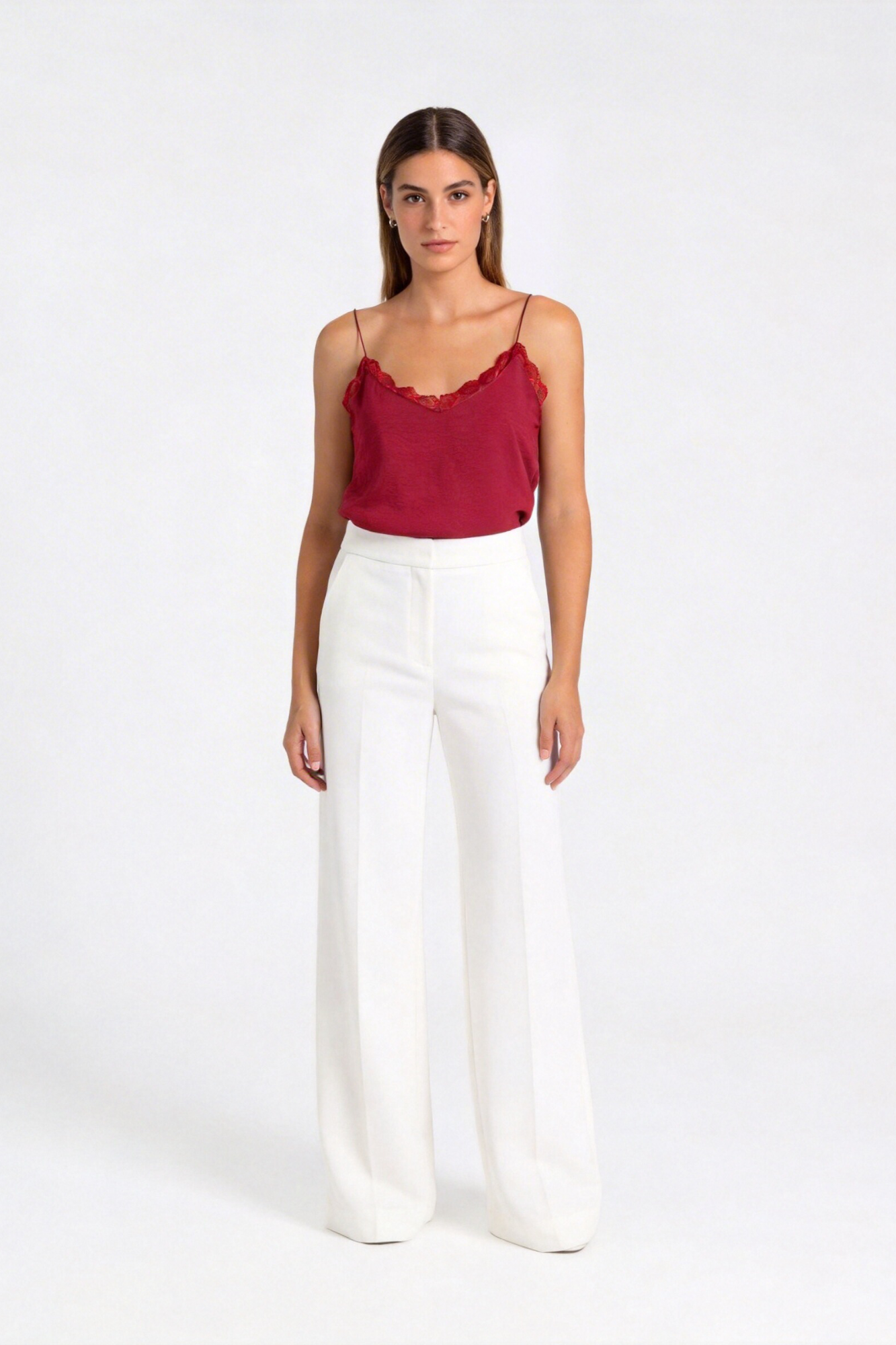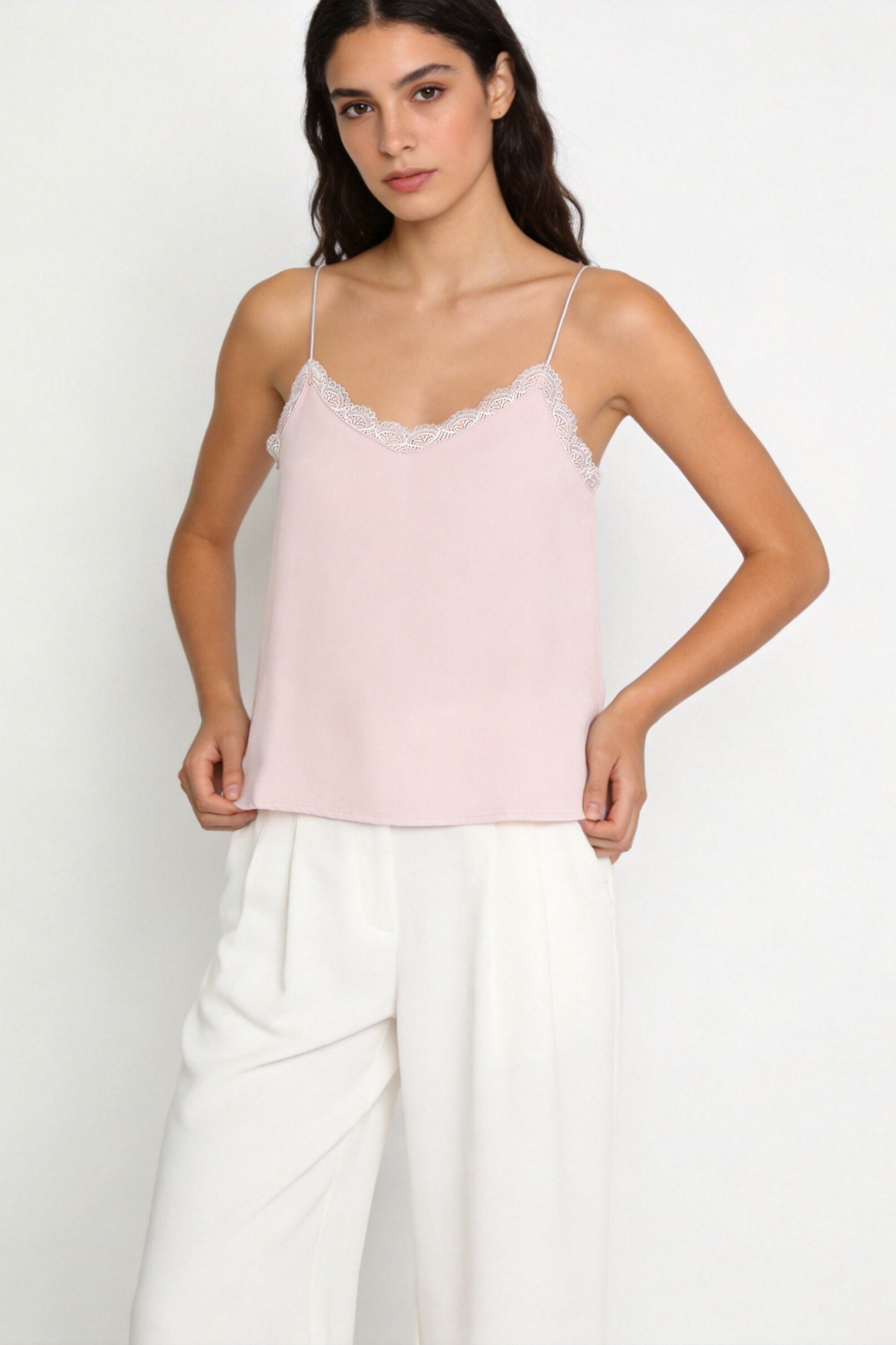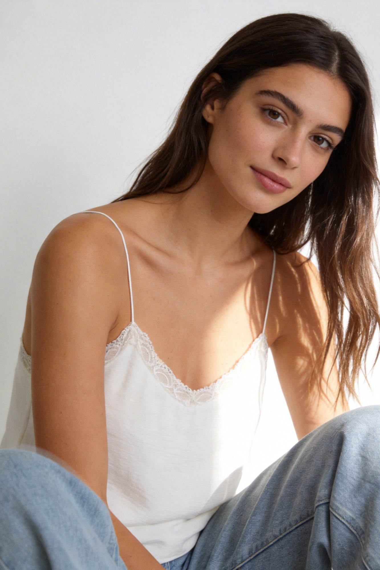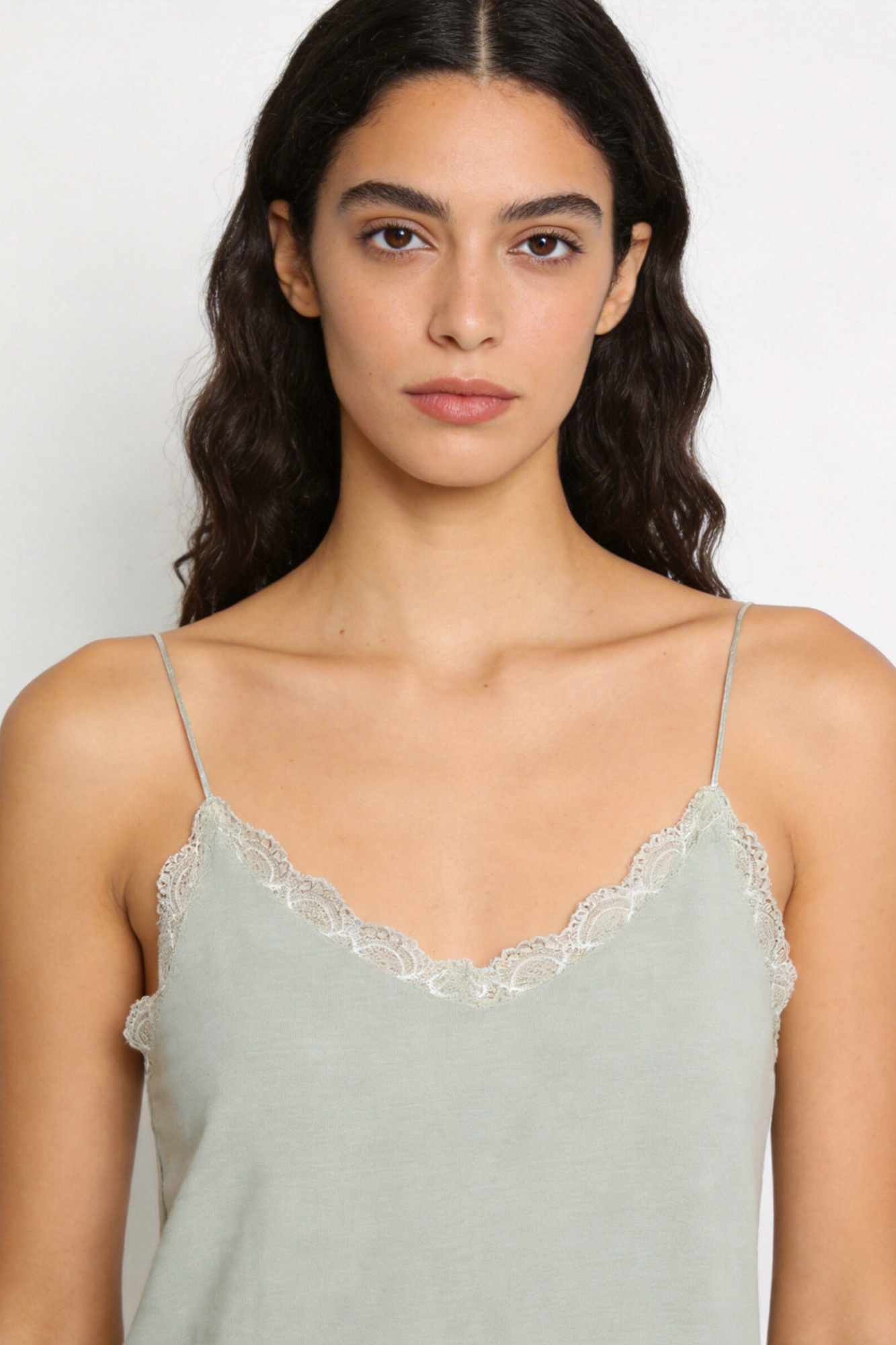 Tejido de gasa. Tejido textura. Diseño fluido. Cuello pico. Manga tirantes. Detalles con encaje. Talla modelo: S. Altura modelo 1,66 m.
