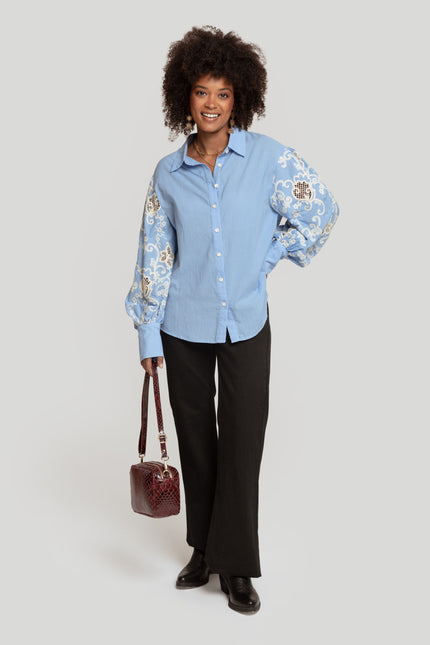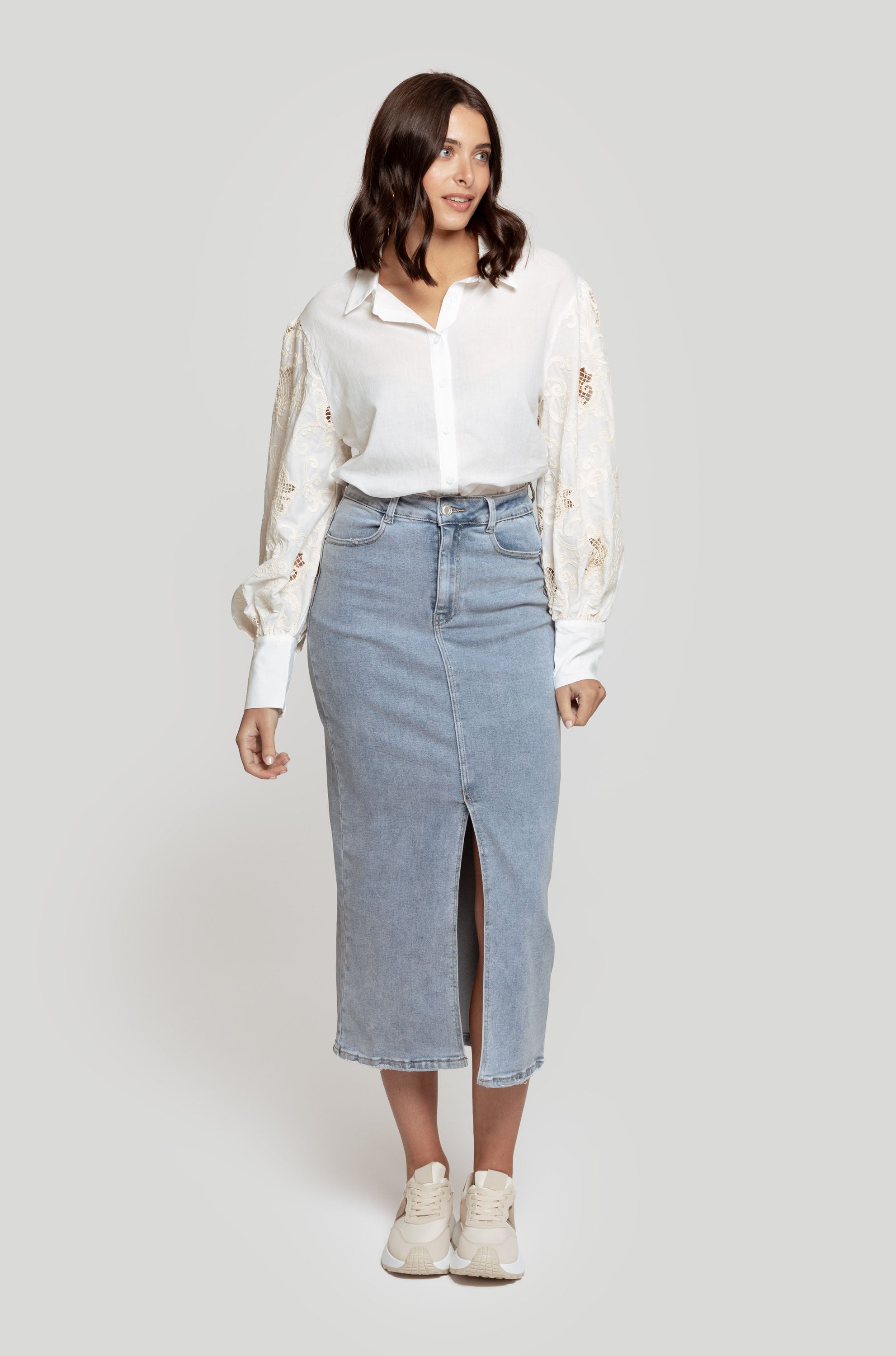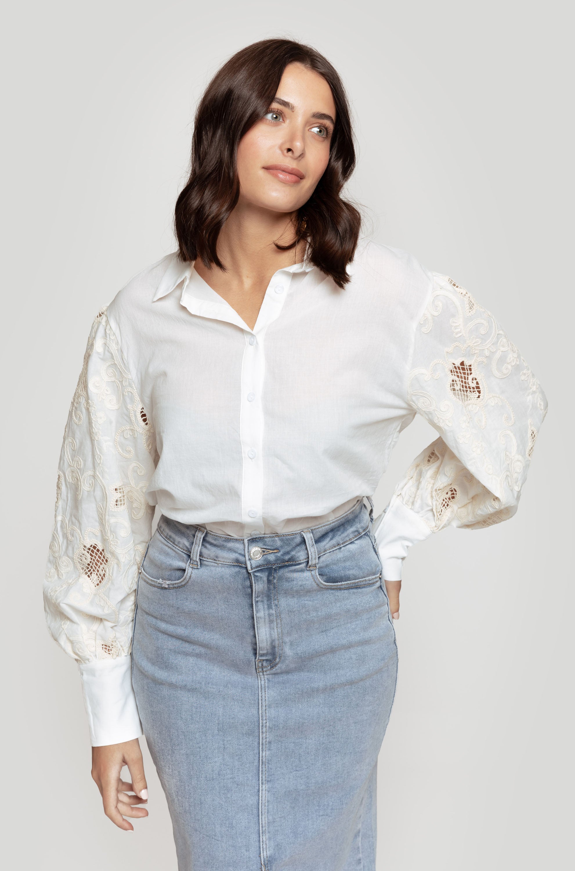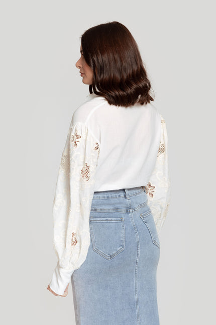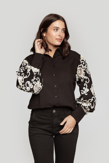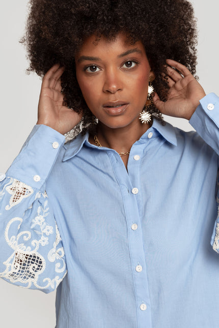 Tejido de algodón. Diseño con mangas en crochet. Diseño recto. Cuello camisa. Manga larga. Puño abotonado. Cierre de botones. Talla modelo: S/M. Altura modelo: 1.75 m.