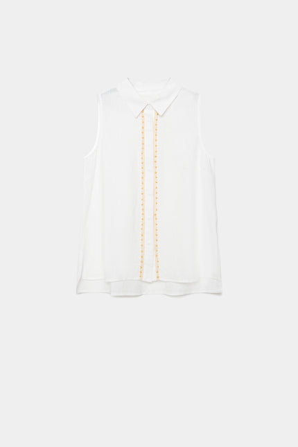 Tejido de algodón. Diseño recto. Cuello solapa. Manga sisa. Cierre botones.