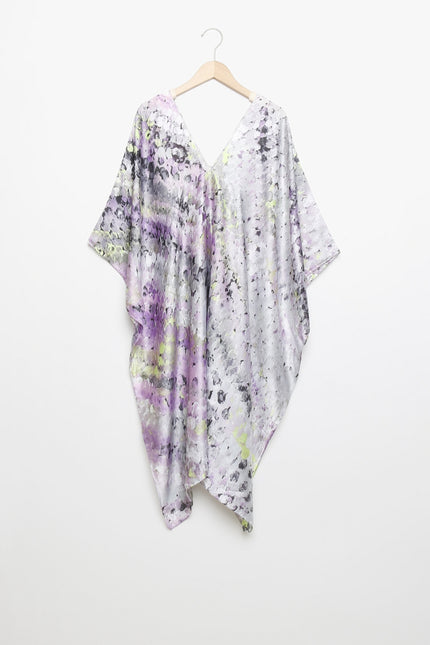 Kimono fluido estampado. Cuello pico. Manga corta. Talla única.