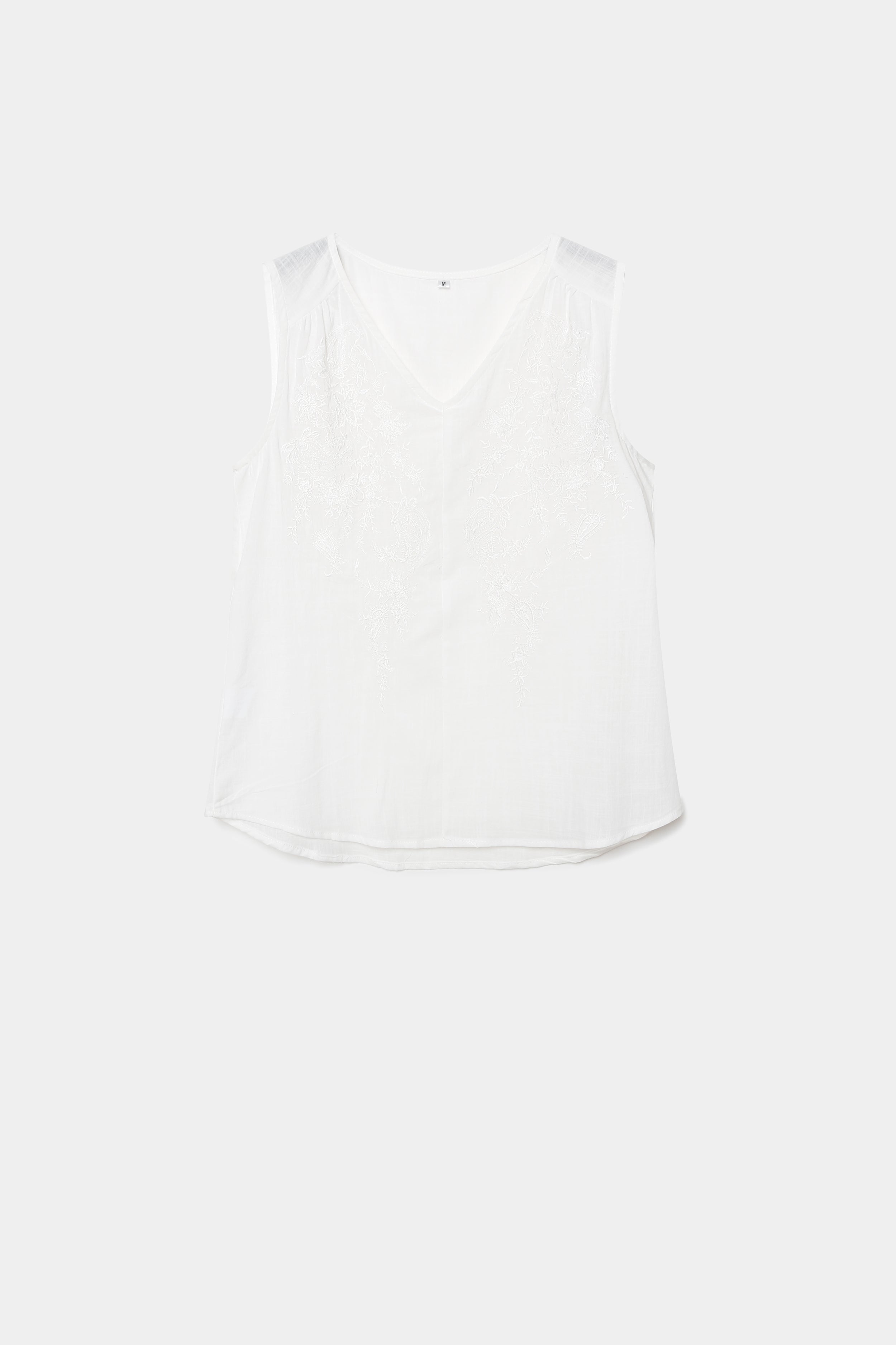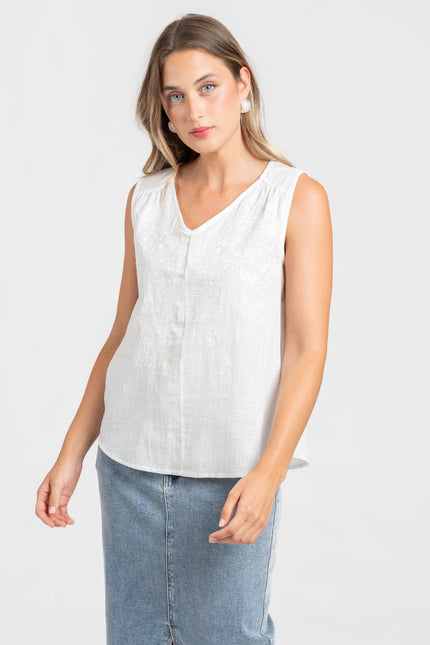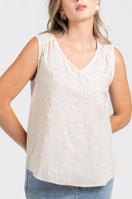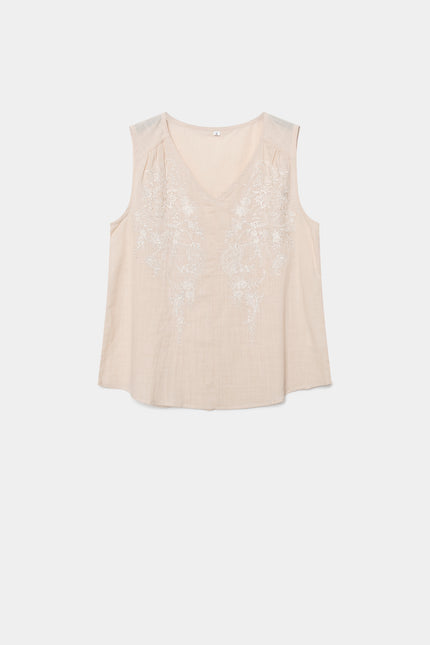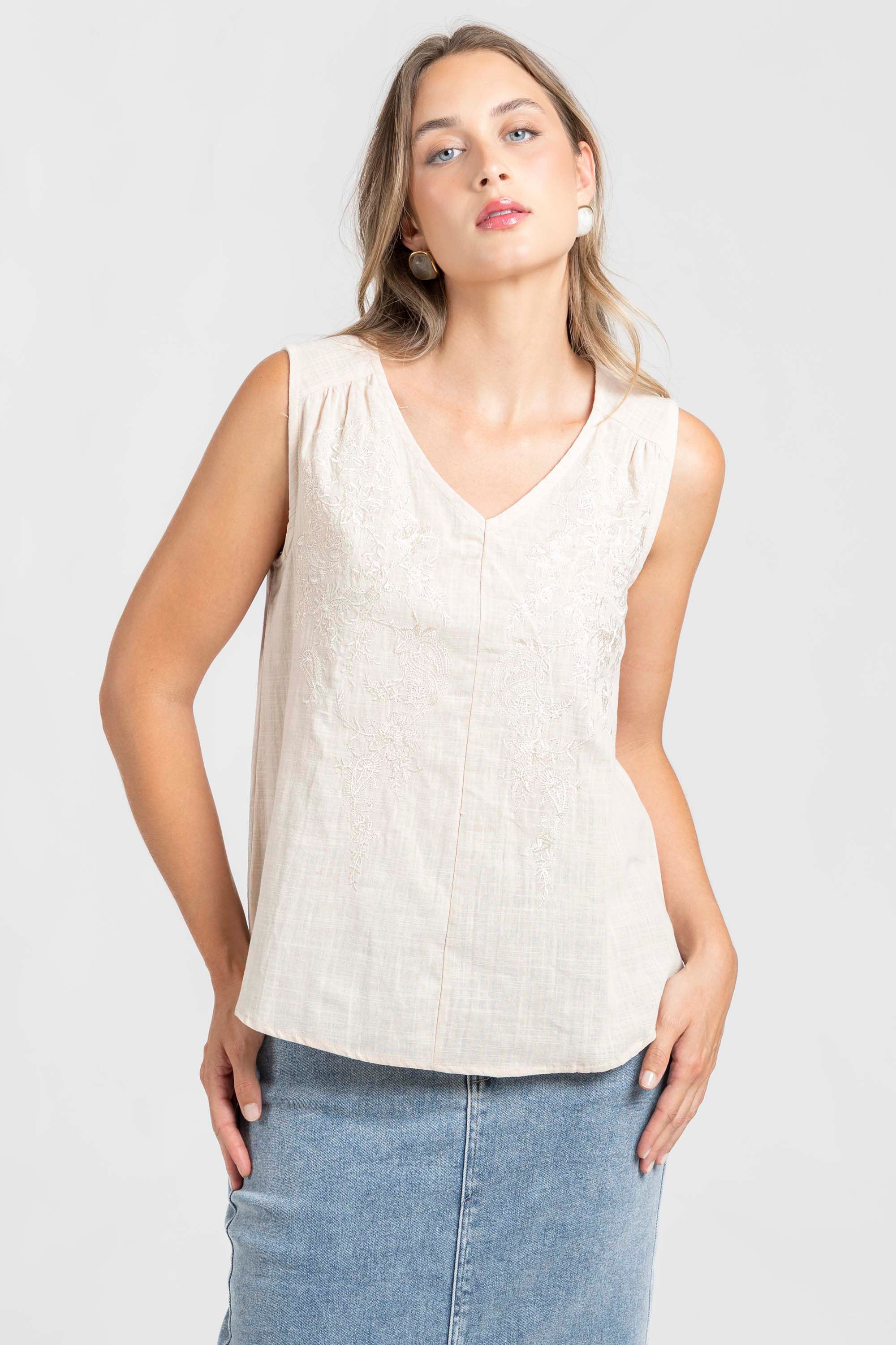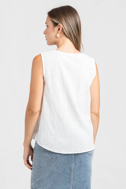 Tejido de algodón. Diseño recto. Cuello pico. Manga sisa. Detalle bordados.