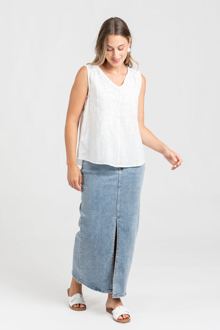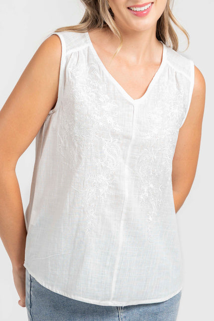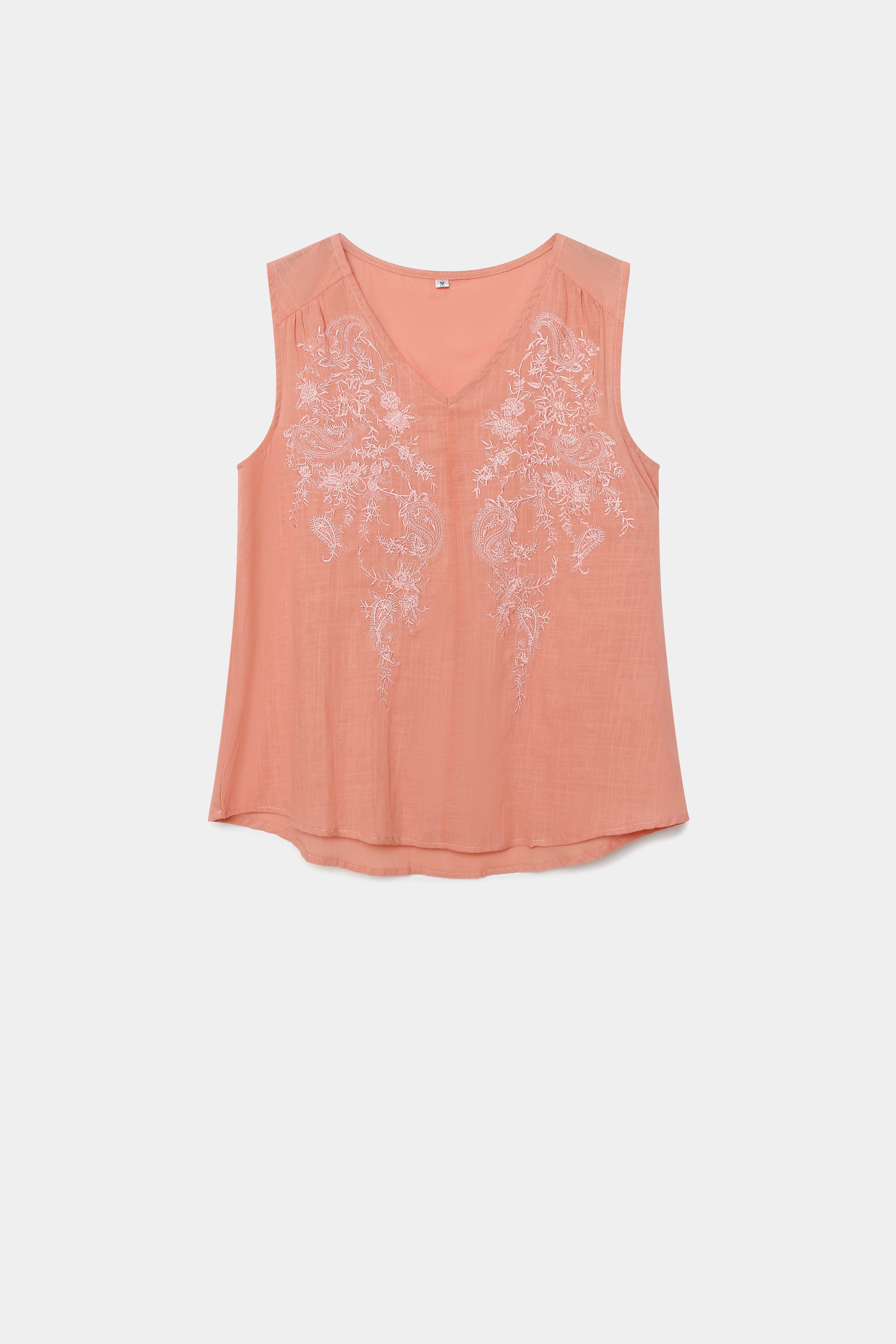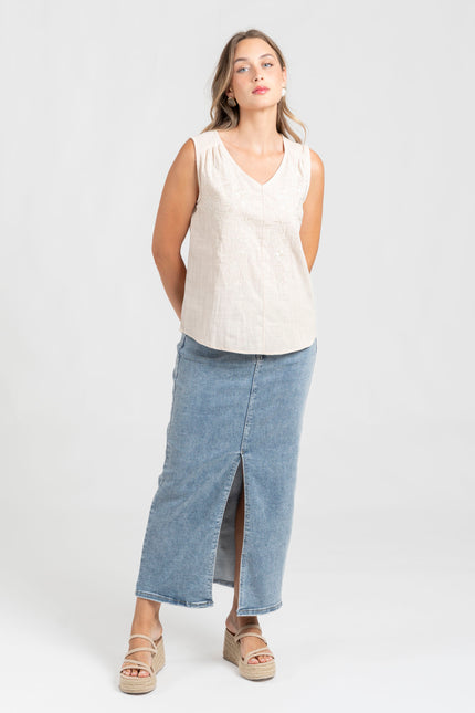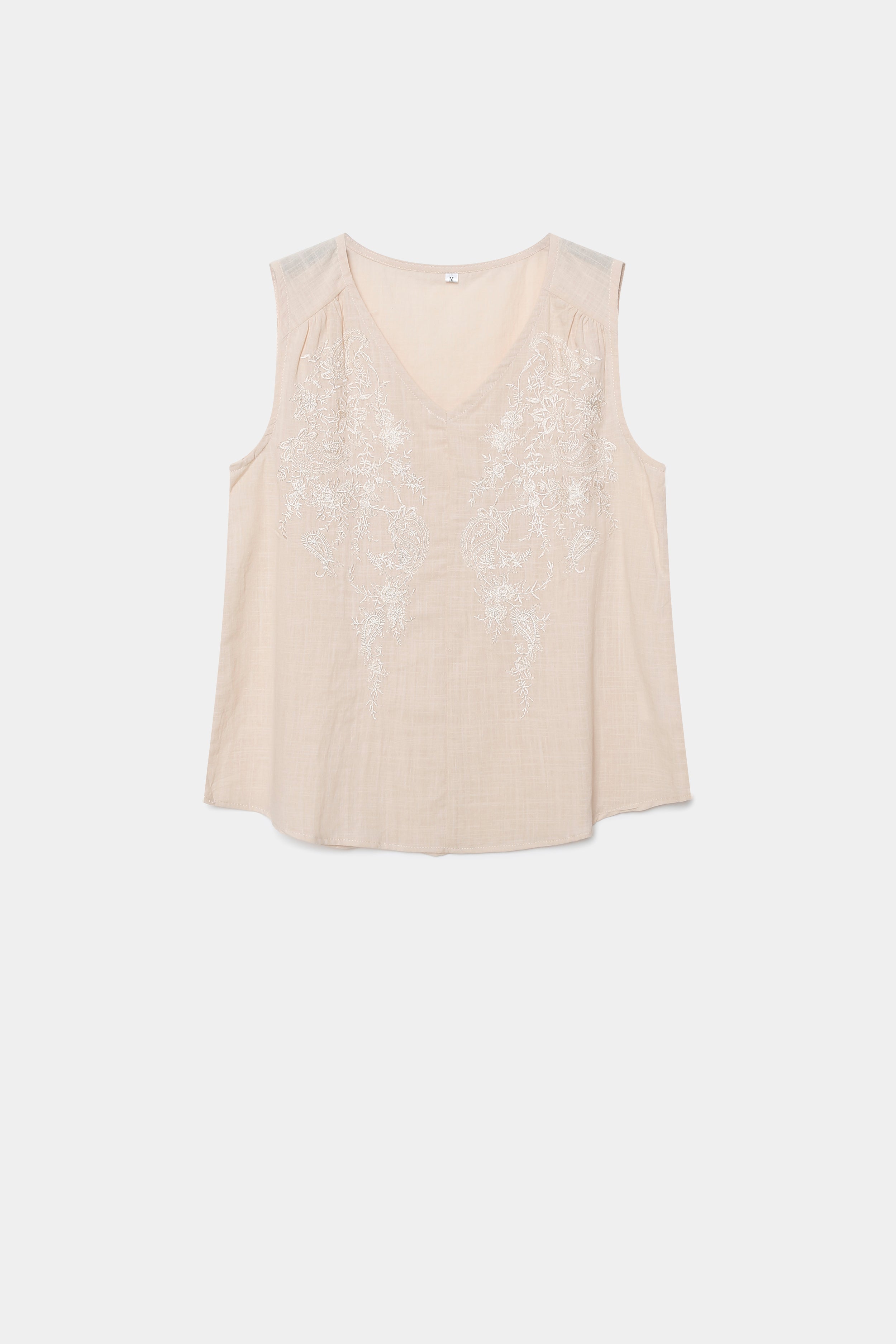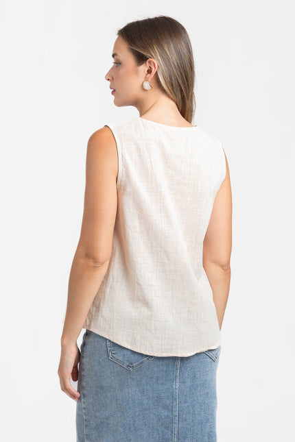 Tejido de algodón. Diseño recto. Cuello pico. Manga sisa. Detalle bordados.