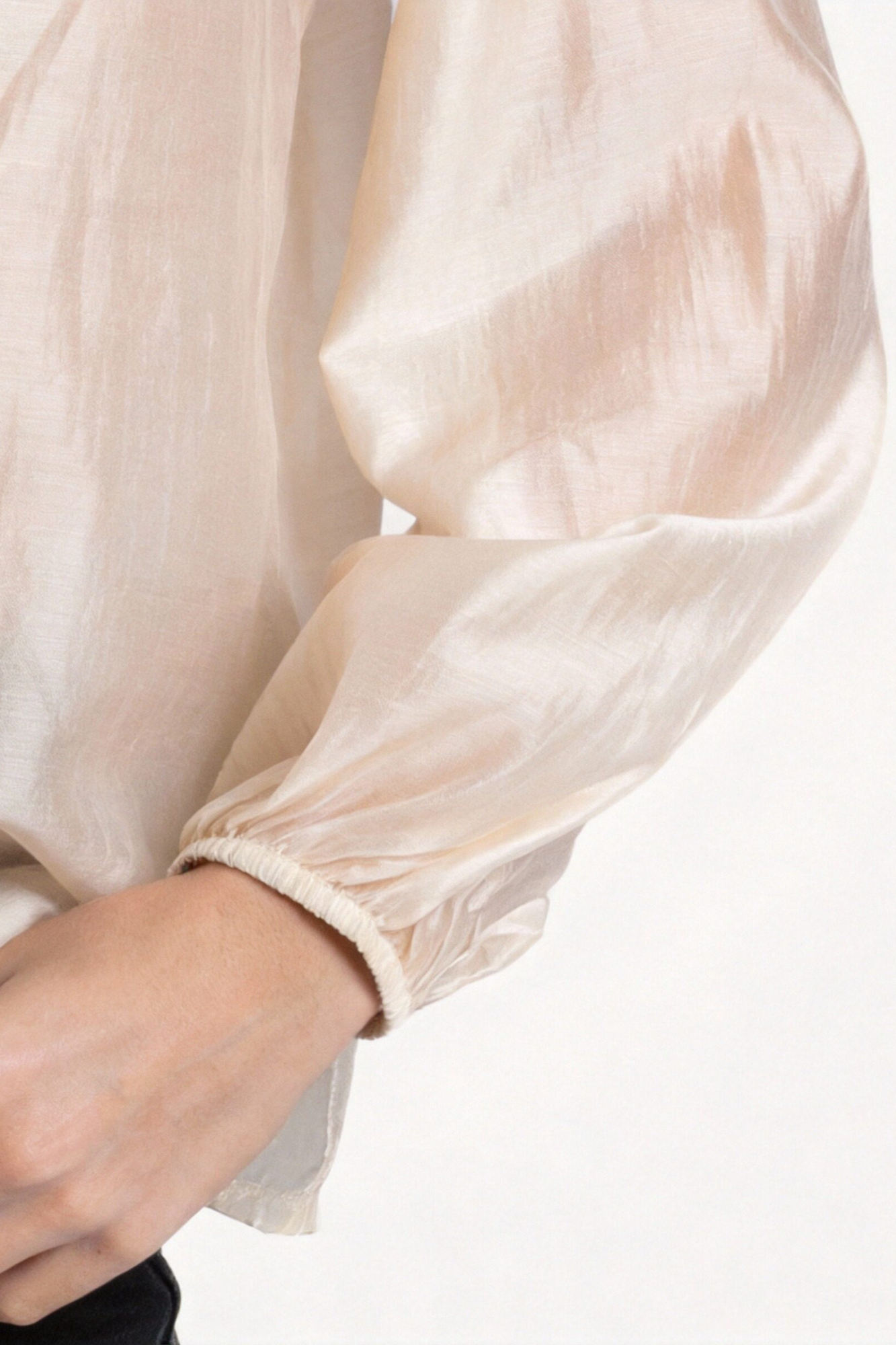 Tejido estilo gasa. Cuello redondo con lazada. Manga larga. Detalle de capas.