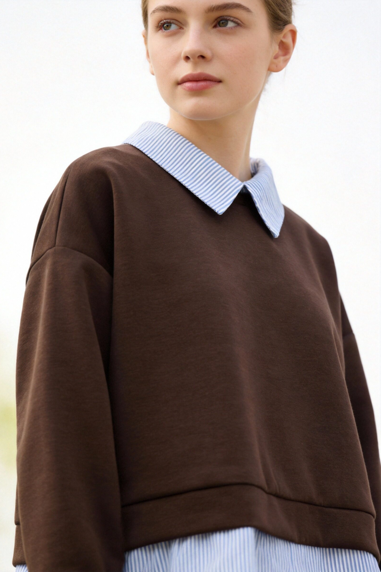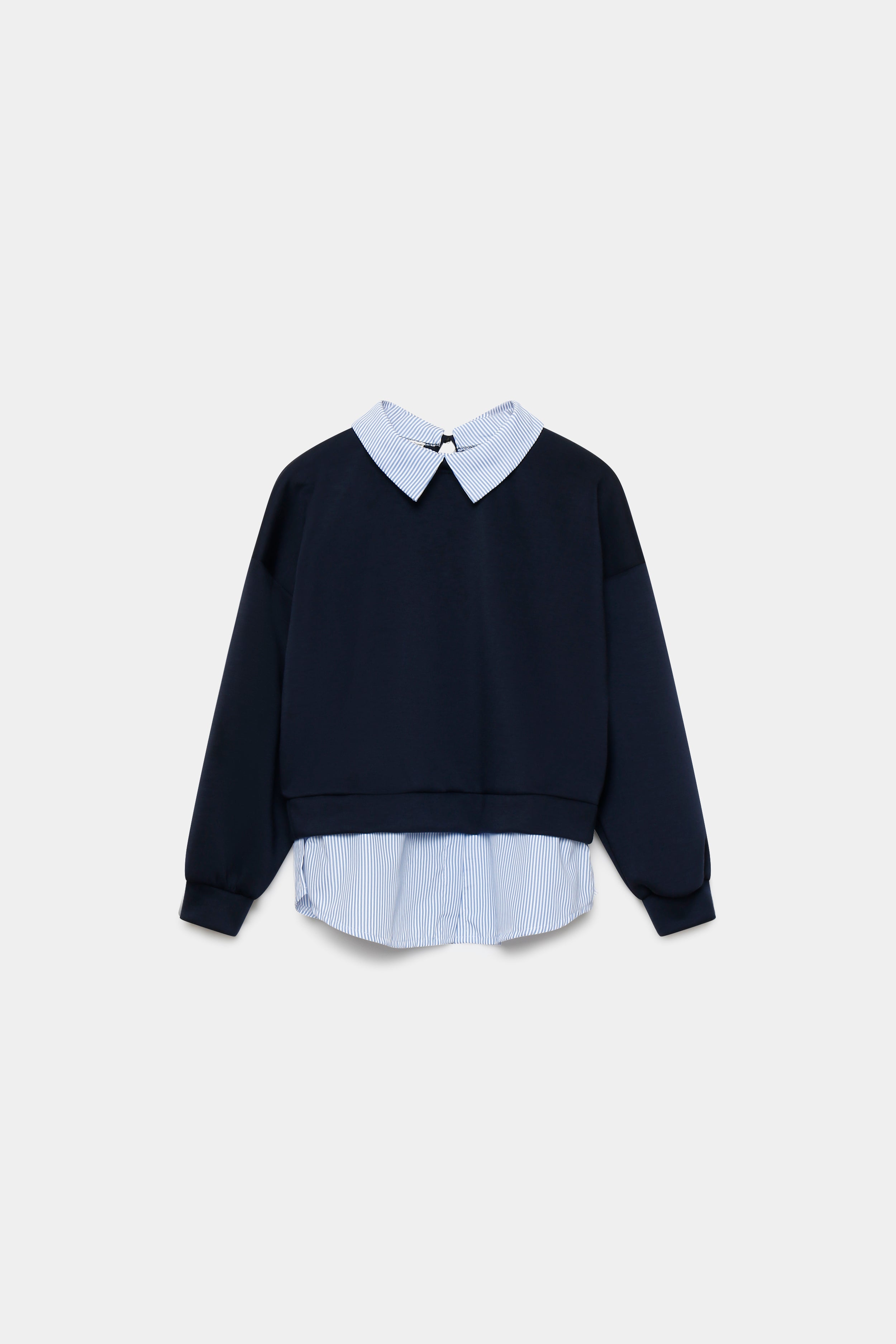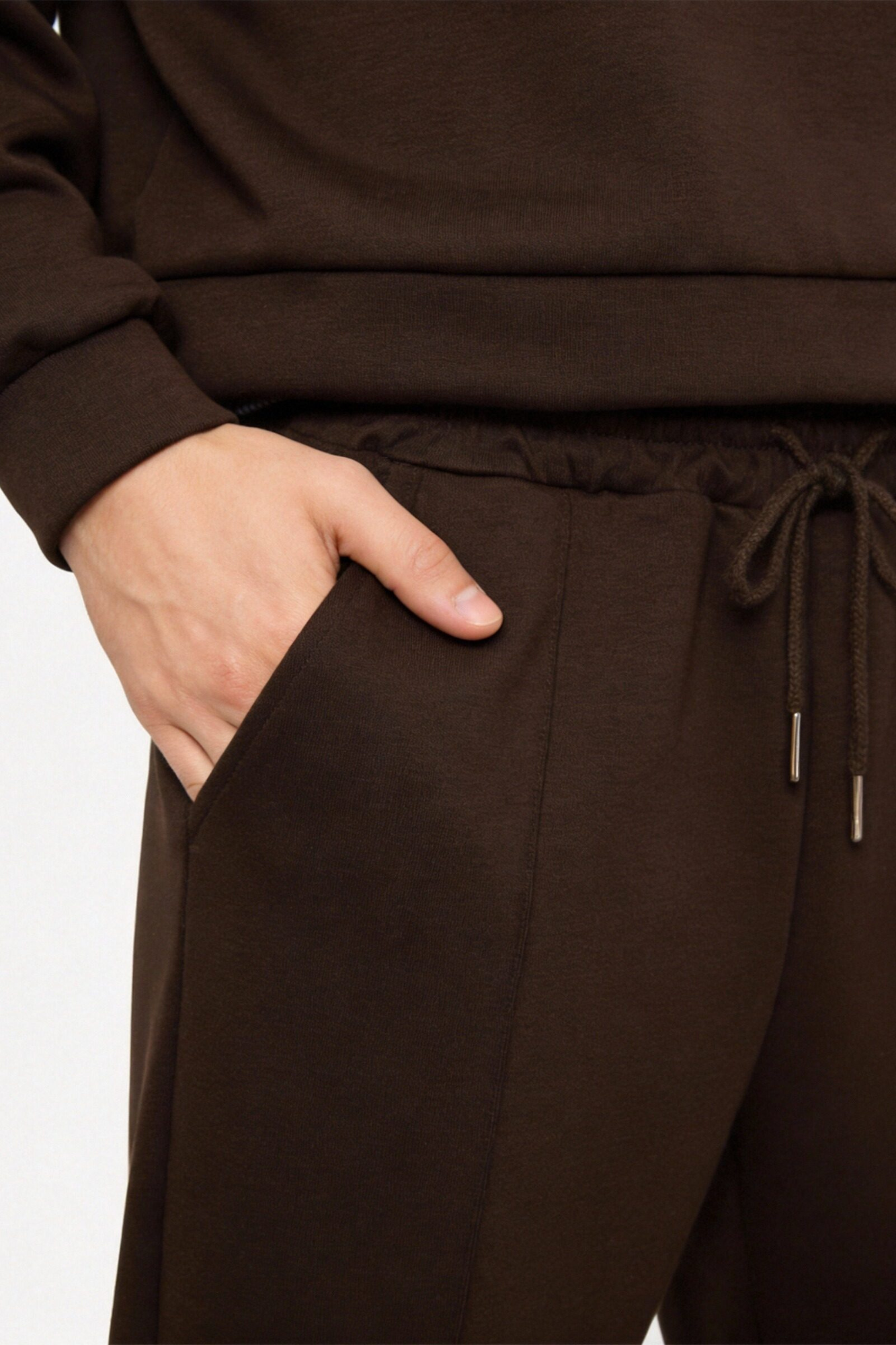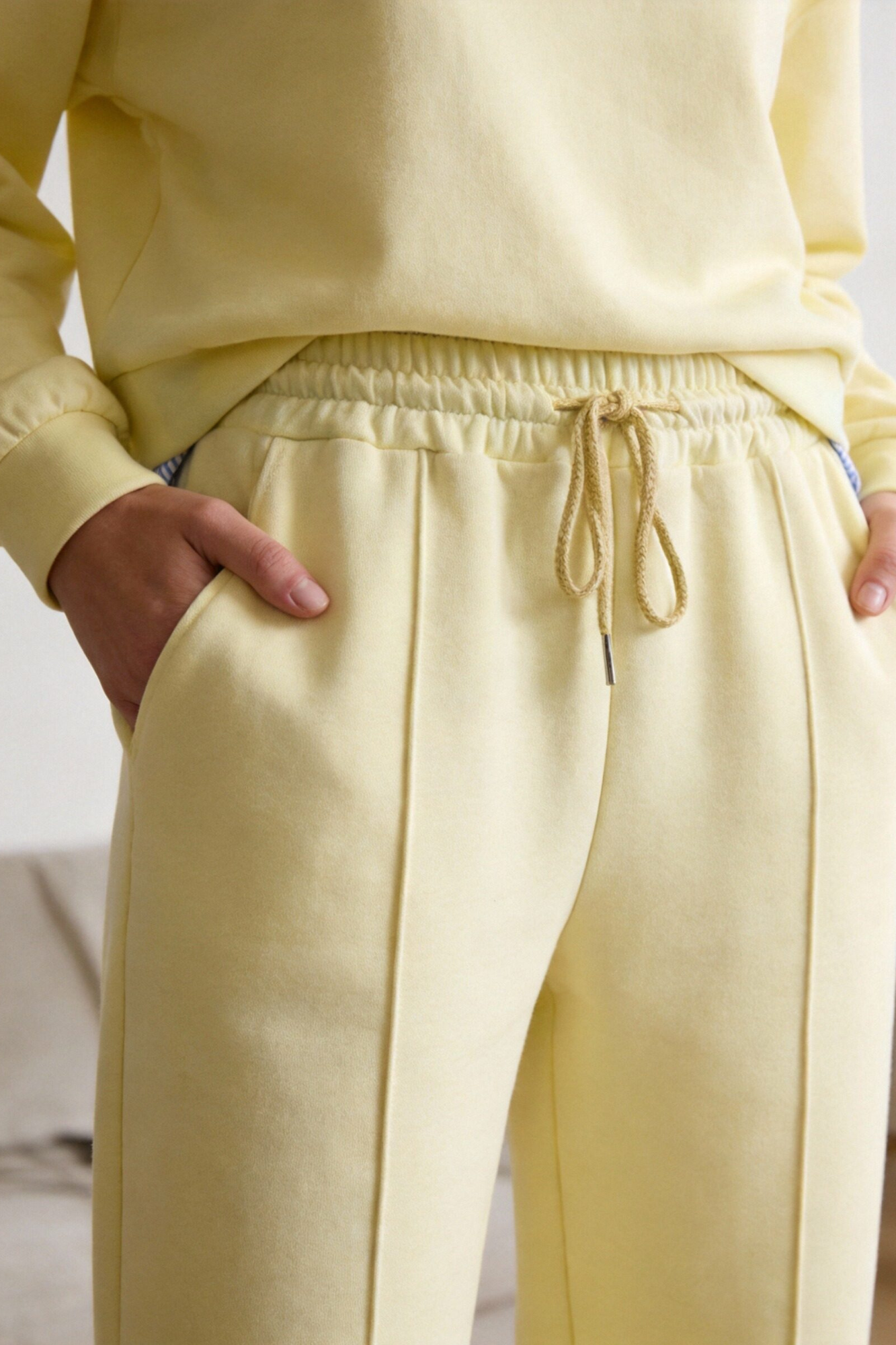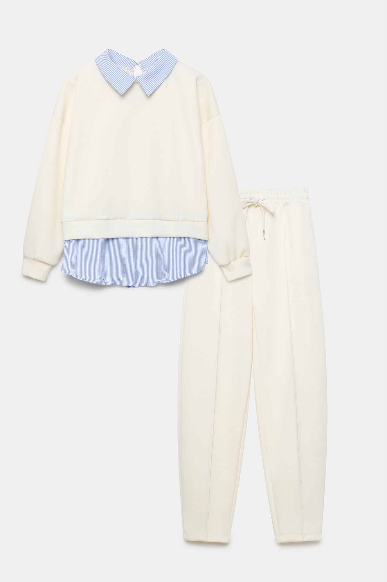 Tejido efecto felpa. Cuello redondo con solapa combinada. Manga larga. Pantalón de tiro alto. Bolsillos laterales. Cintura elástica y ajustable.