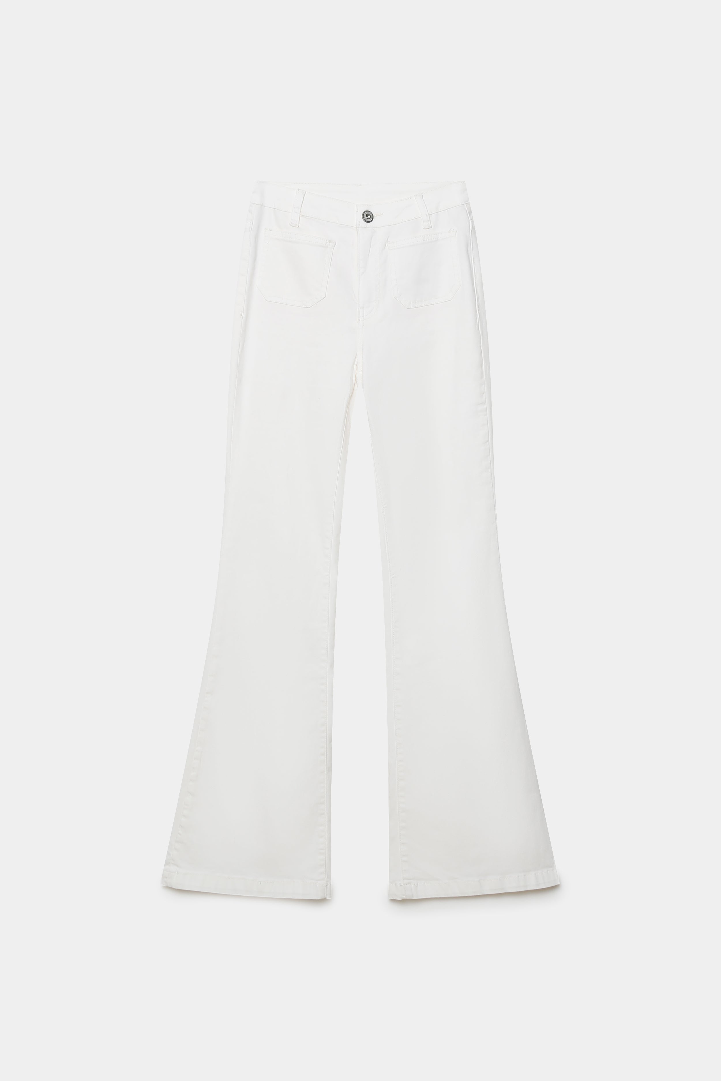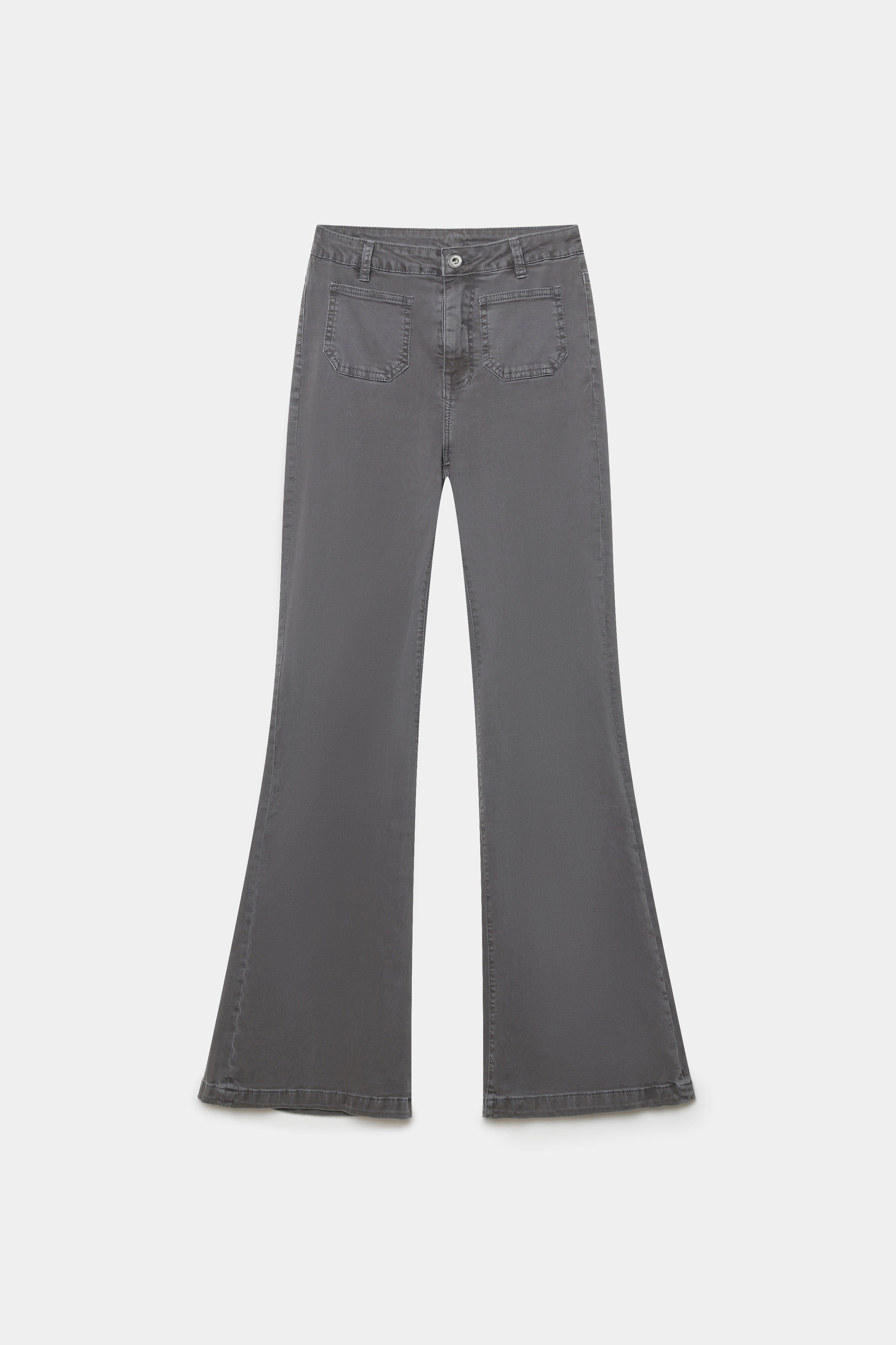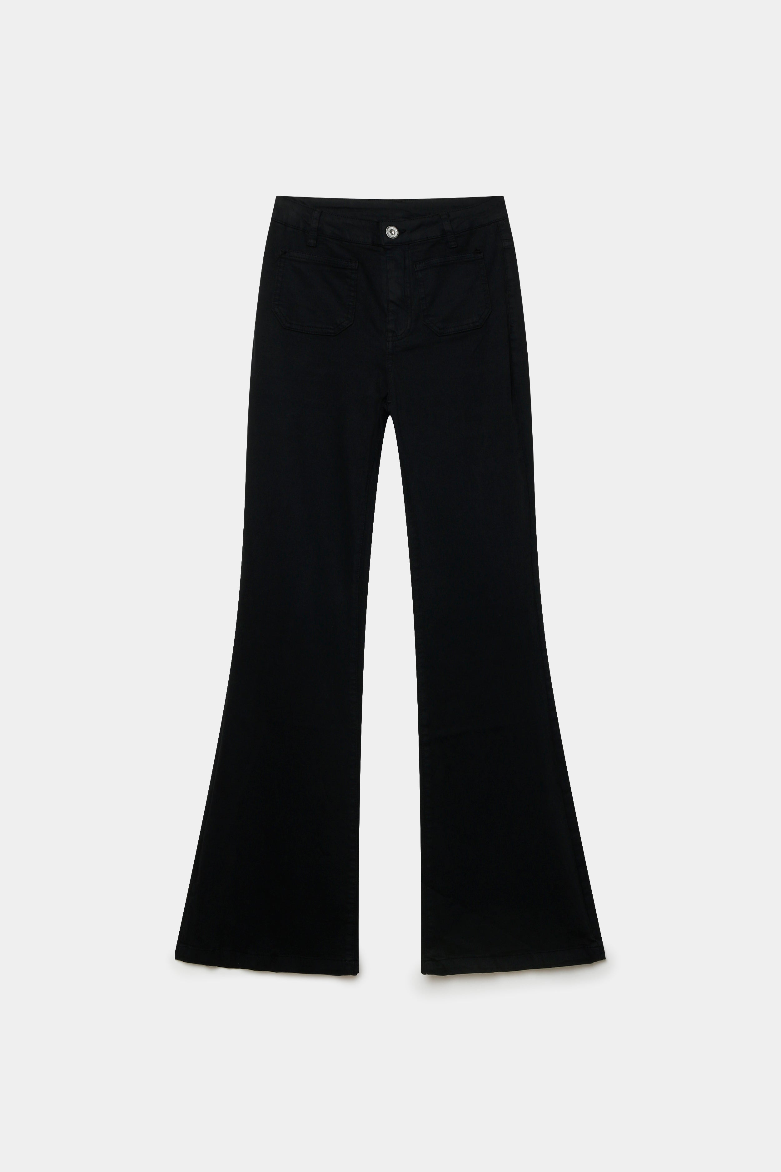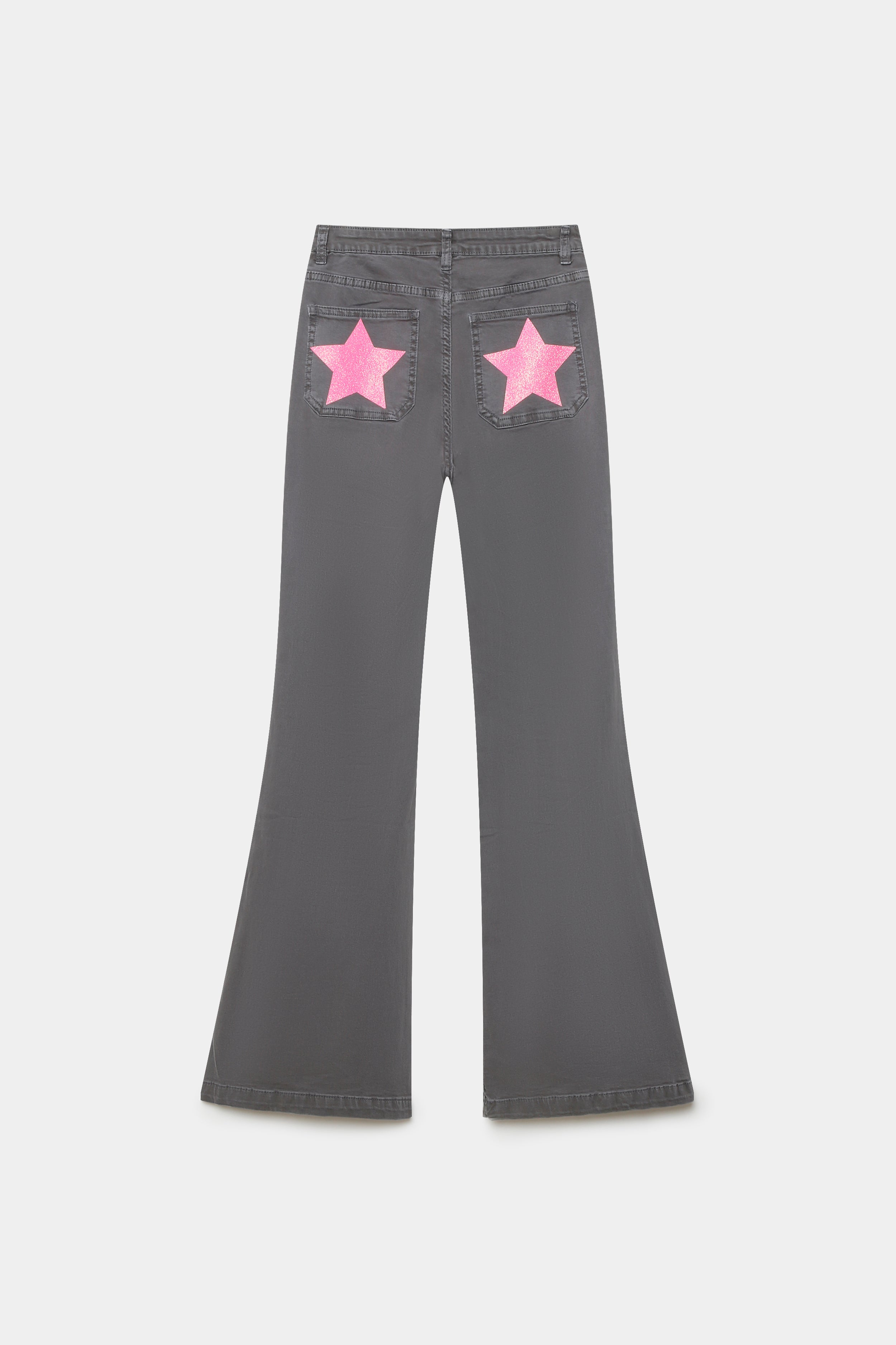 Tejido tejano. Tiro alto. Cuatro bolsillos. Detalle de estrellas en la trasera. Diseño flare.