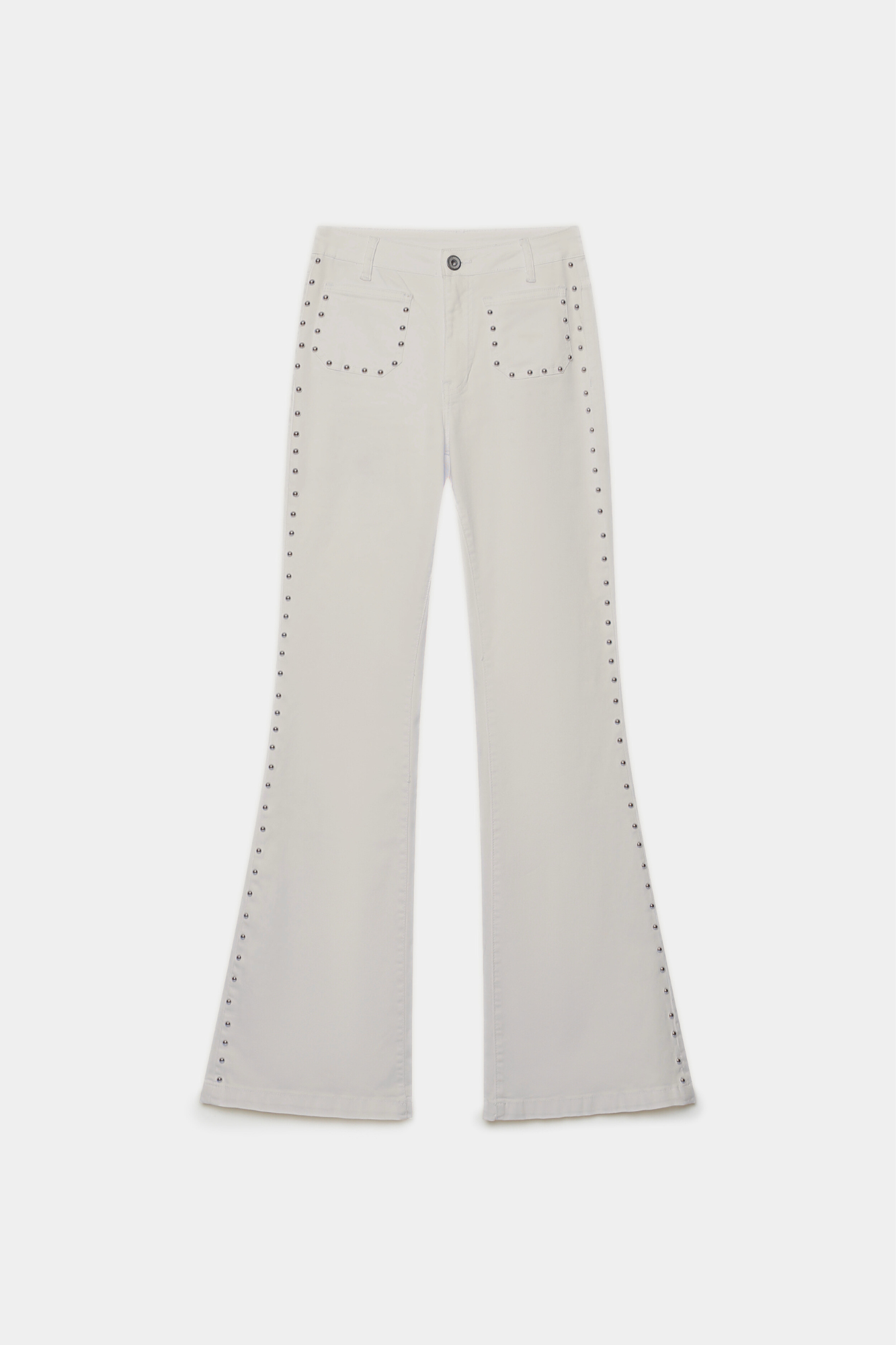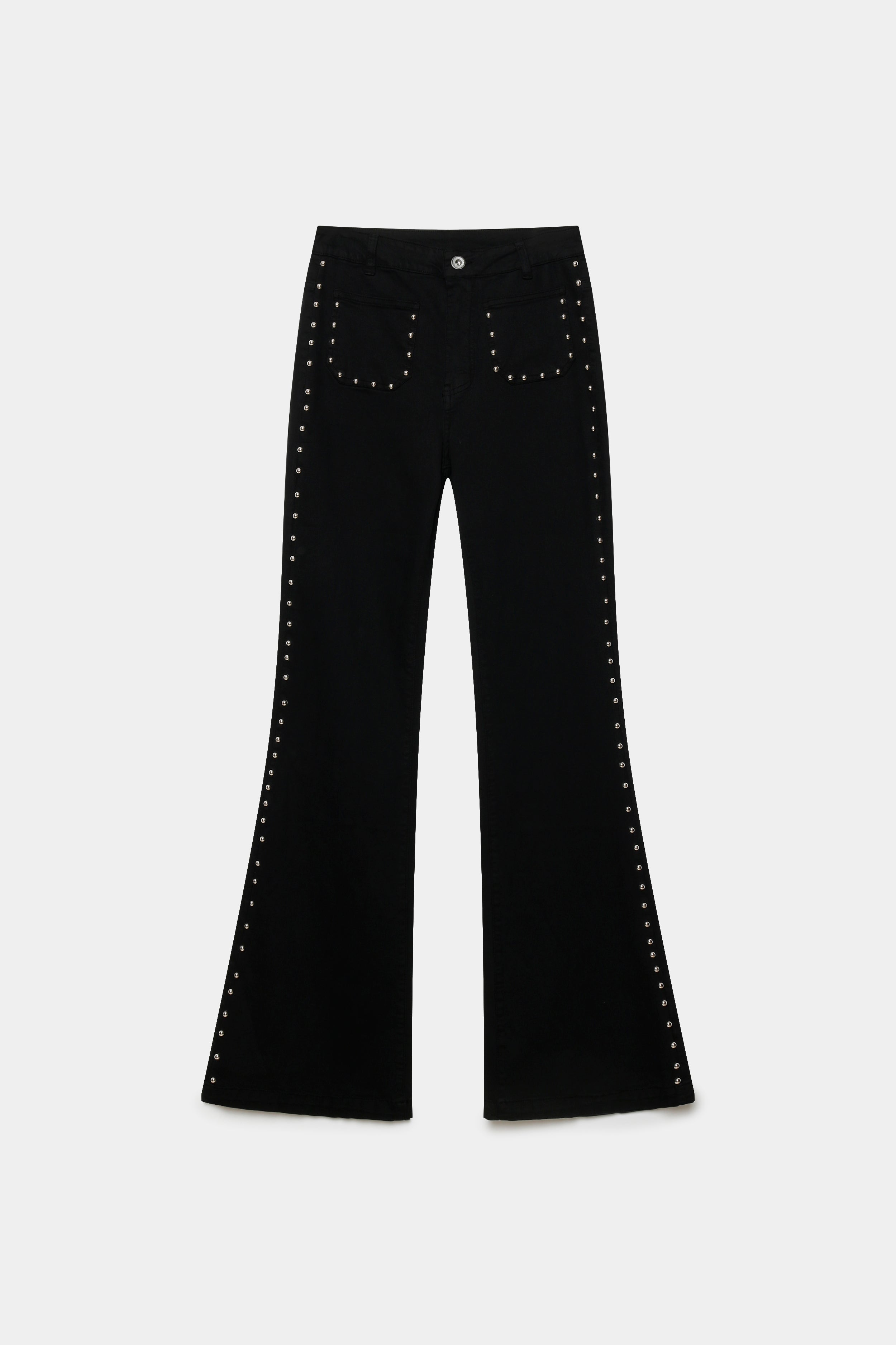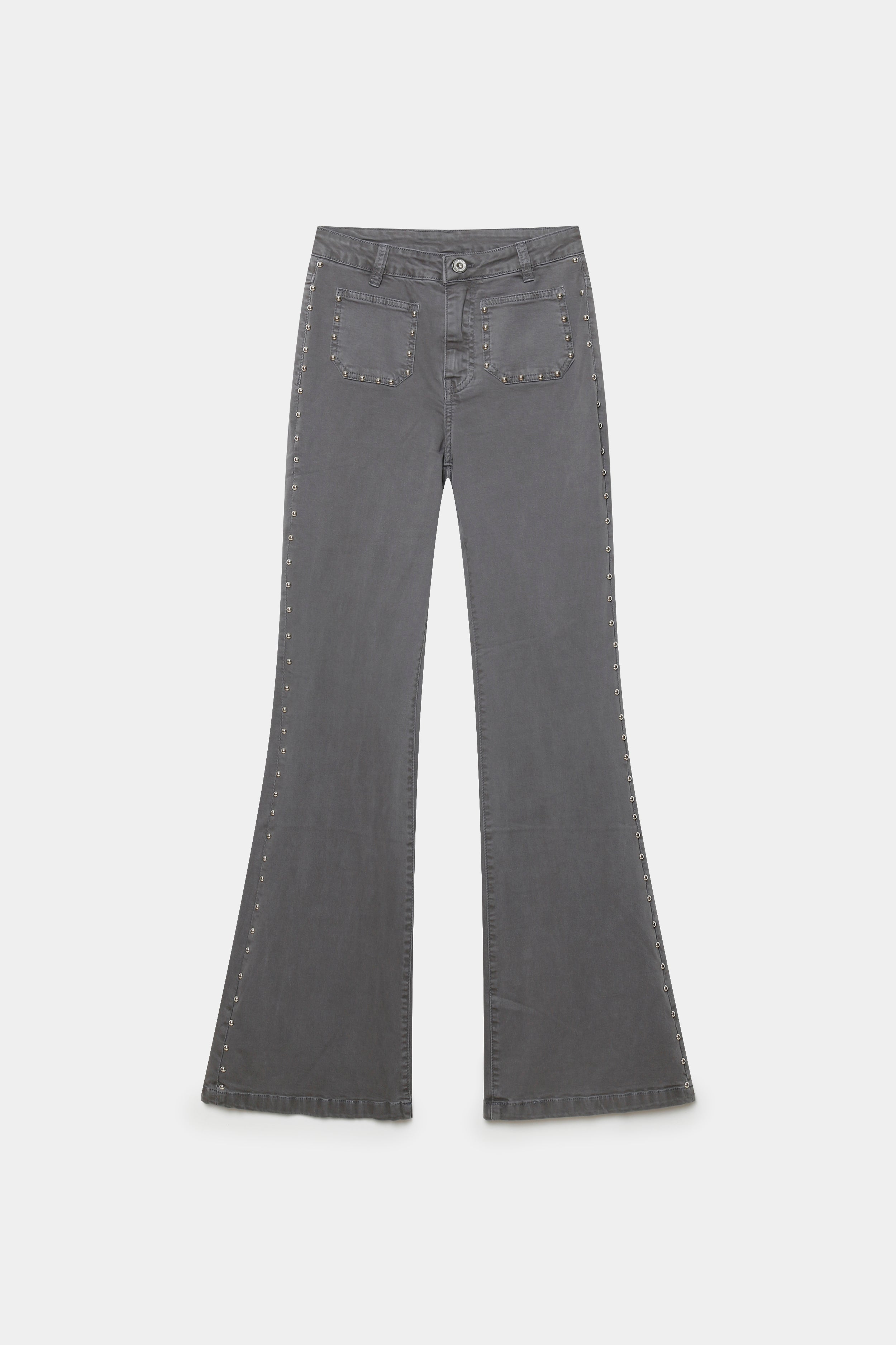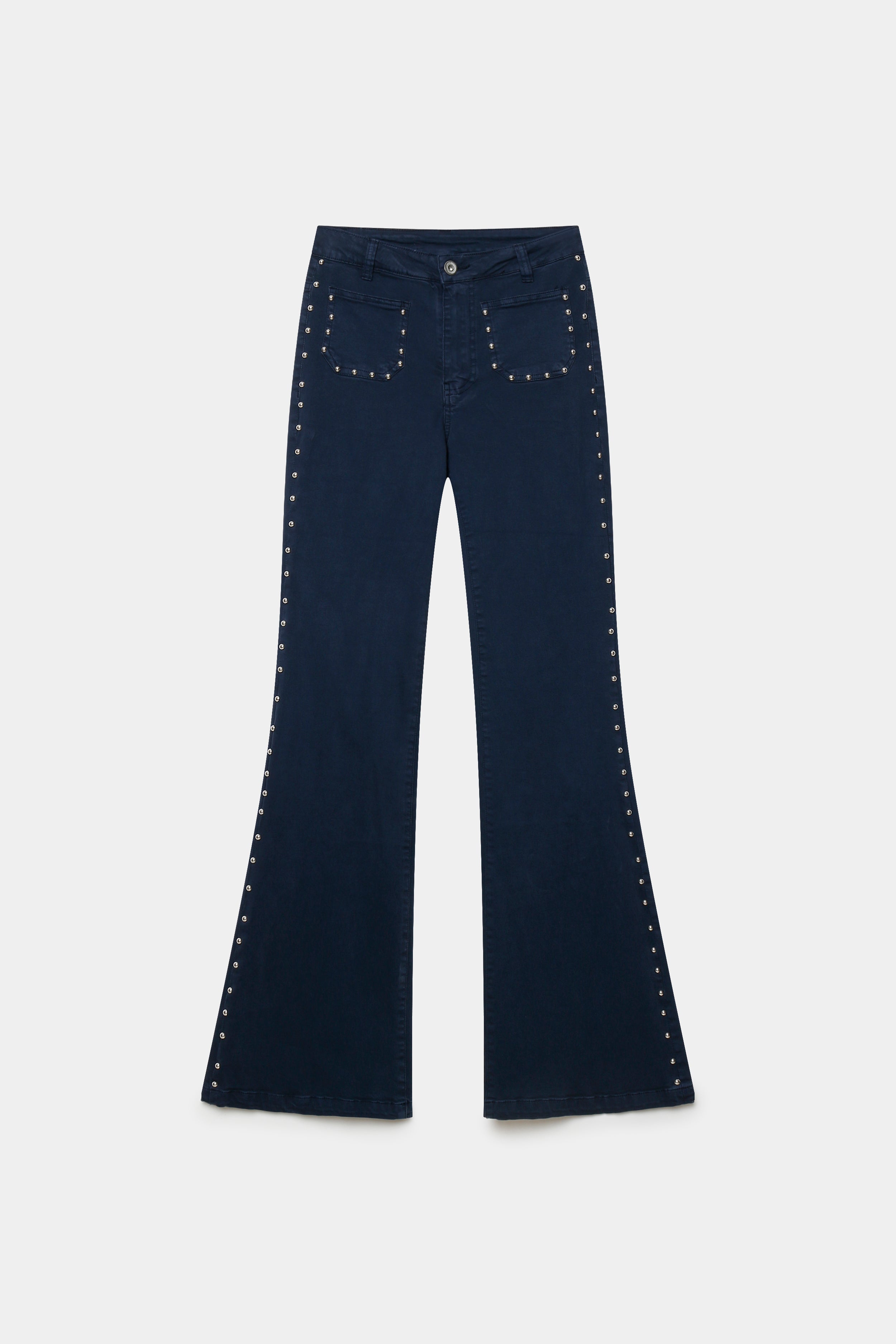 Tejido tejano. Tiro alto. Cuatro bolsillos. Detalle de tachuelas. Diseño flare.