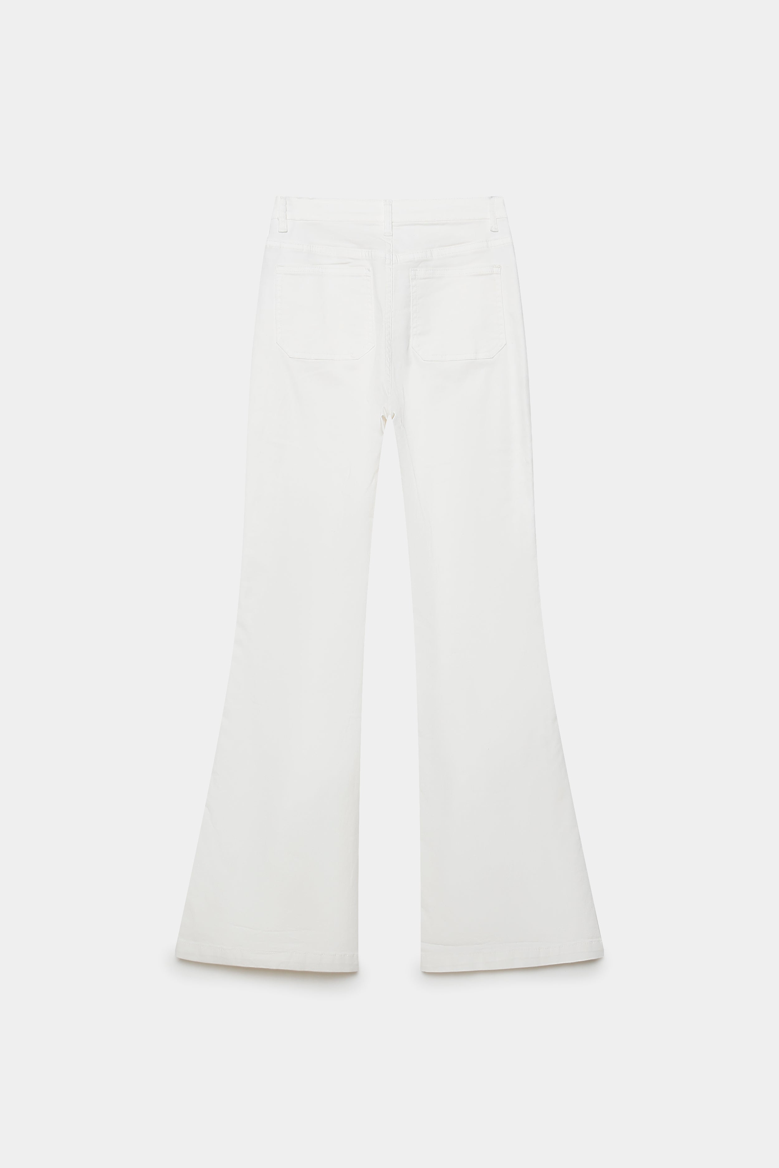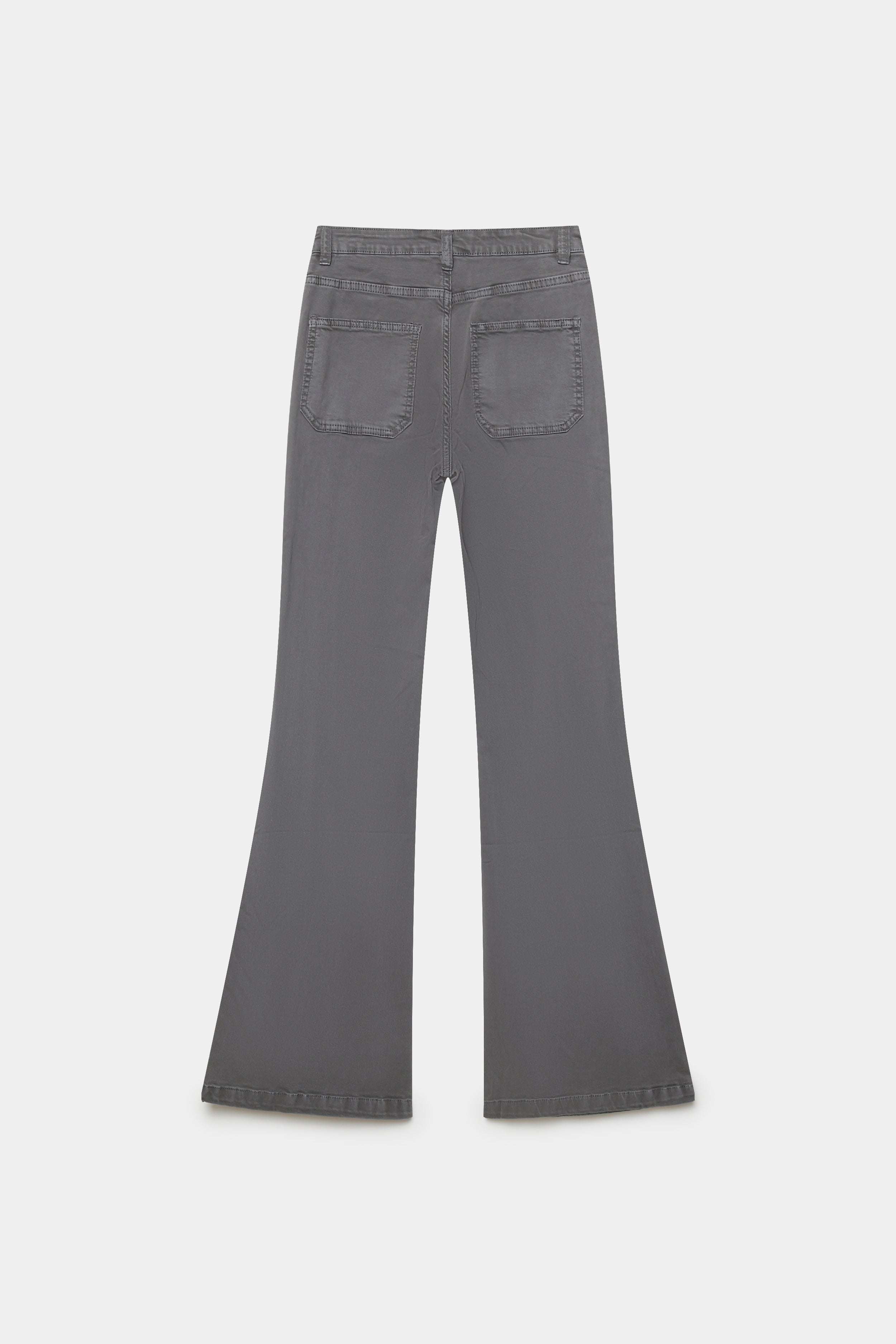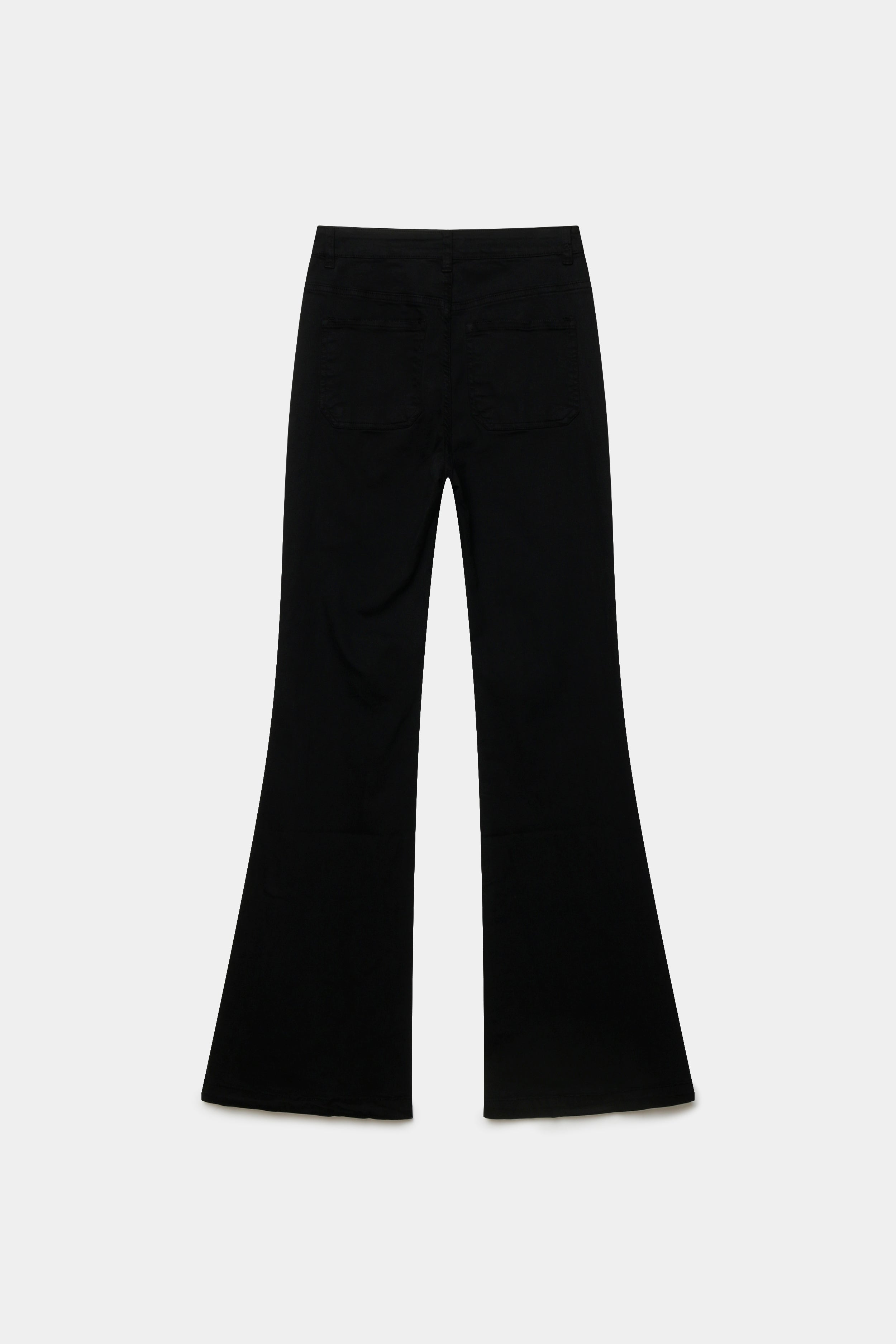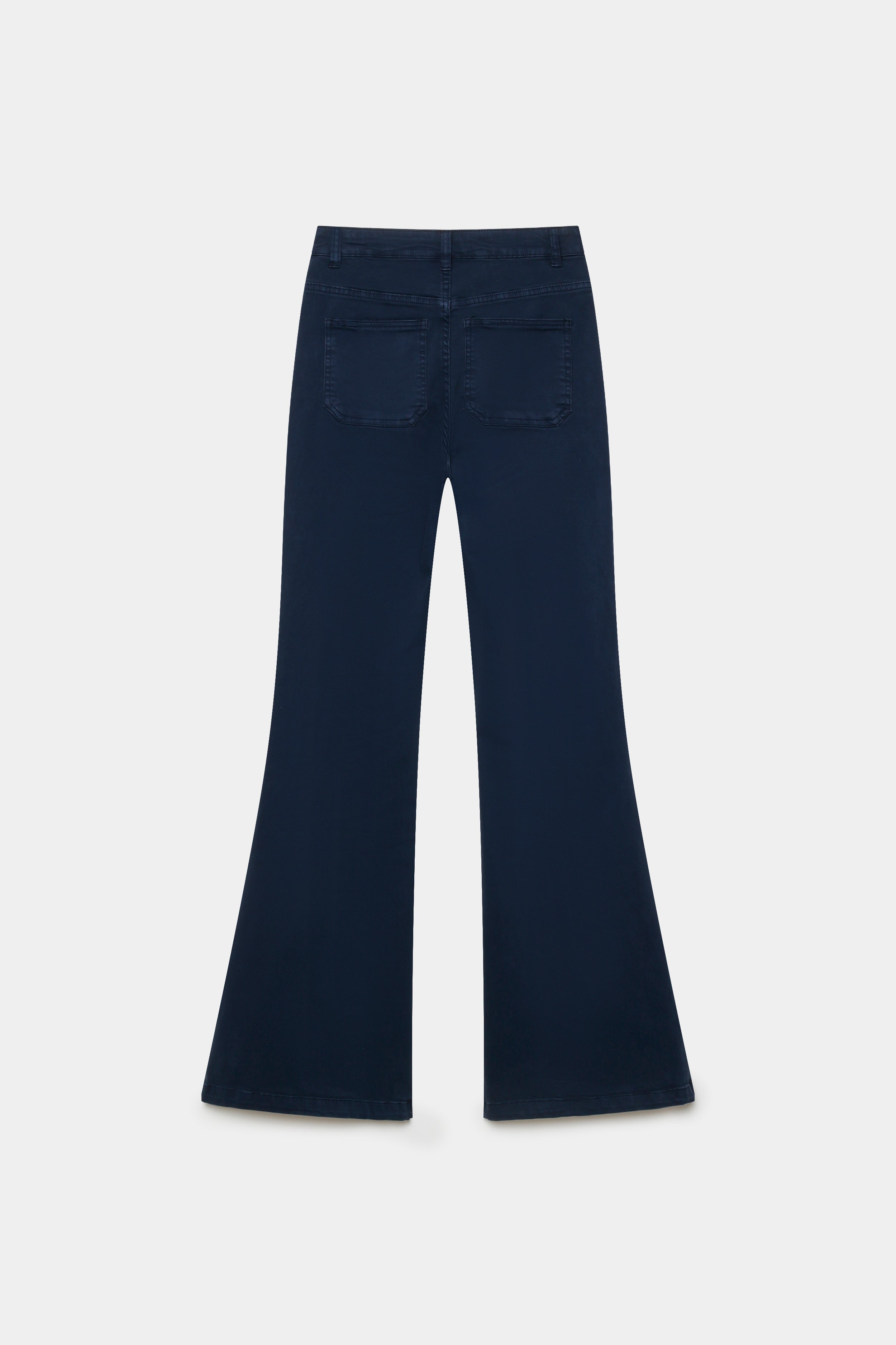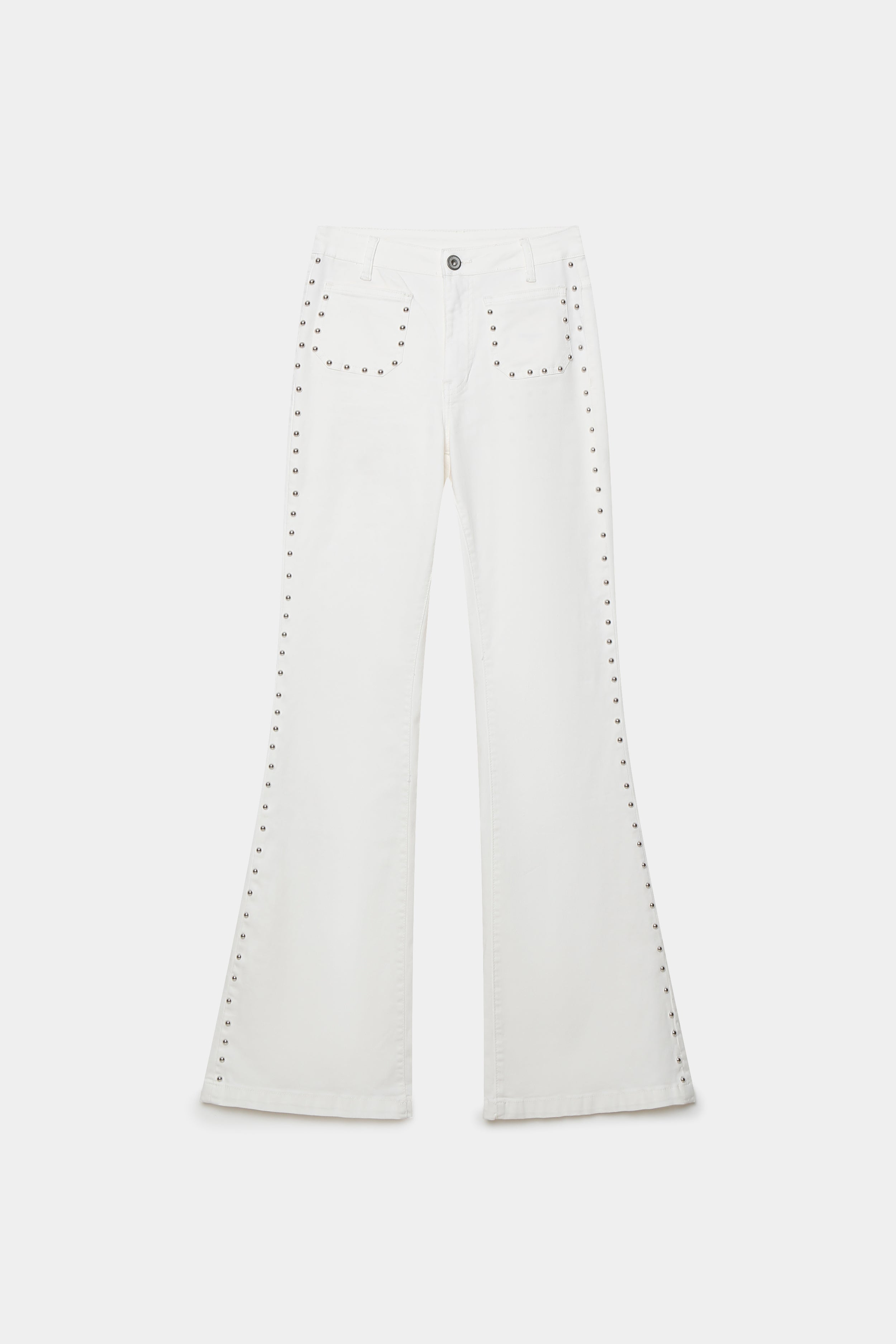 Tejido tejano. Tiro alto. Cuatro bolsillos. Detalle de tachuelas. Diseño flare.