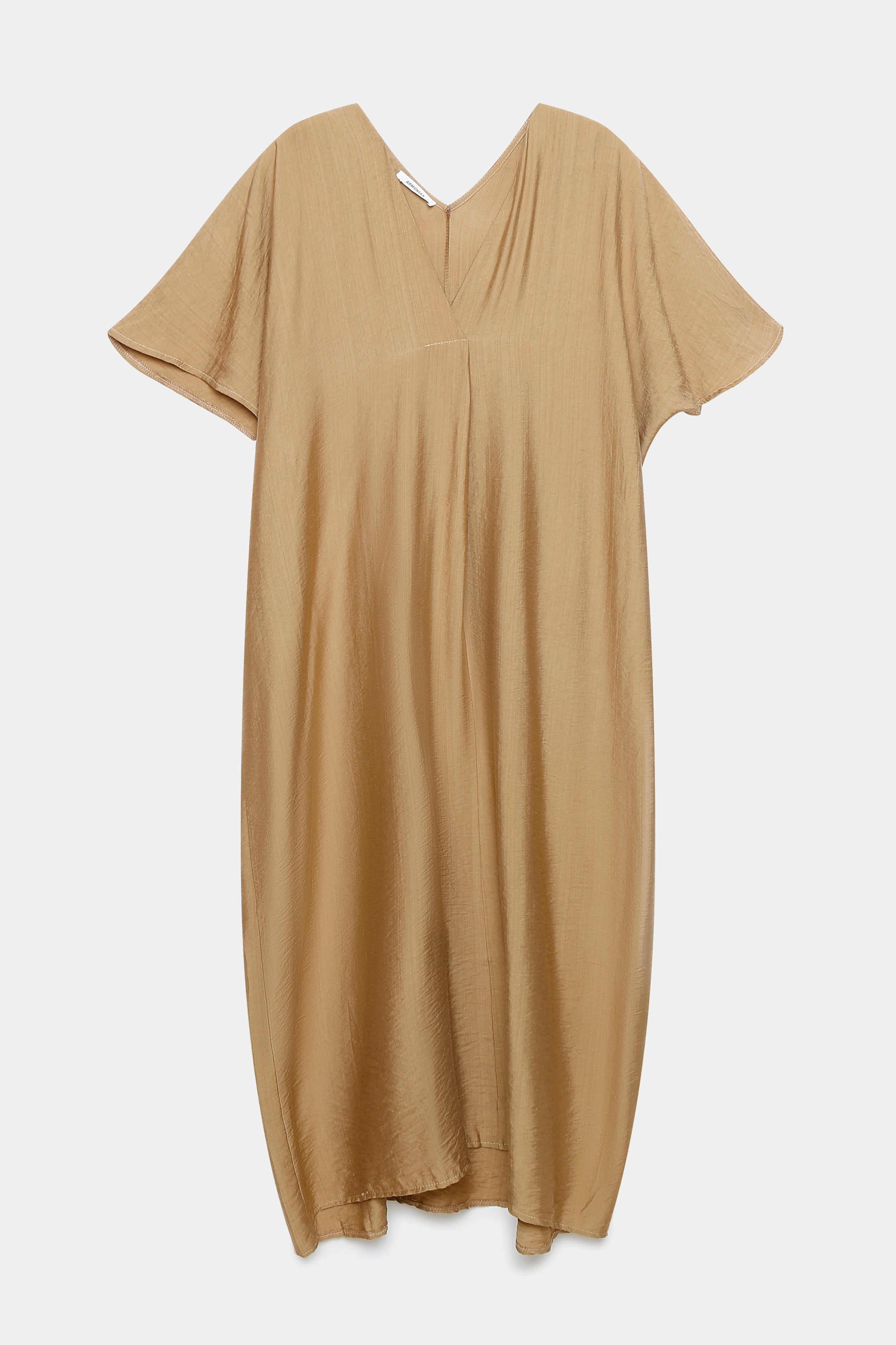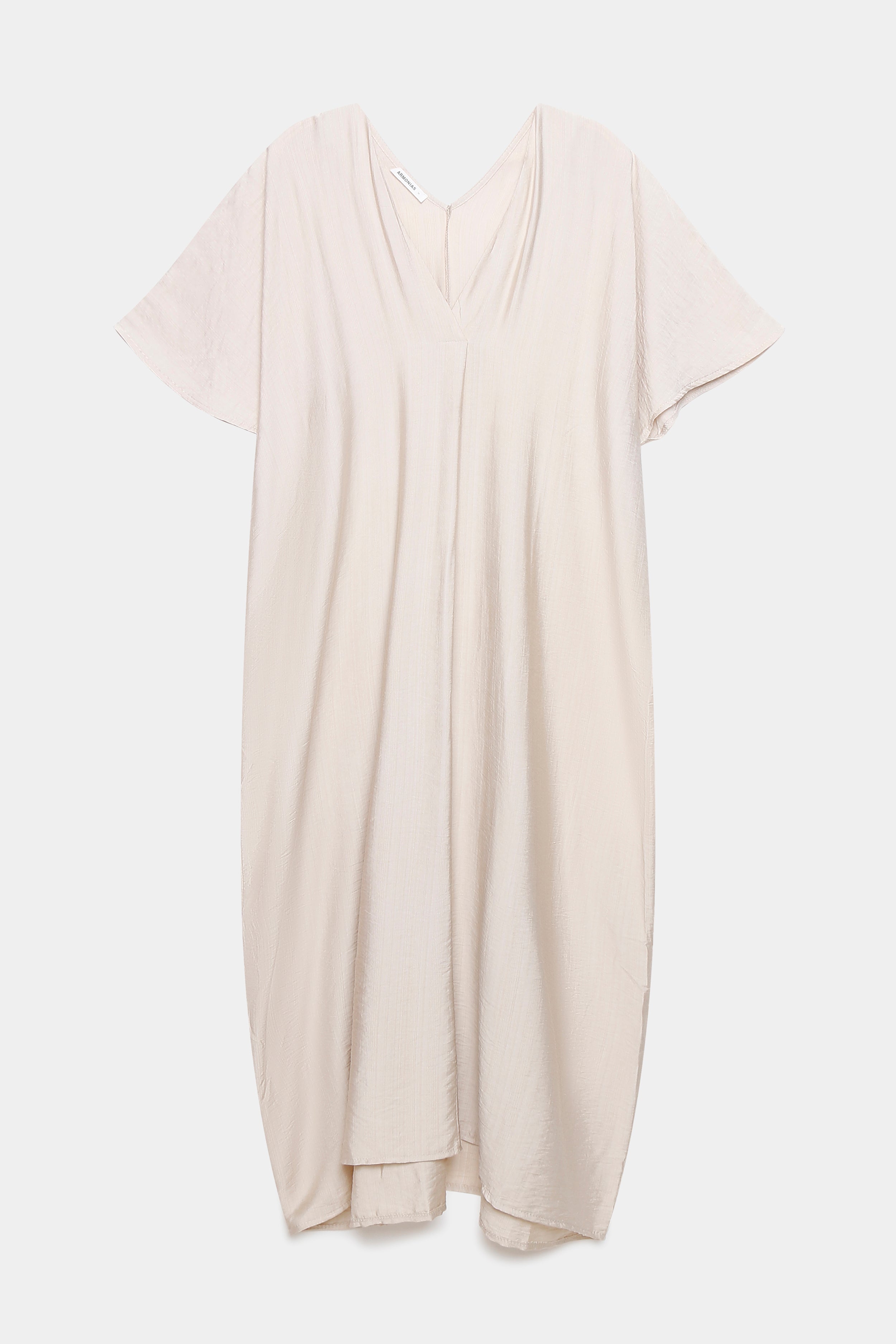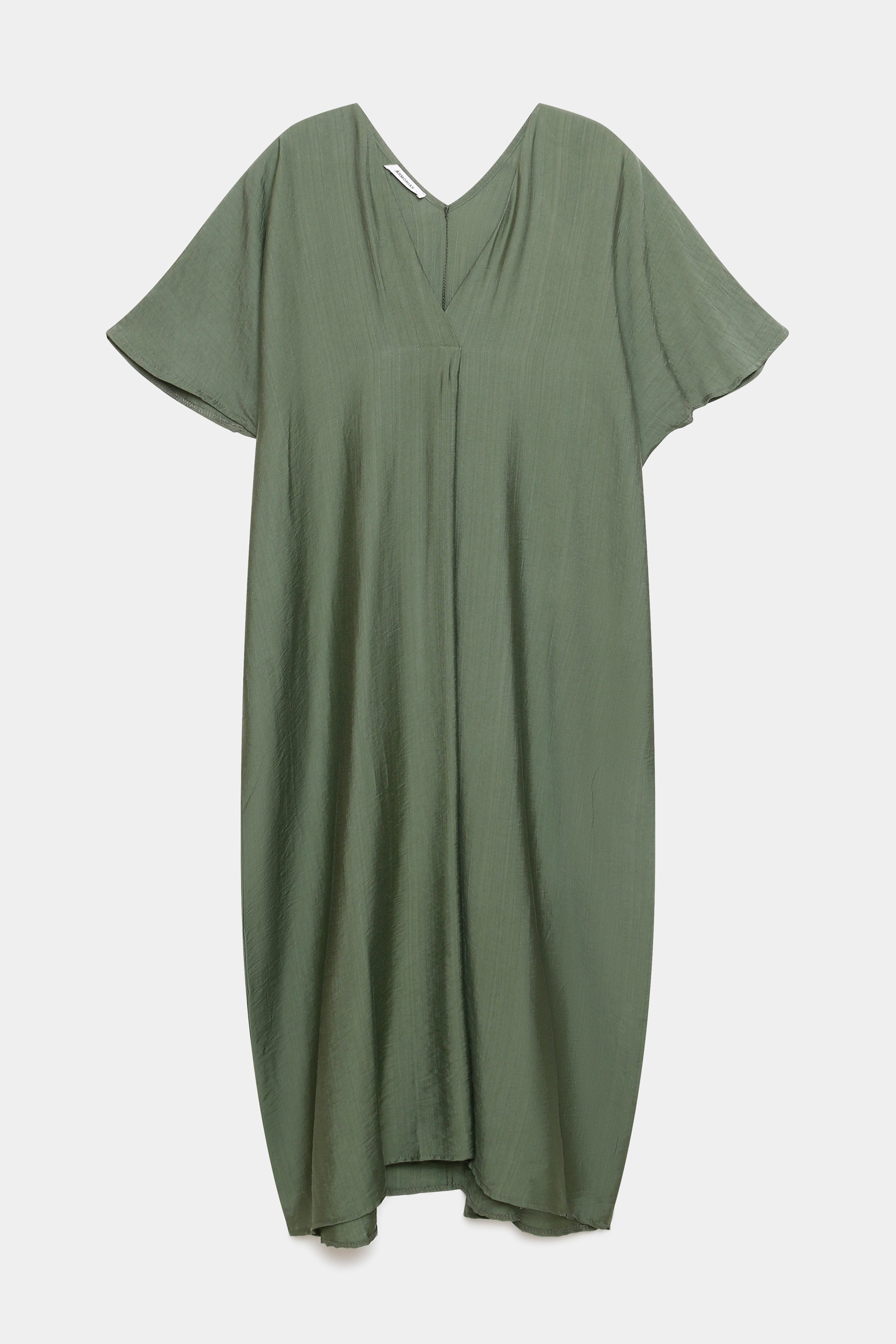 Tejido fino fluido. Manga corta. Escote pico. Diseño oversize. Talla única. Sisa a sisa 78cm. Largo 142cm. Desde una 44 hasta una 56.
