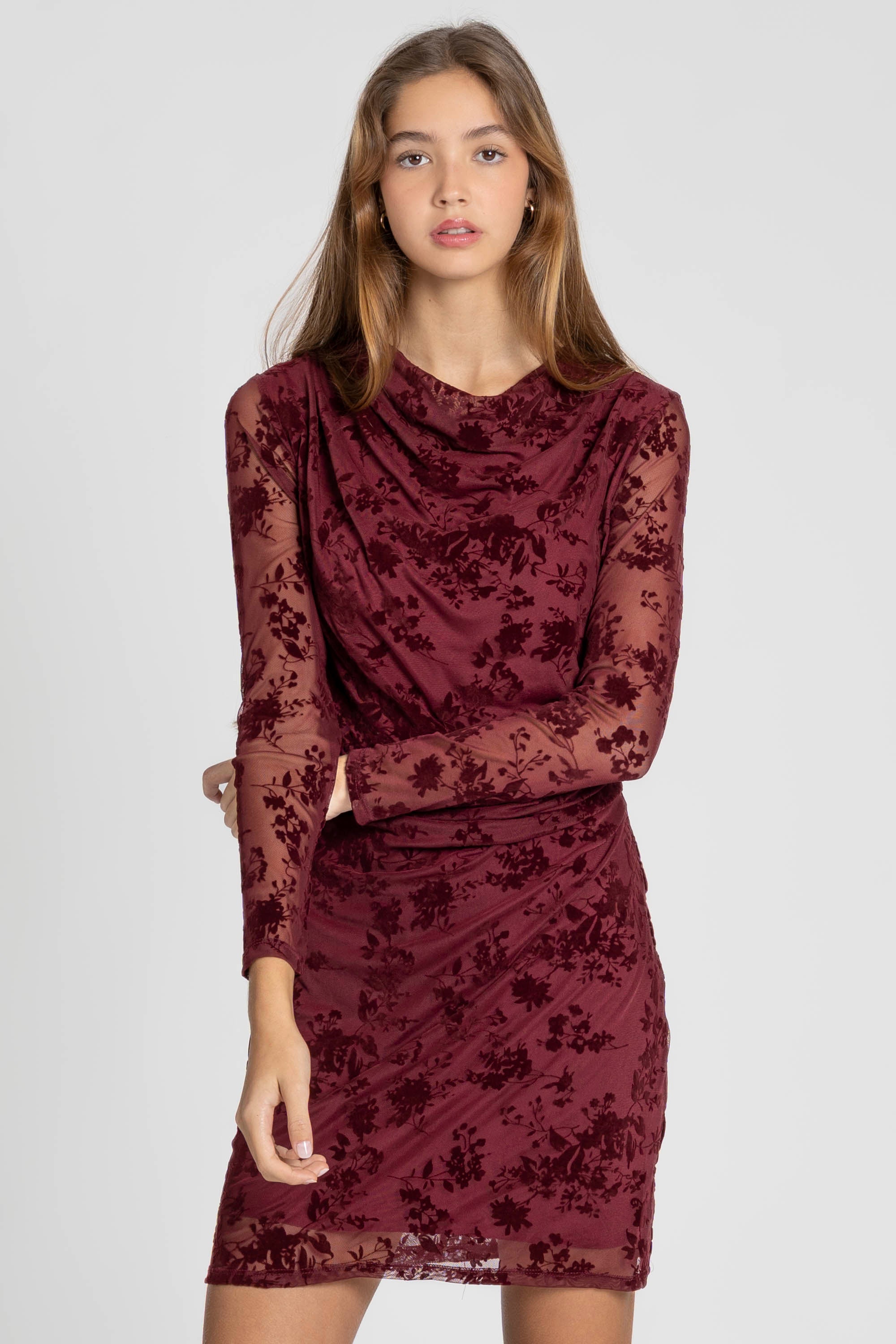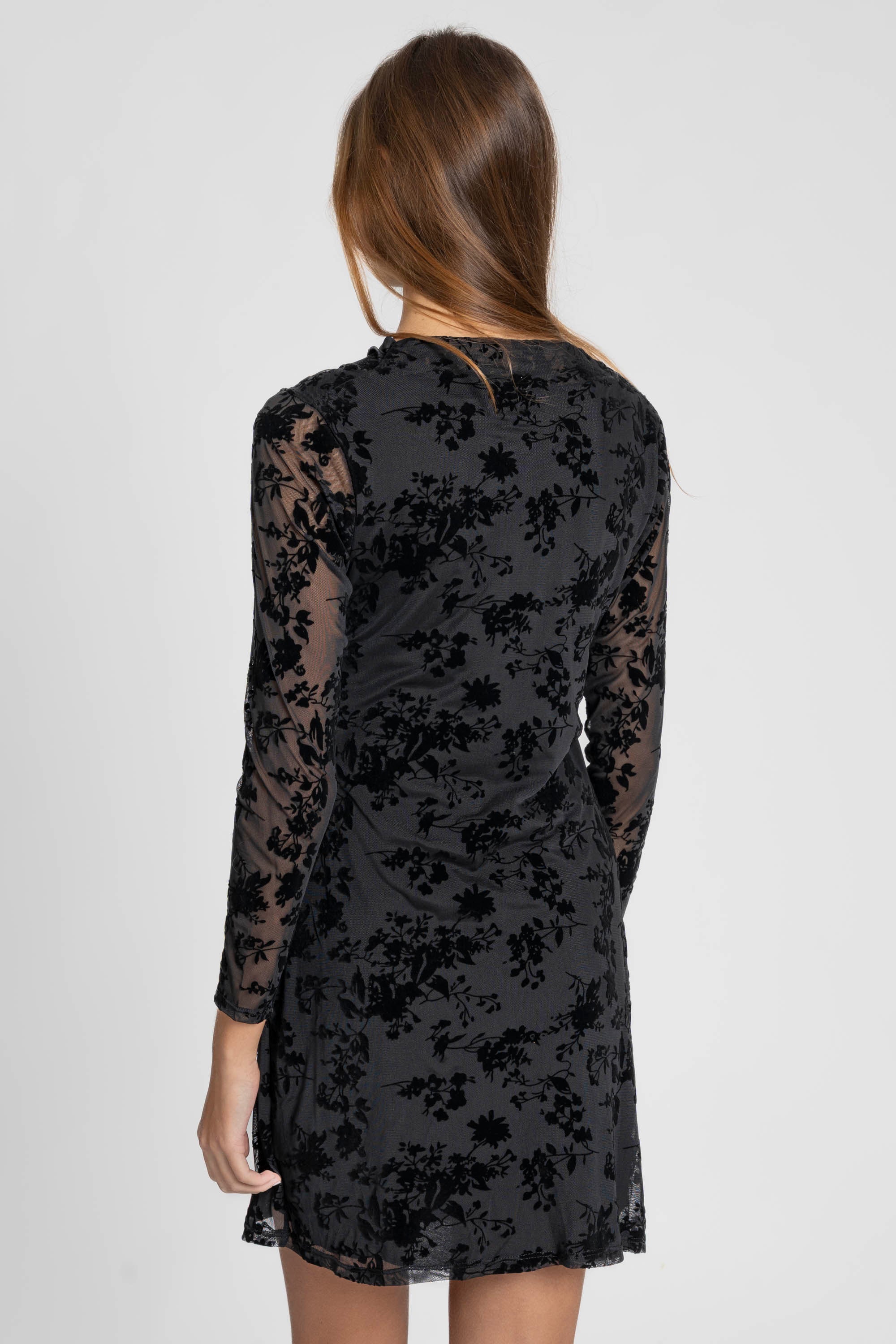 Tejido de encaje forrado. Cuello redondo. Manga larga. Diseño corto.