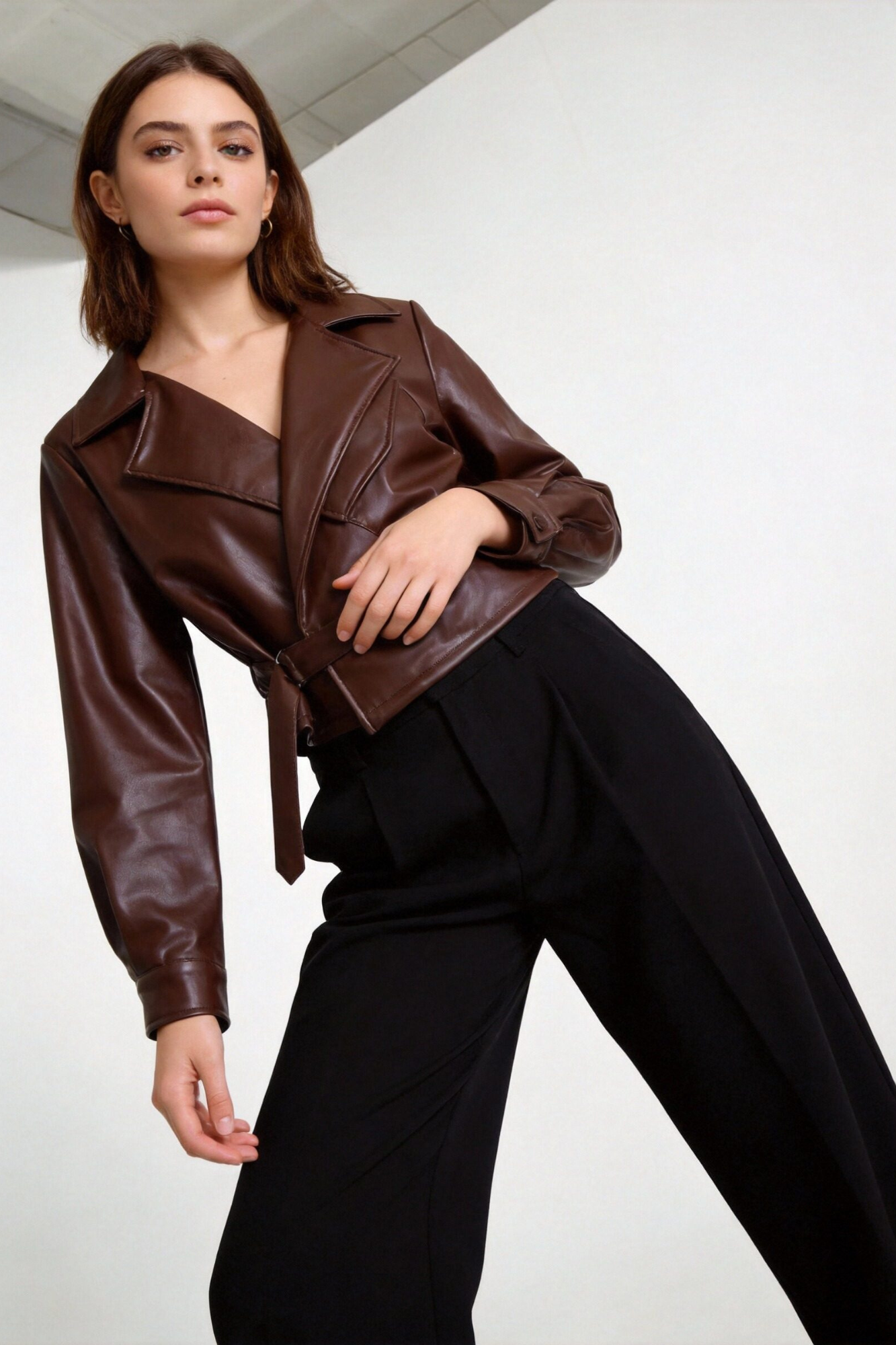 Tejido efecto polipiel. Cuello solapa. Manga larga. Cierre cruzado con lazo.