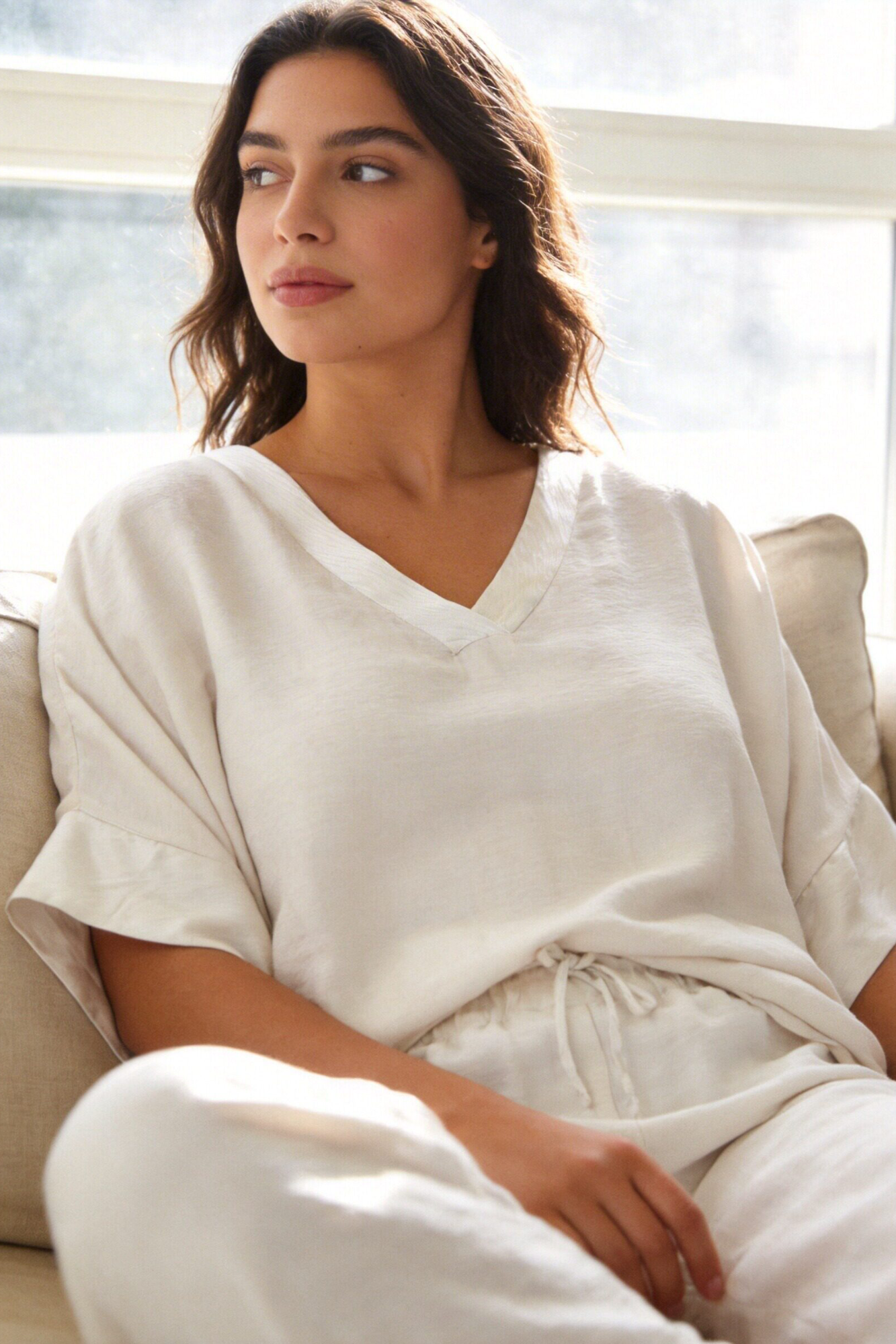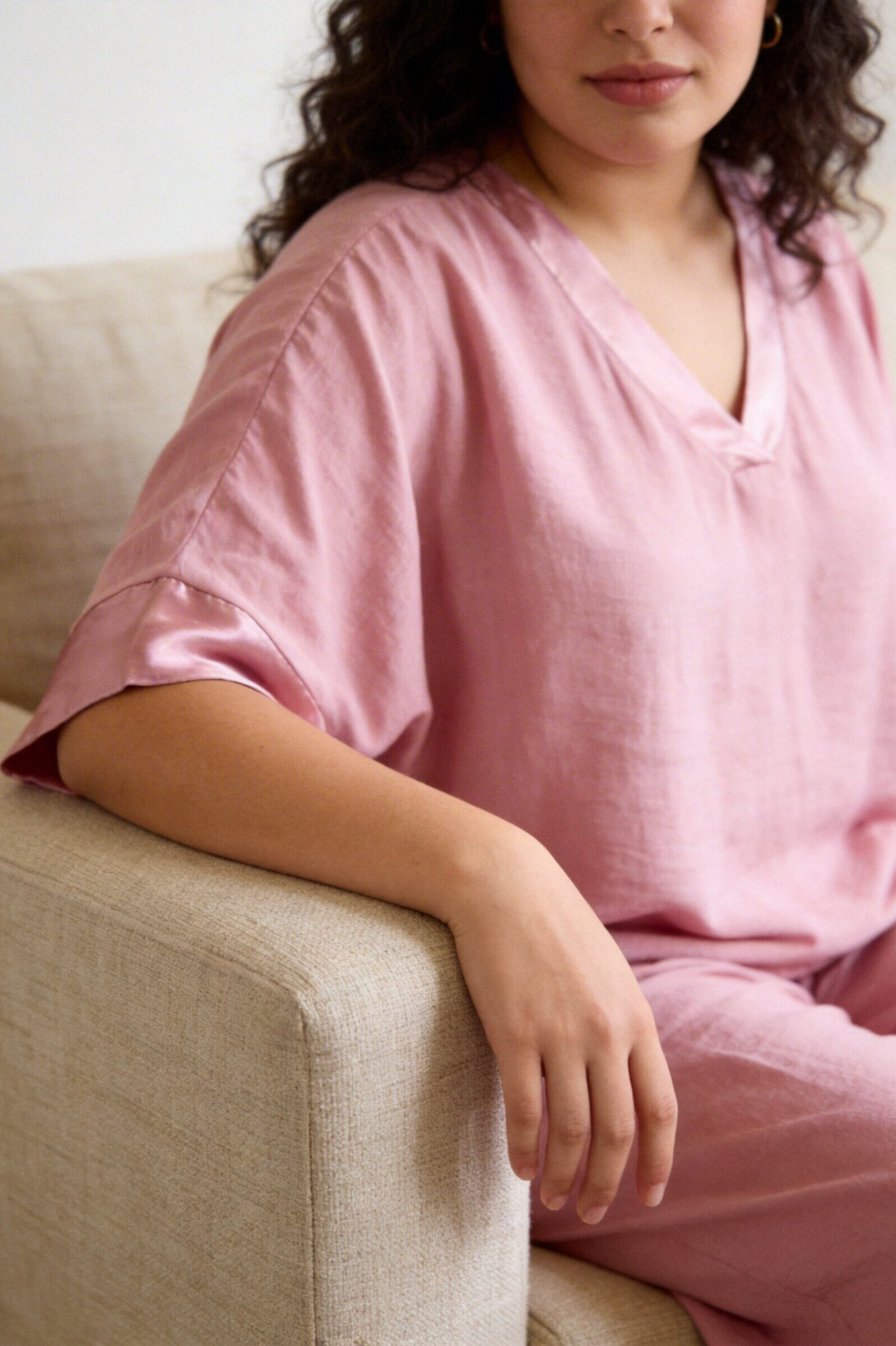 Tejido fluido. Camiseta oversize. Pantalón recto. Talle alto. Cintura elástica. Tira decorativa. Disponible en varios colores.