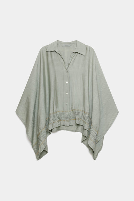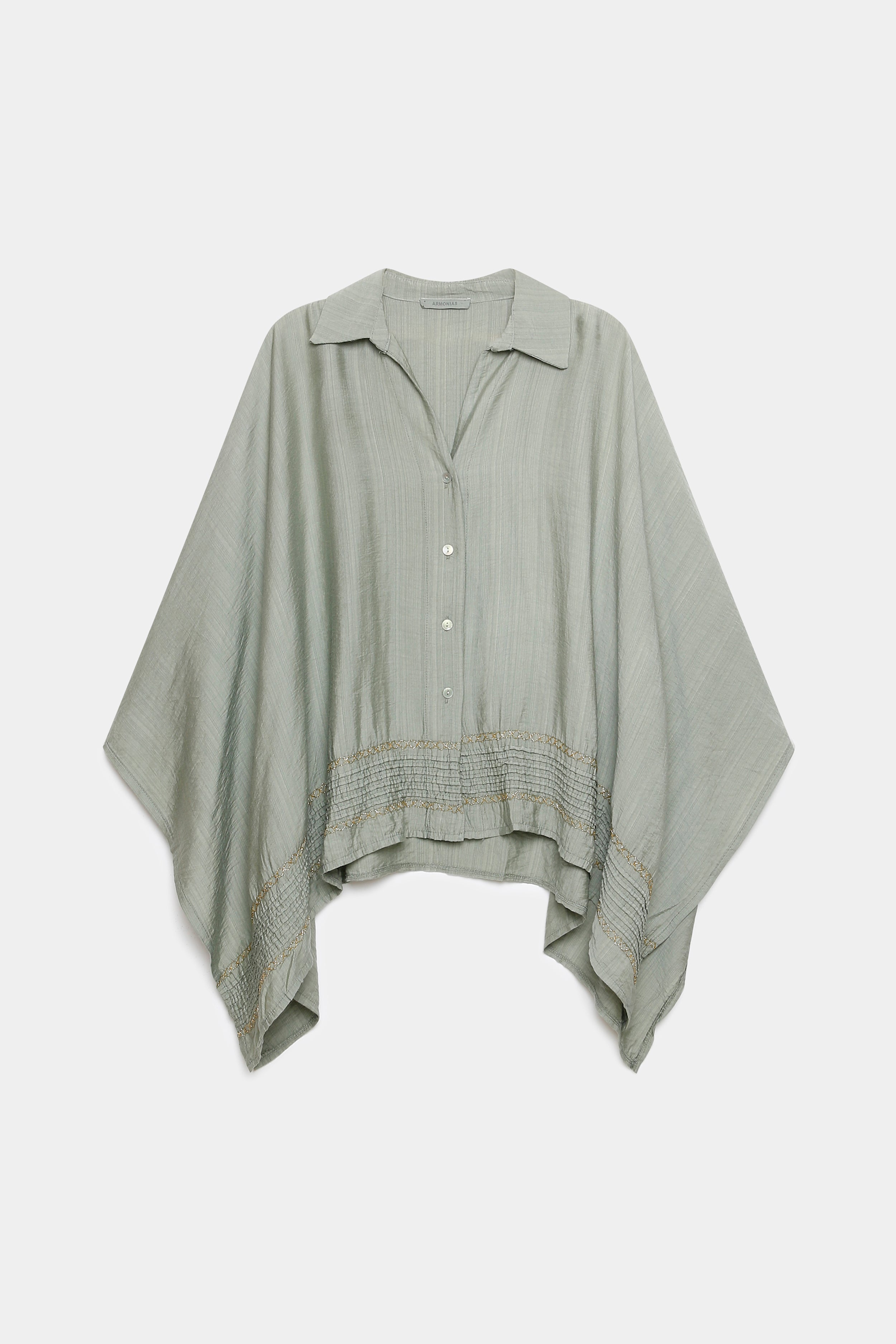 Tejido fino y fluido. Manga corta. Cierre botones. Cuello solapa. Diseño asimétrico. Desde una 38 hasta una 58.