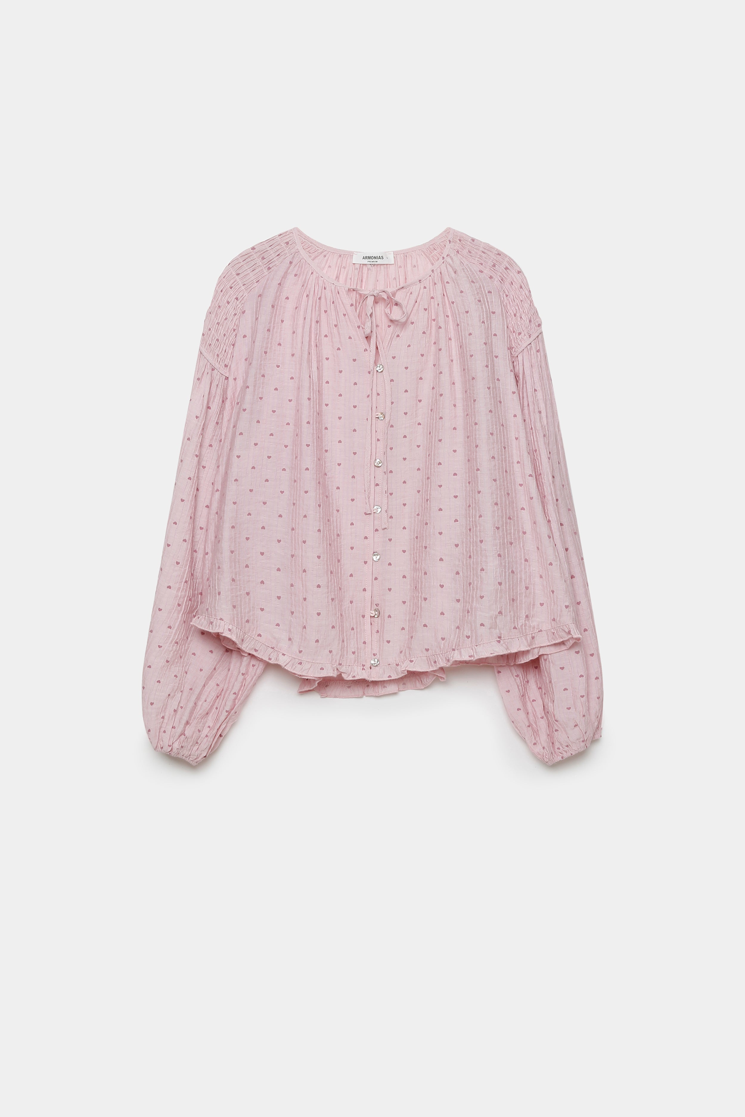 Tejido fluido. Estampado de corazones. Cuello redondo. Manga larga. Cuerpo amplio. Bajo acabado volantes. Cierre de botones y lazada.