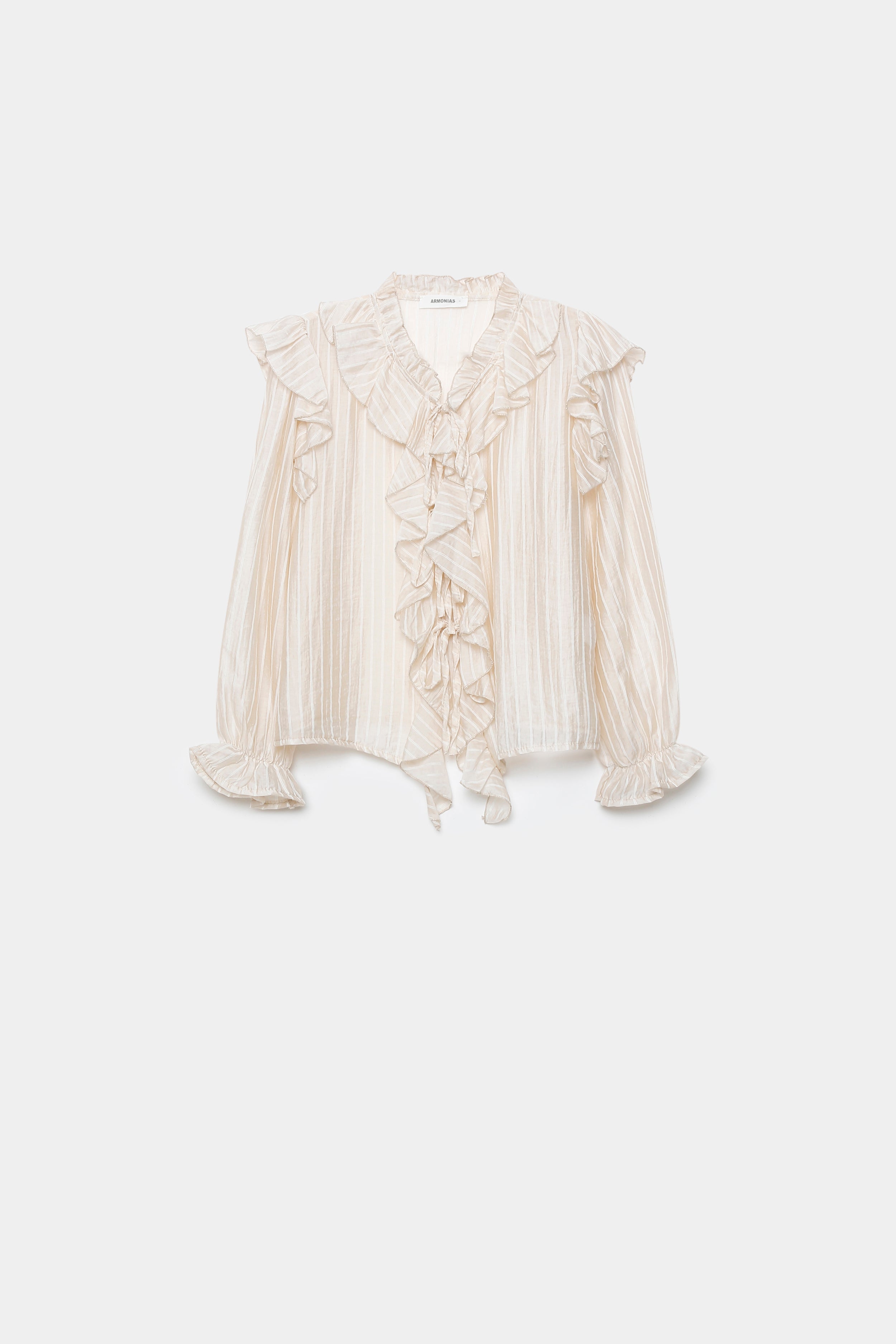 Tejido fluido. Estampado rayas. Cuello redondo. Manga larga. Cierre con botones.