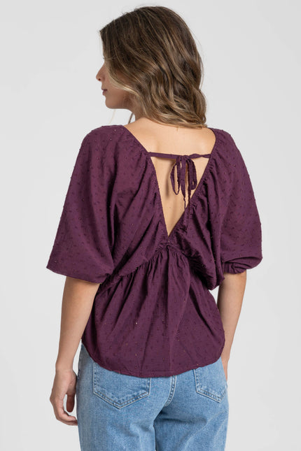 Tejido de algodón. Tejido plumeti con brillo. Escote pico. Manga corta. Lazada en la espalda.